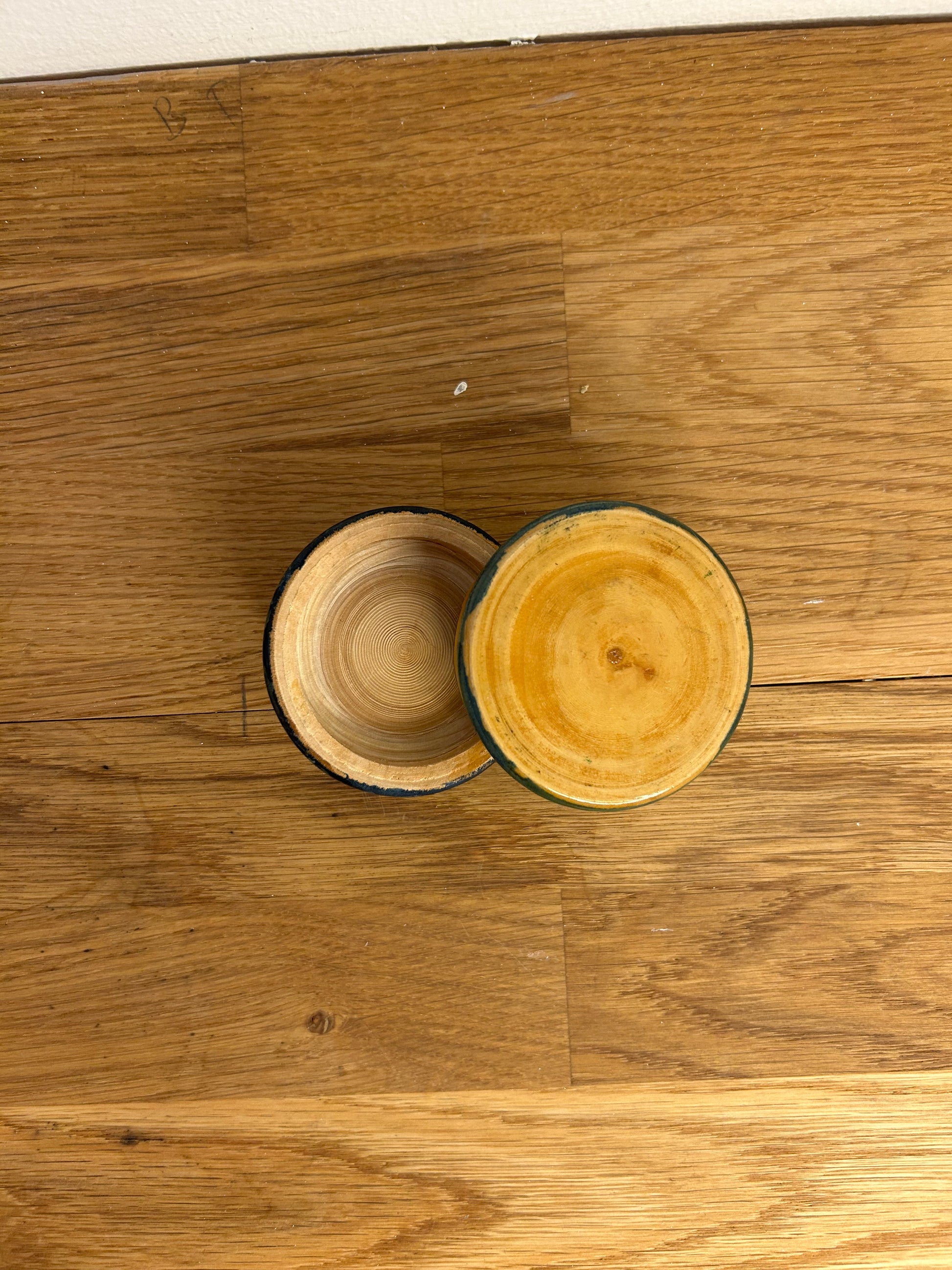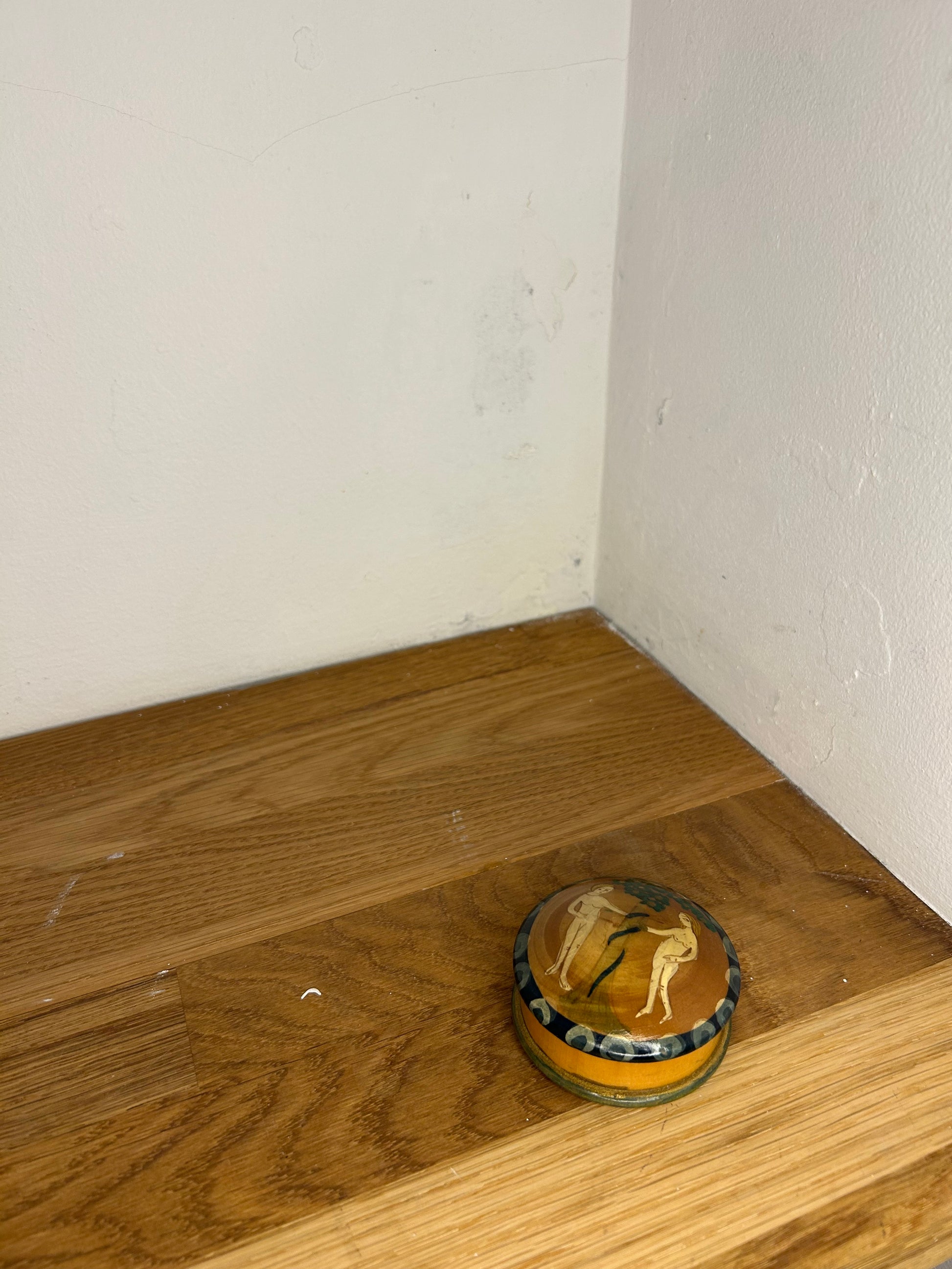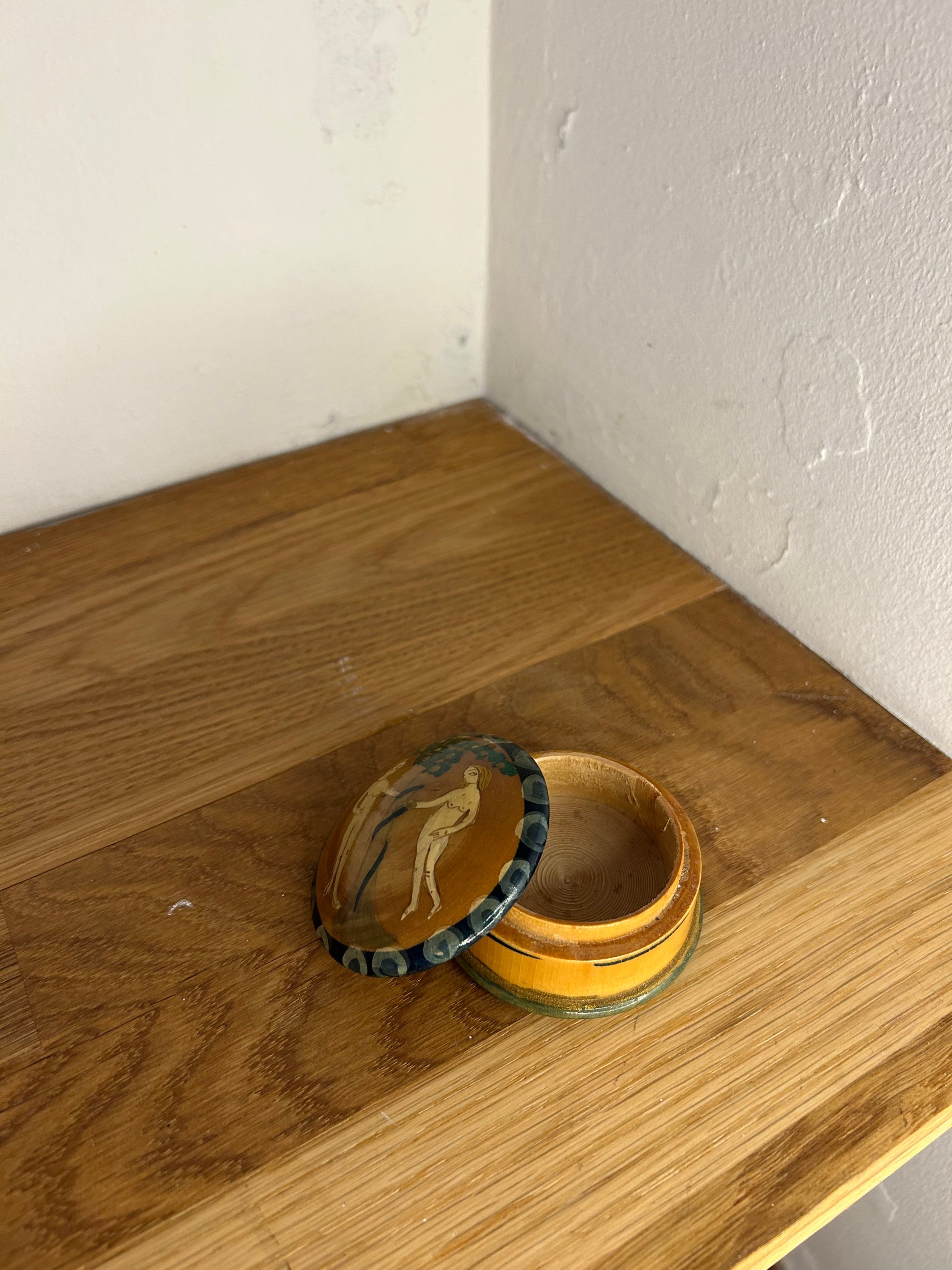Hand painted wooden vessel with Adam and Eve on the lid, small chip to the inner layer