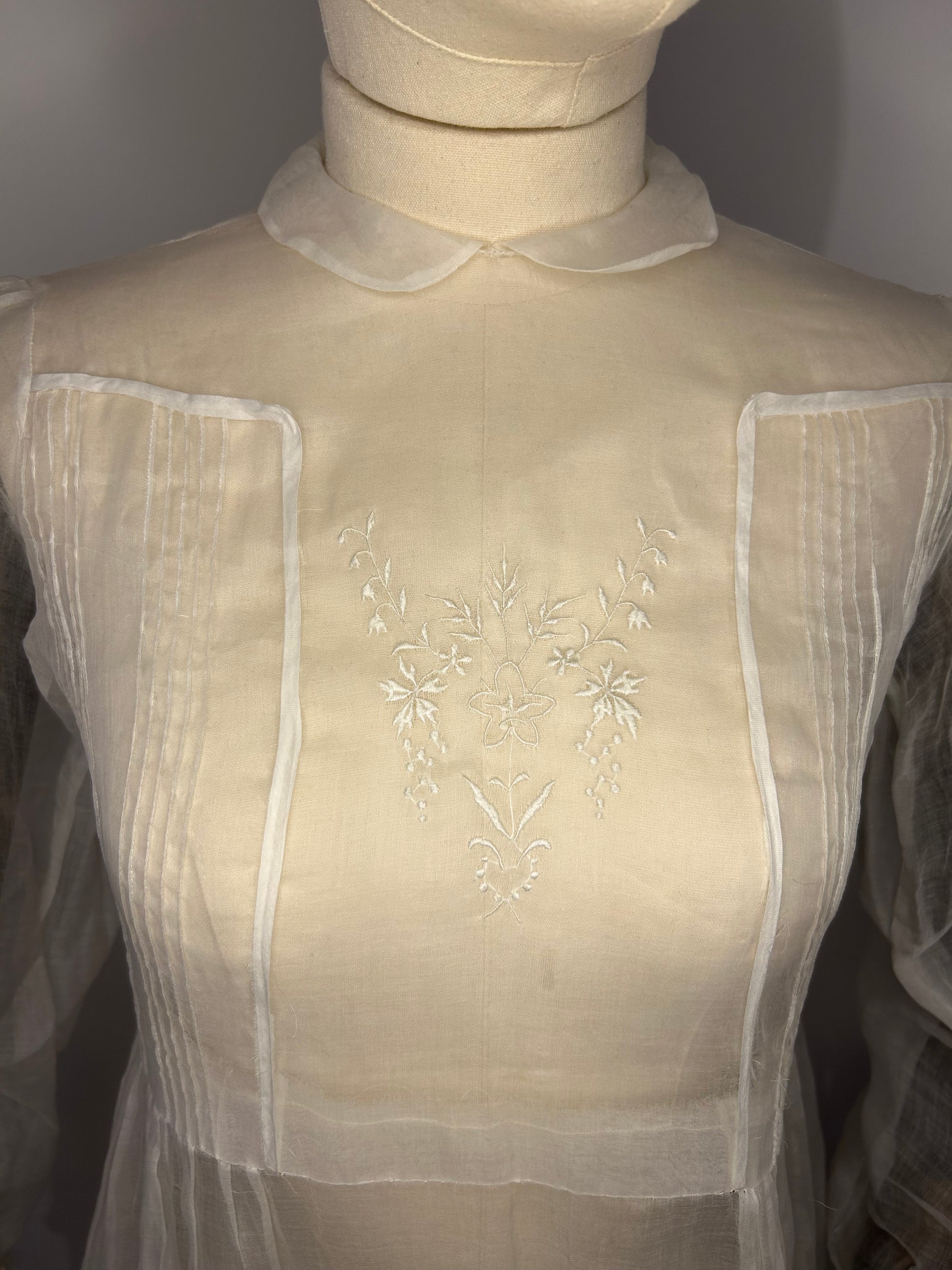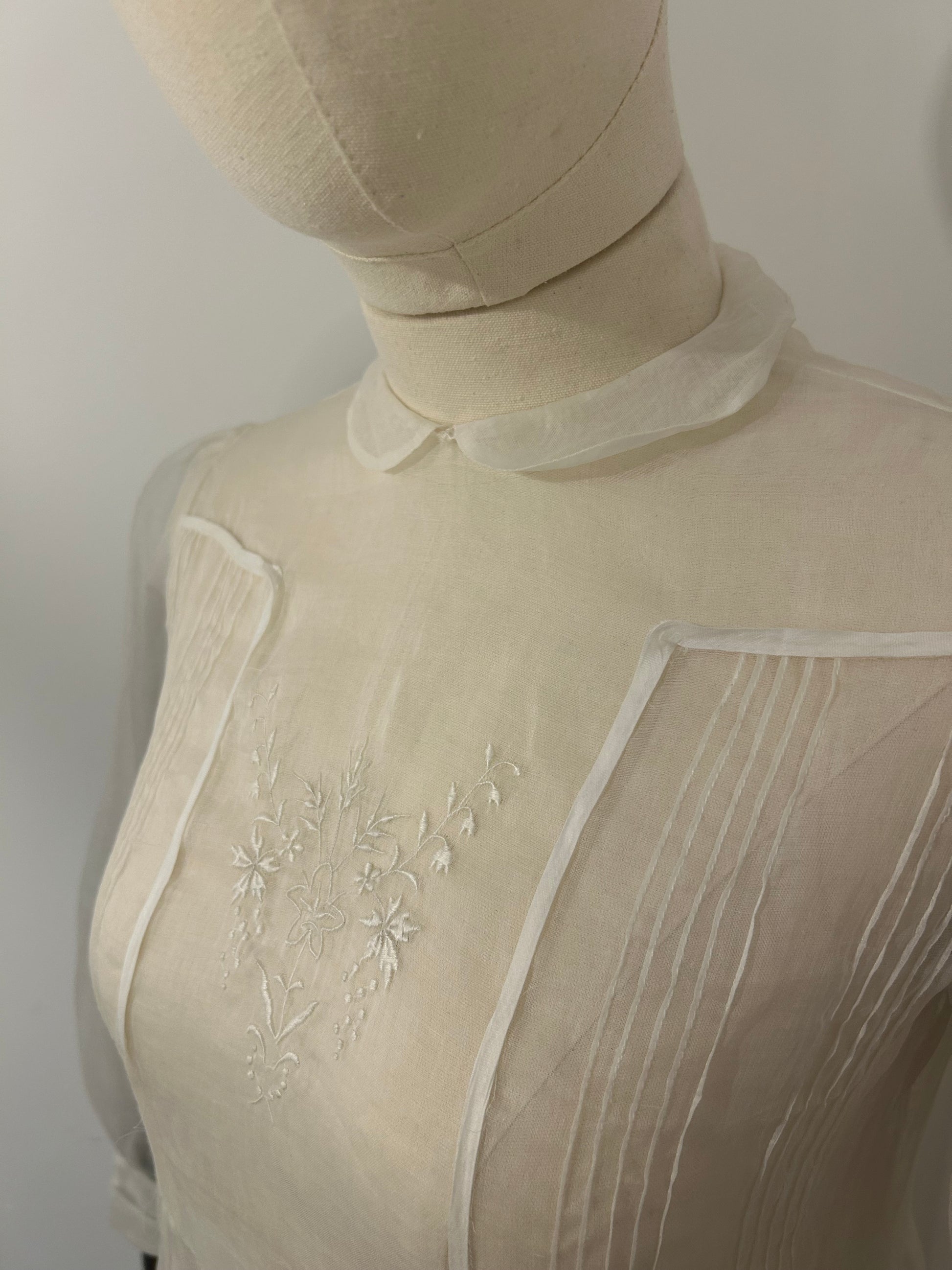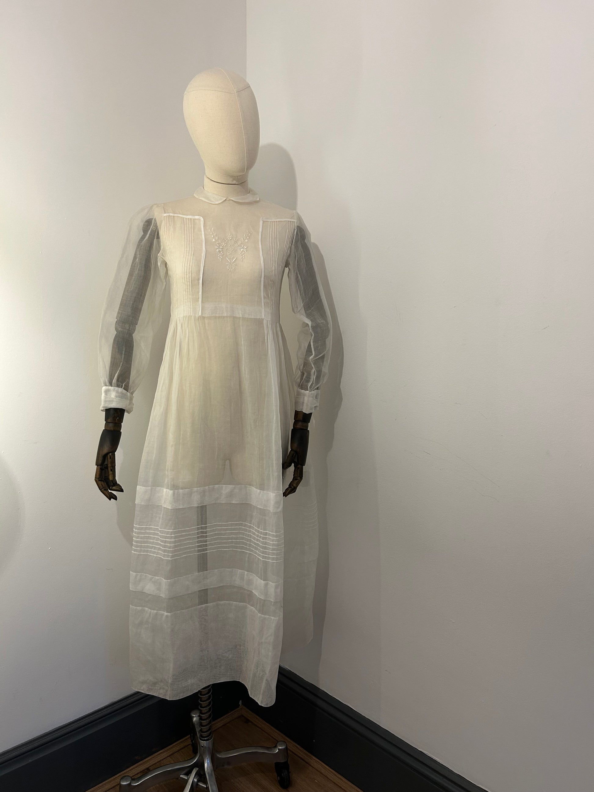 A real antique gauze sheer nightgown with hand embroidery detail on the front. Beautiful shape. A button closure back. A few marks and issues as to be expected with an item of this age, all photographed.