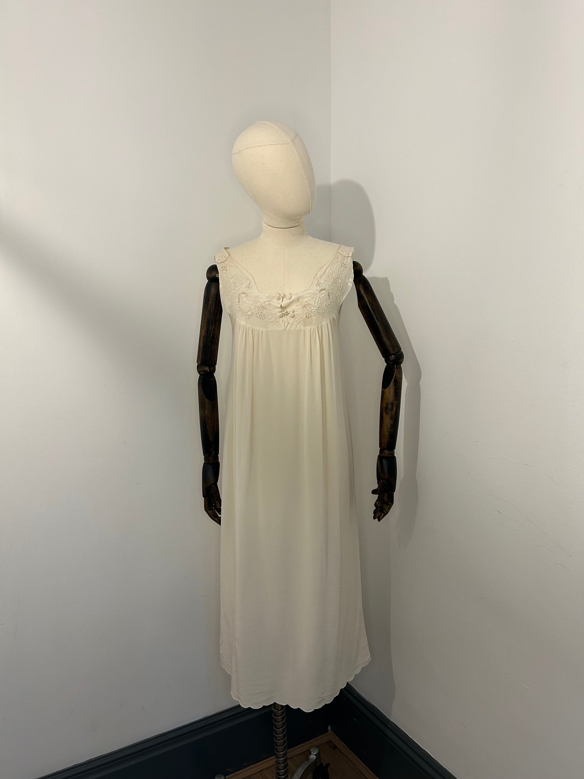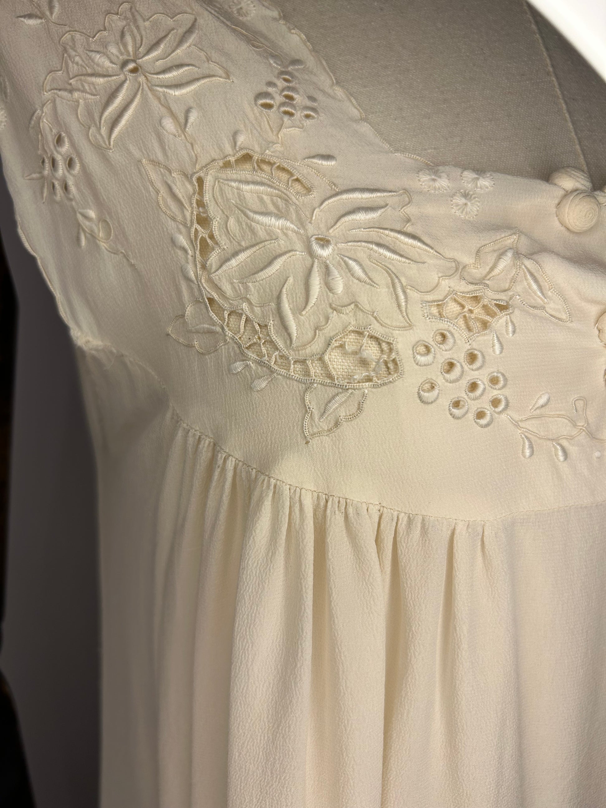 Cream pure silk nightgown with hand embroidery details on the neckline and shoulder straps. A few signs of wear as shown in photographs; small repairs to either underarm, a slight defect to the embroidery on one side, and the back is slightly dropped from the stitching on the back.