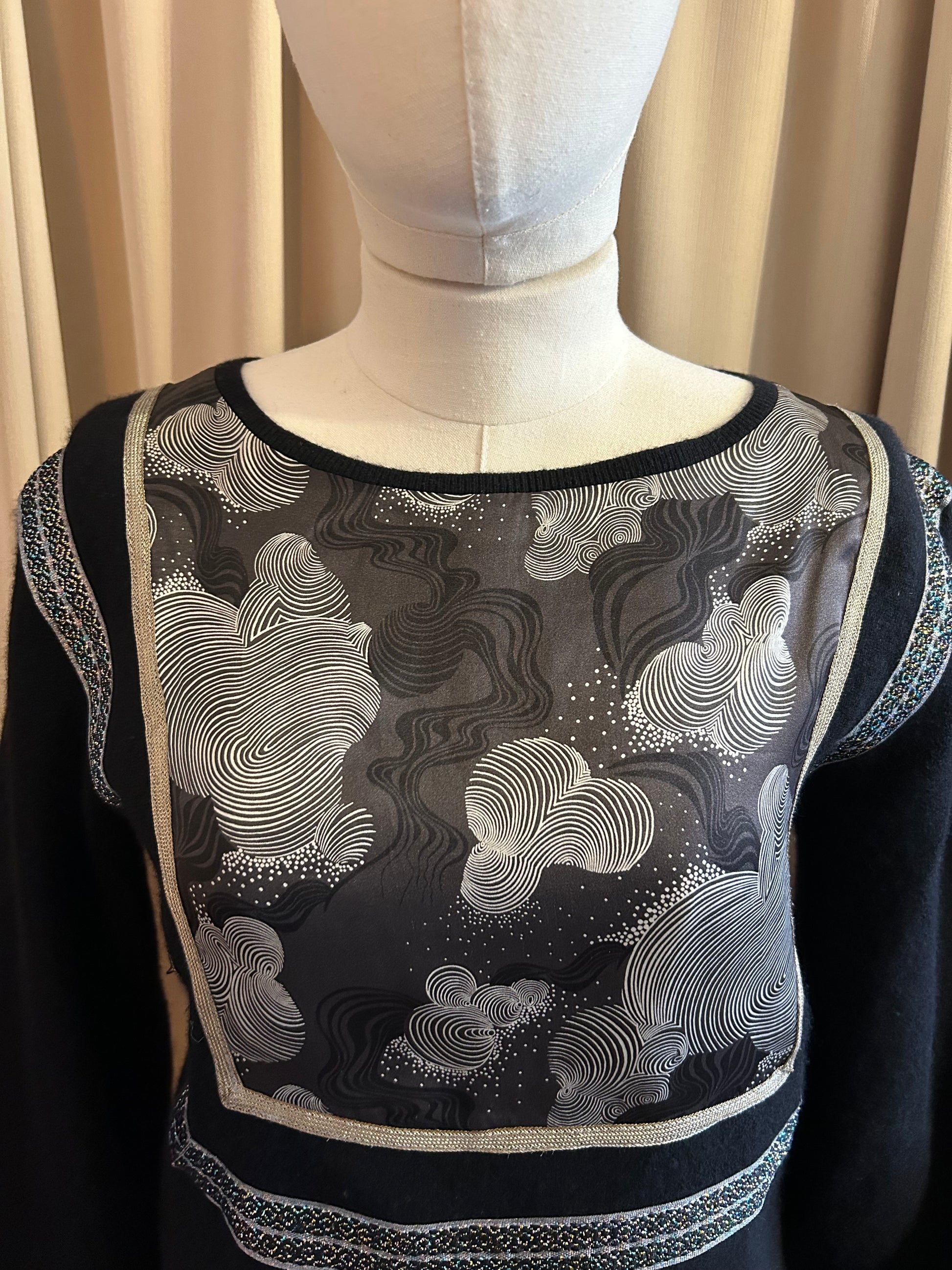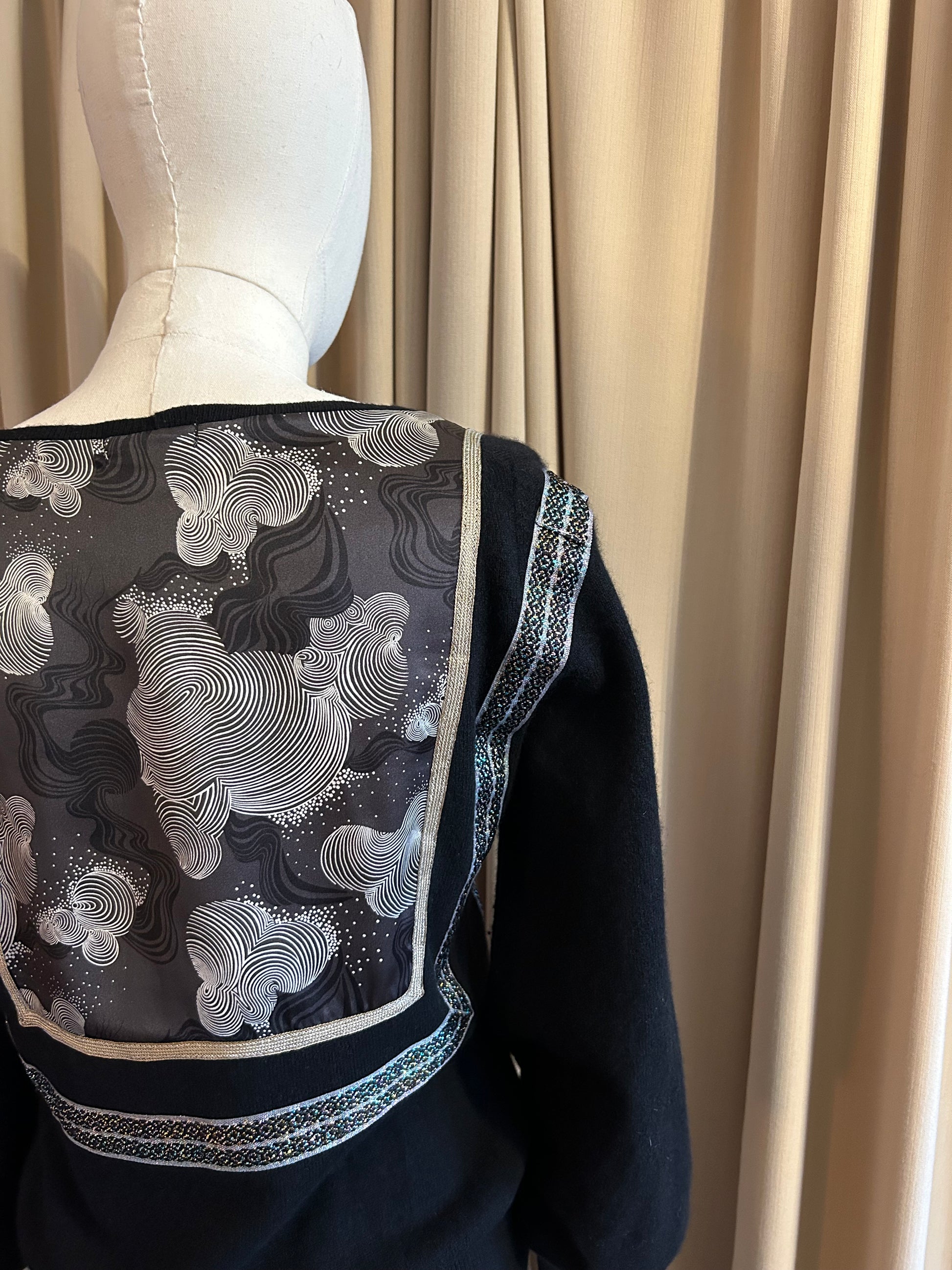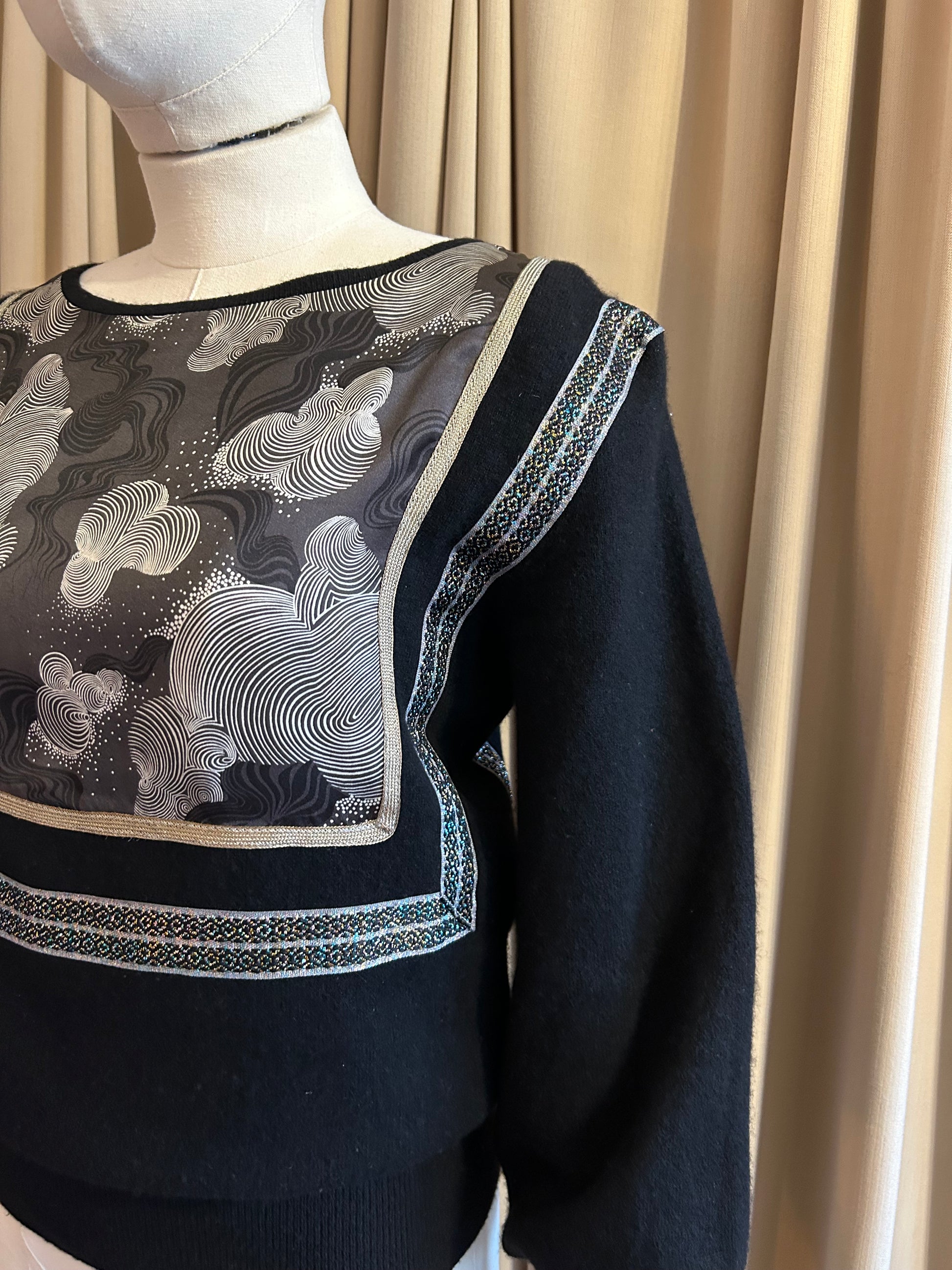 Balloon sleeve black cashmere jumper with silk panel on front and back with border details