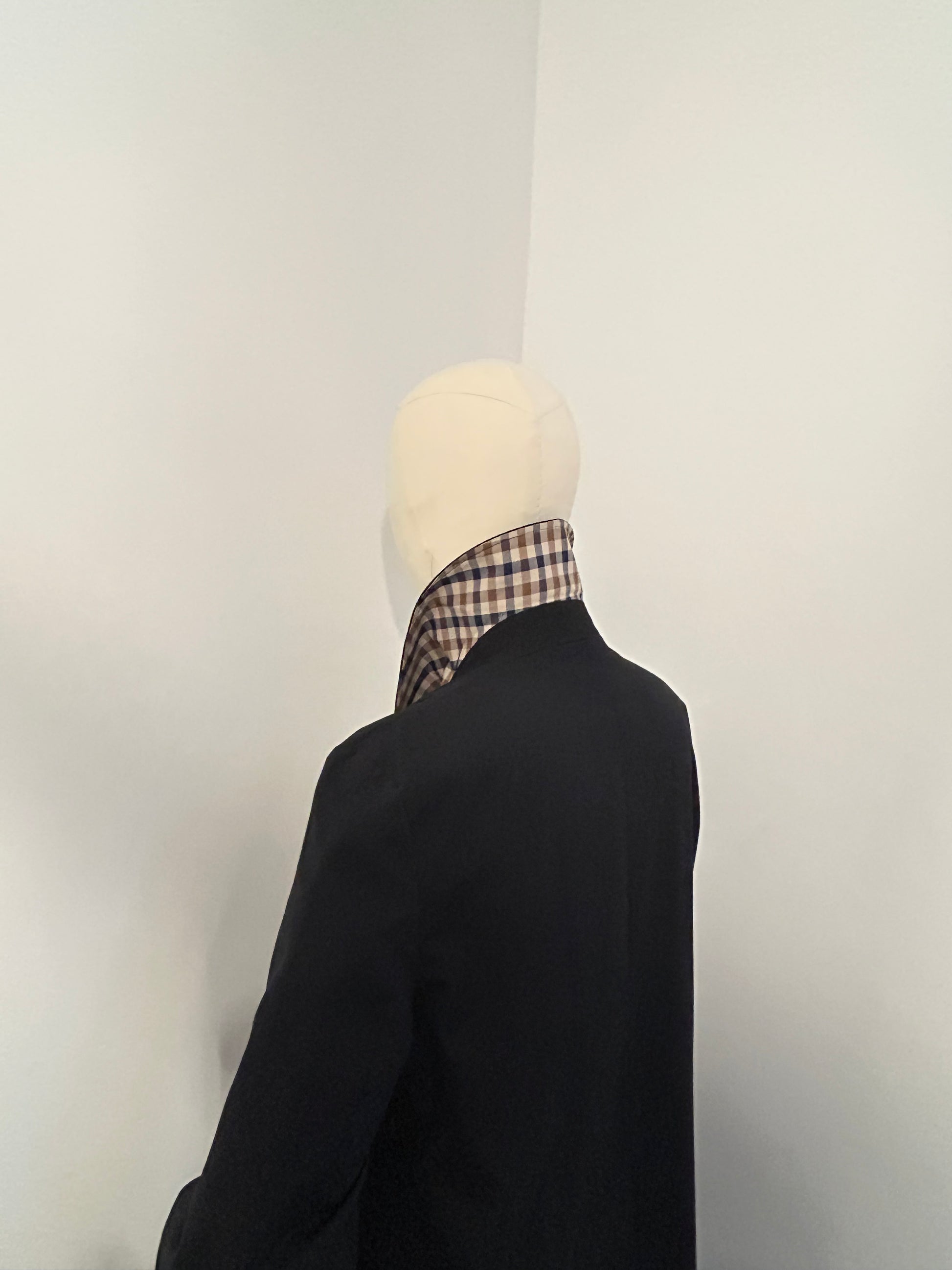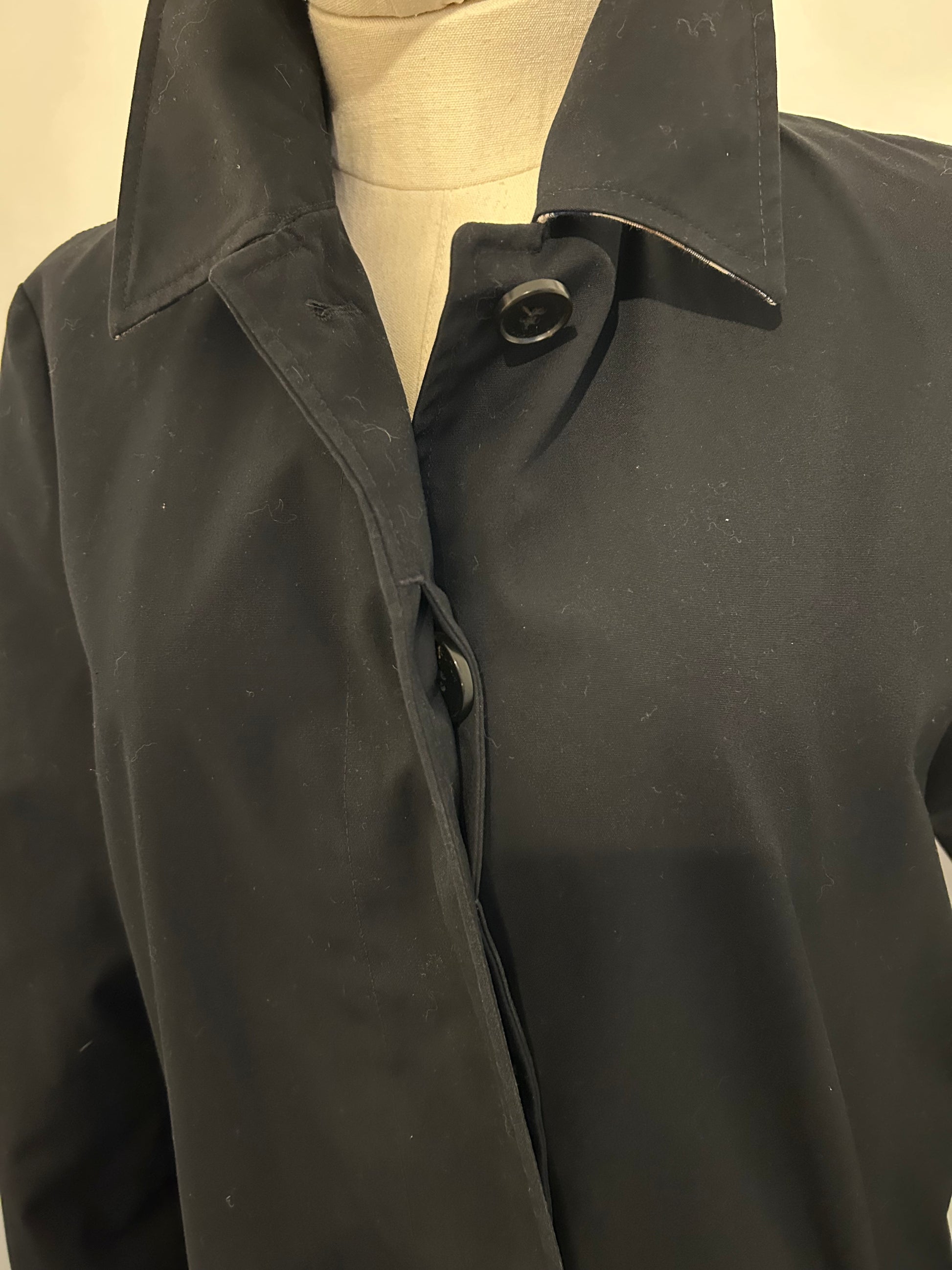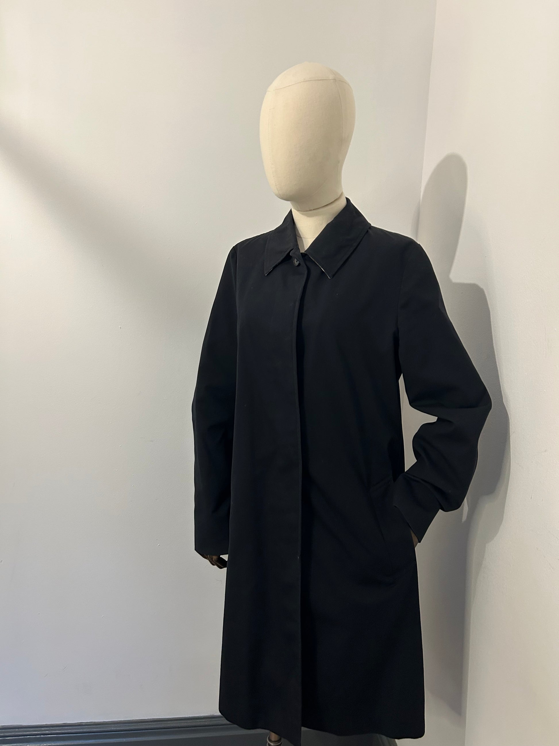 Ladies black Aquascutum trench coat with signature check on the collar underside.