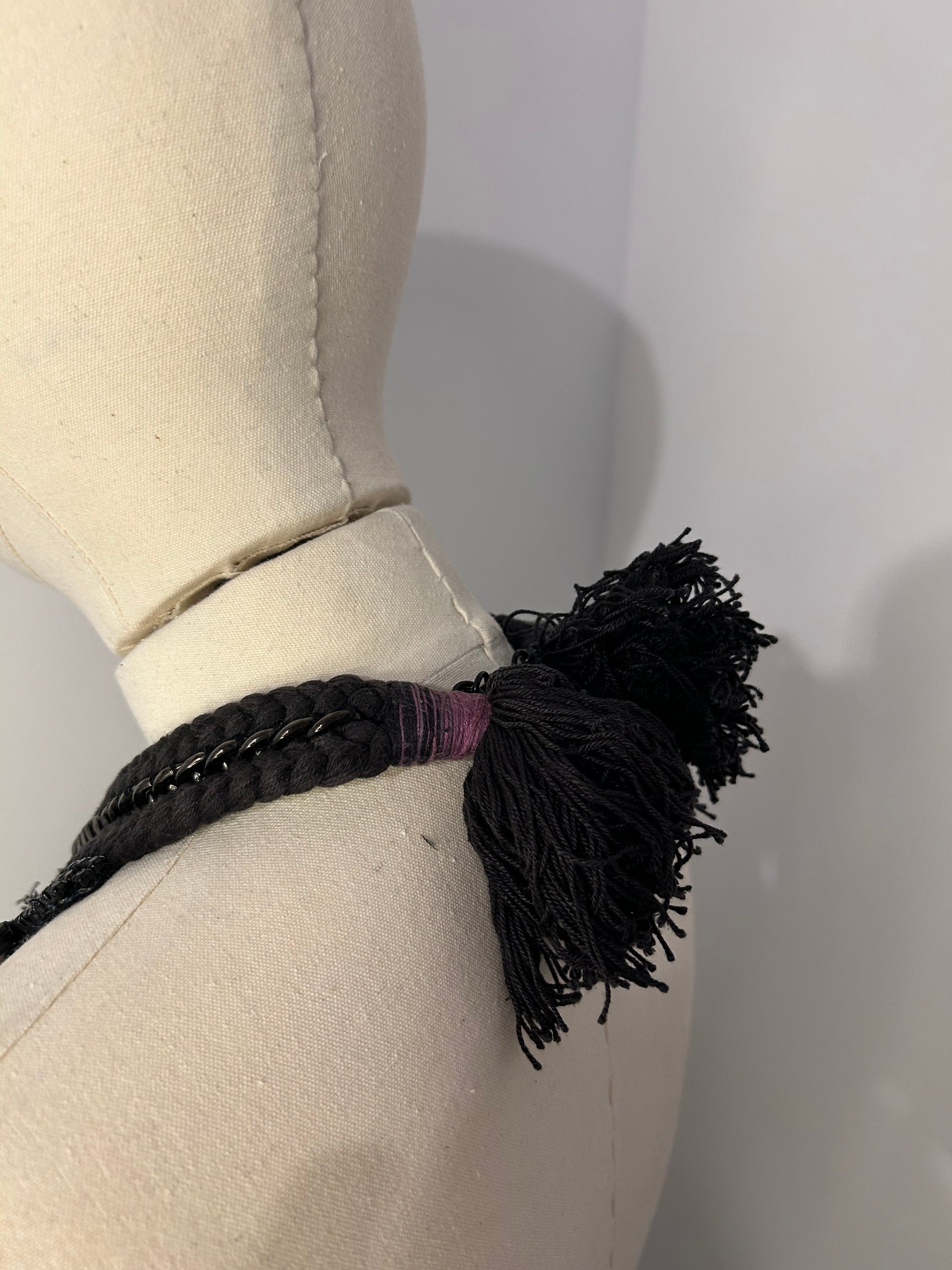 Handmade statement necklace on woven base. Sparkle embellished with studs and a tassel on the back