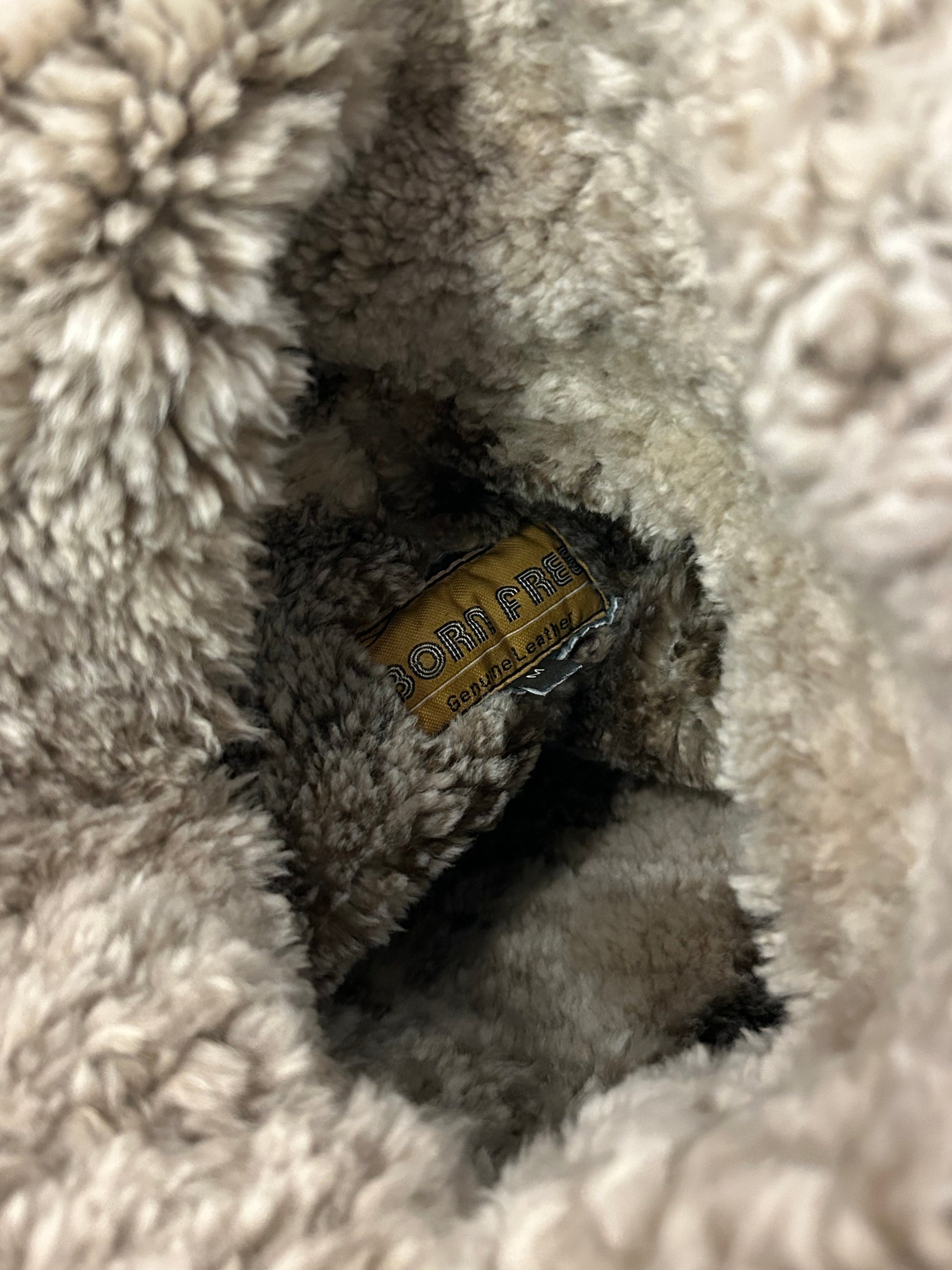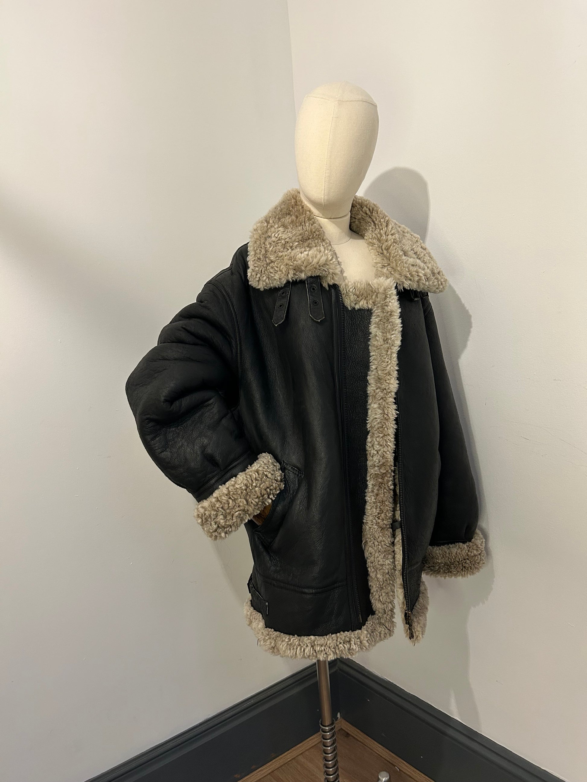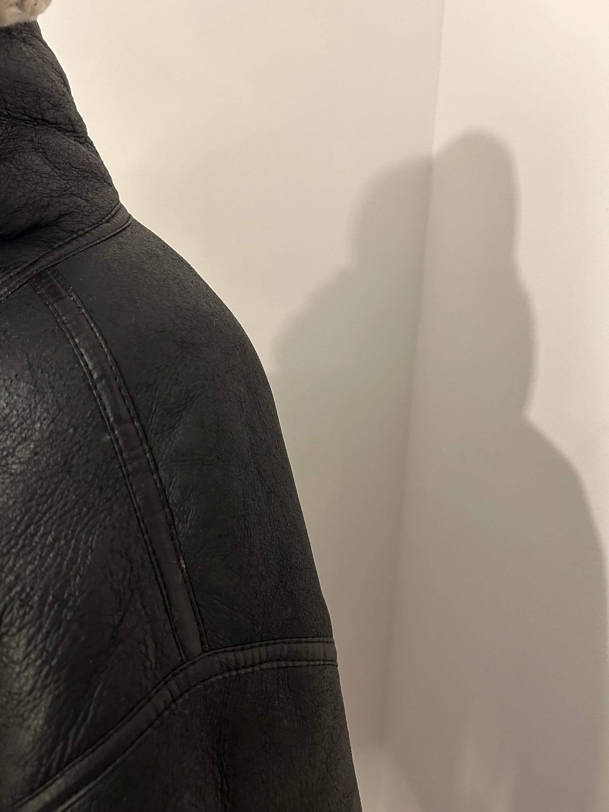 Large size sheepskin and leather flight jacket. Neck fastening and buckles by the waist. some markings on the leather