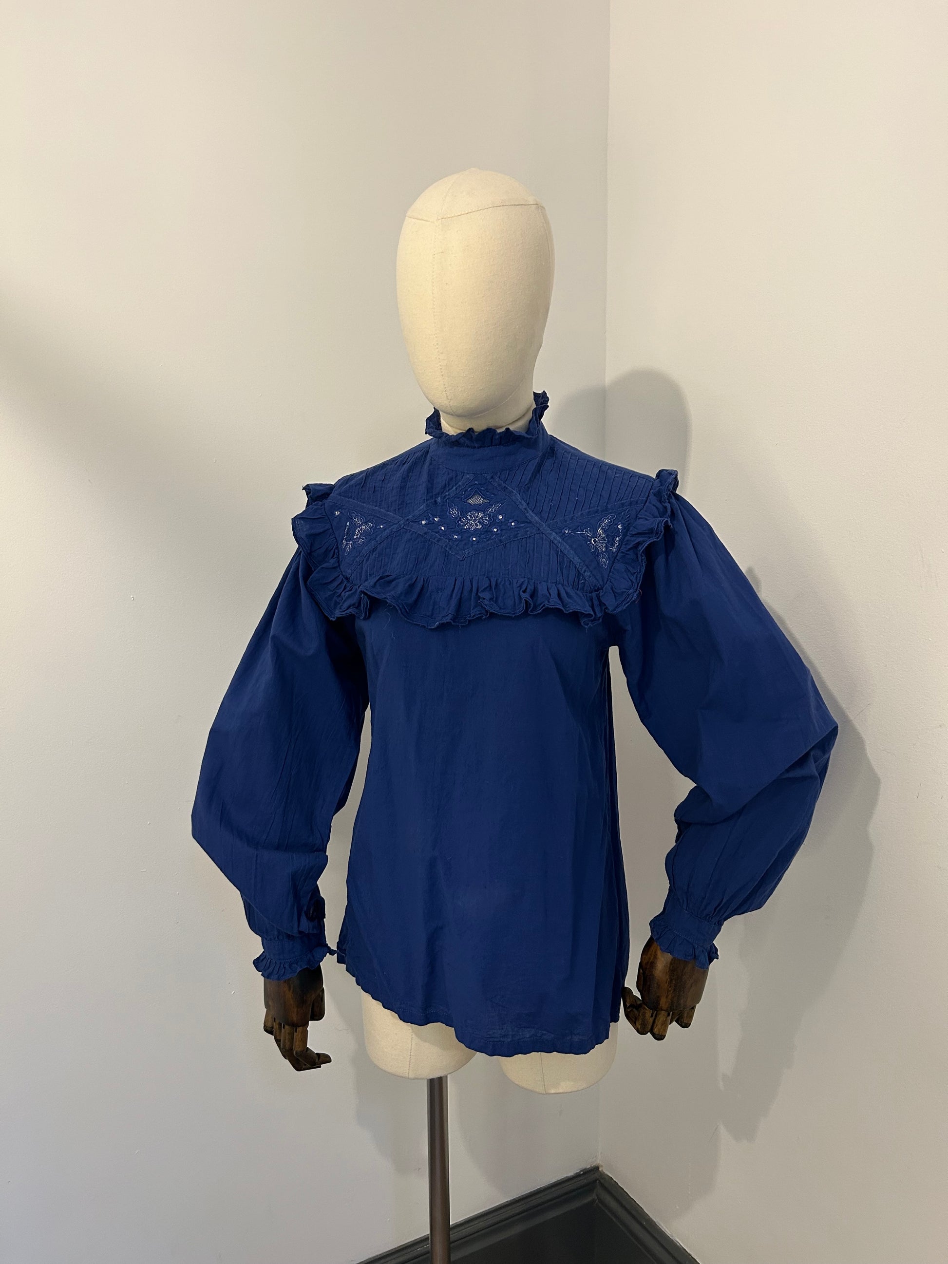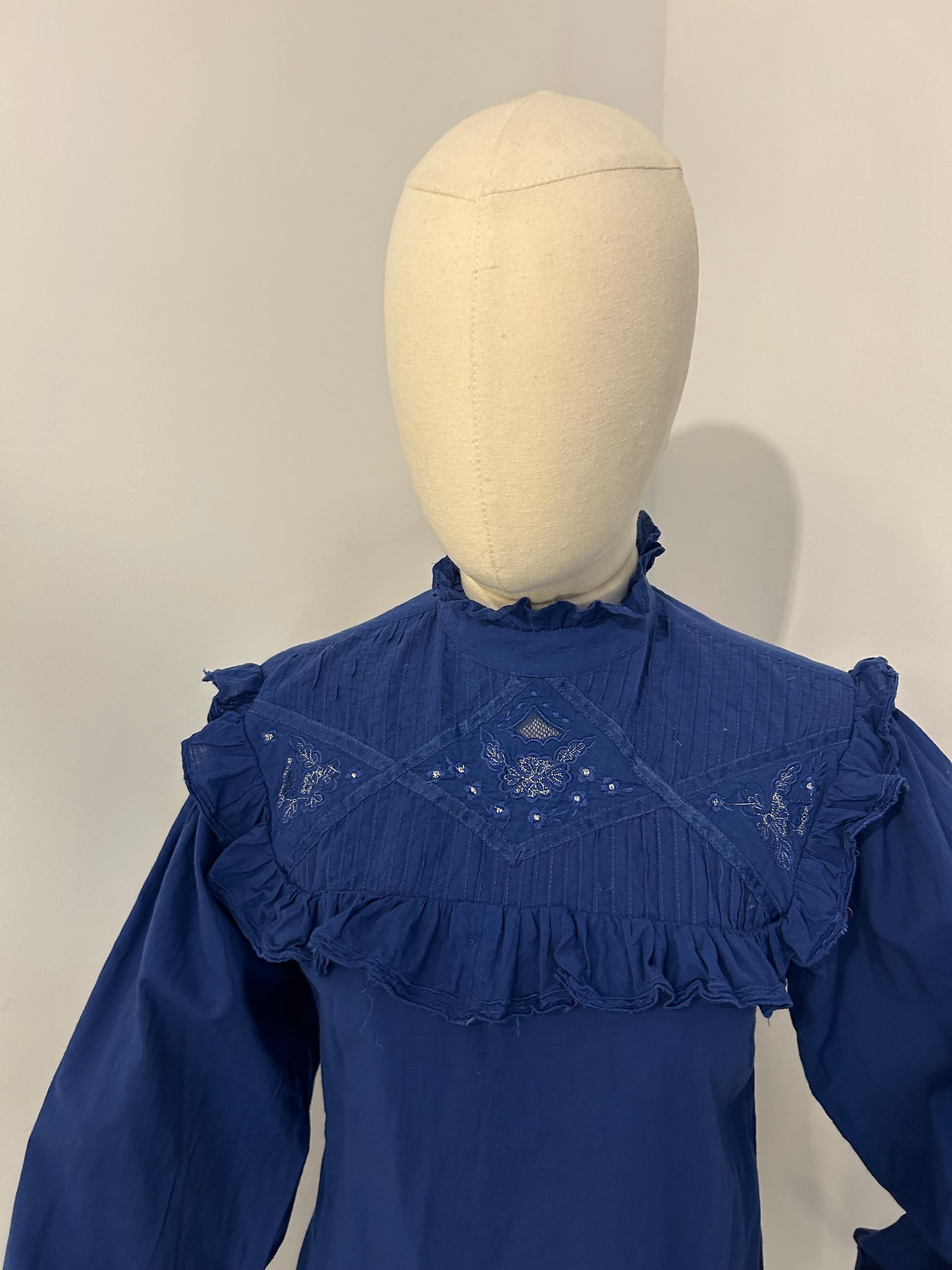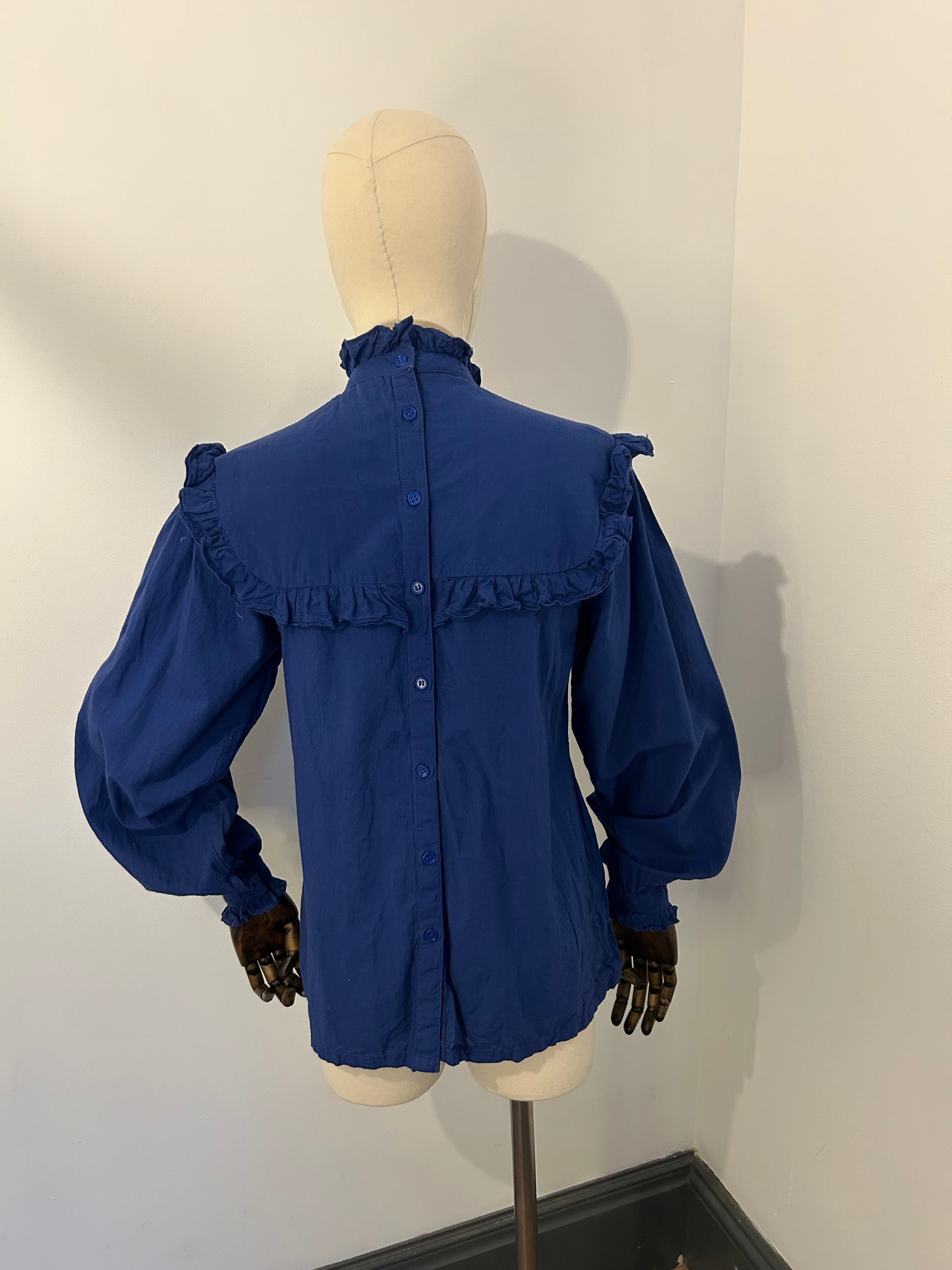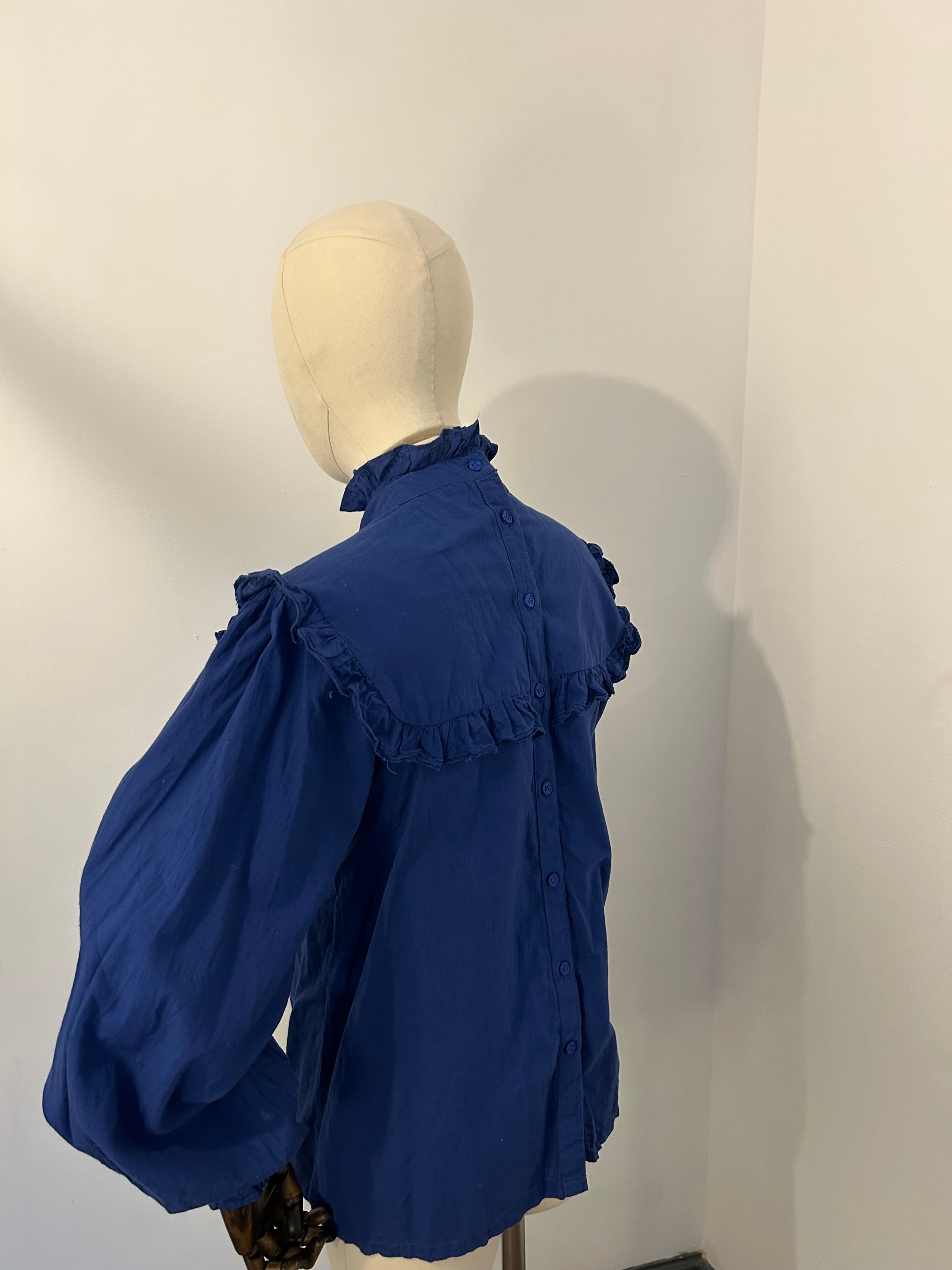 Blue cotton prairie style blouse with balloon sleeves and ruffle detail around the neck