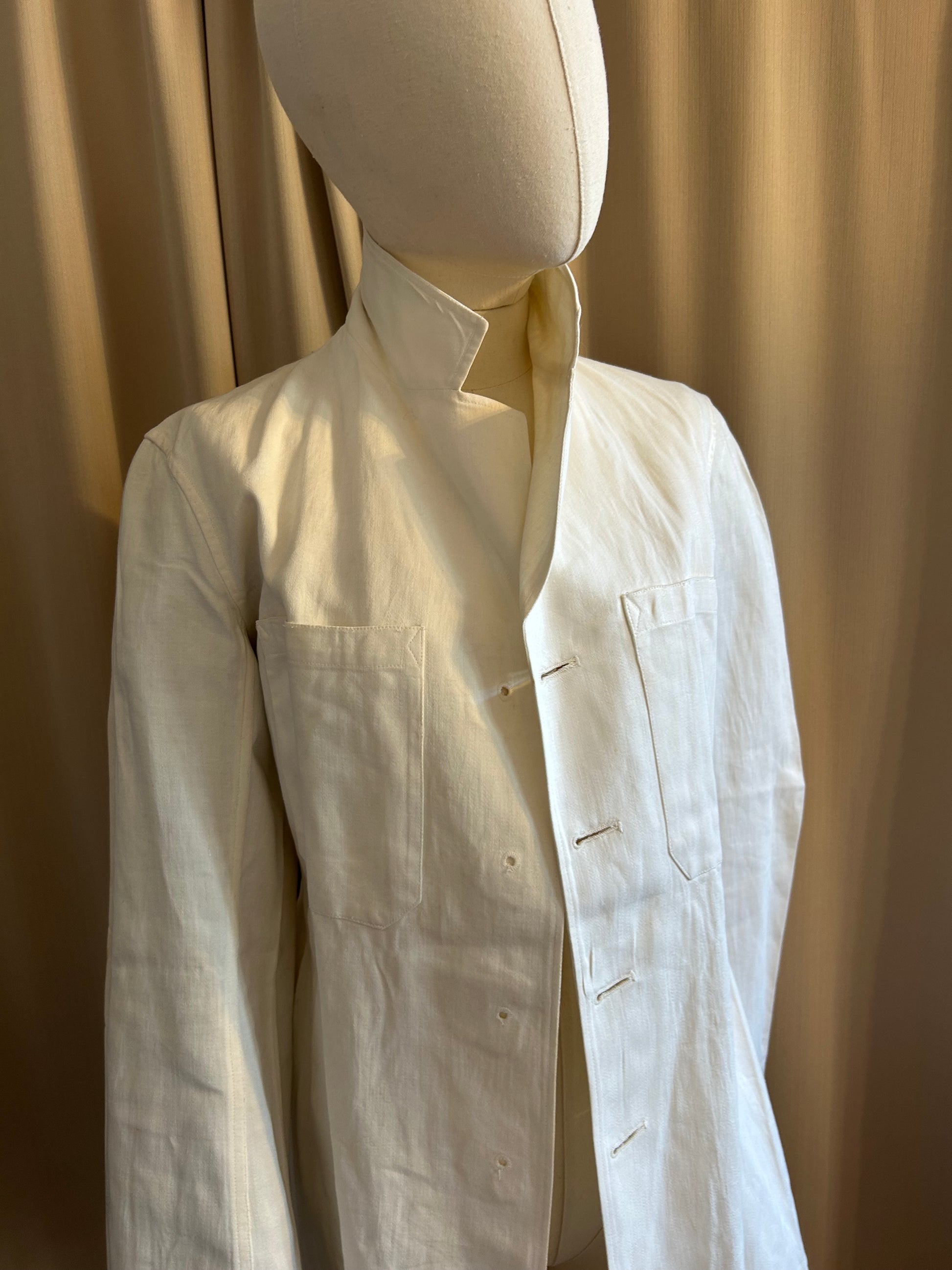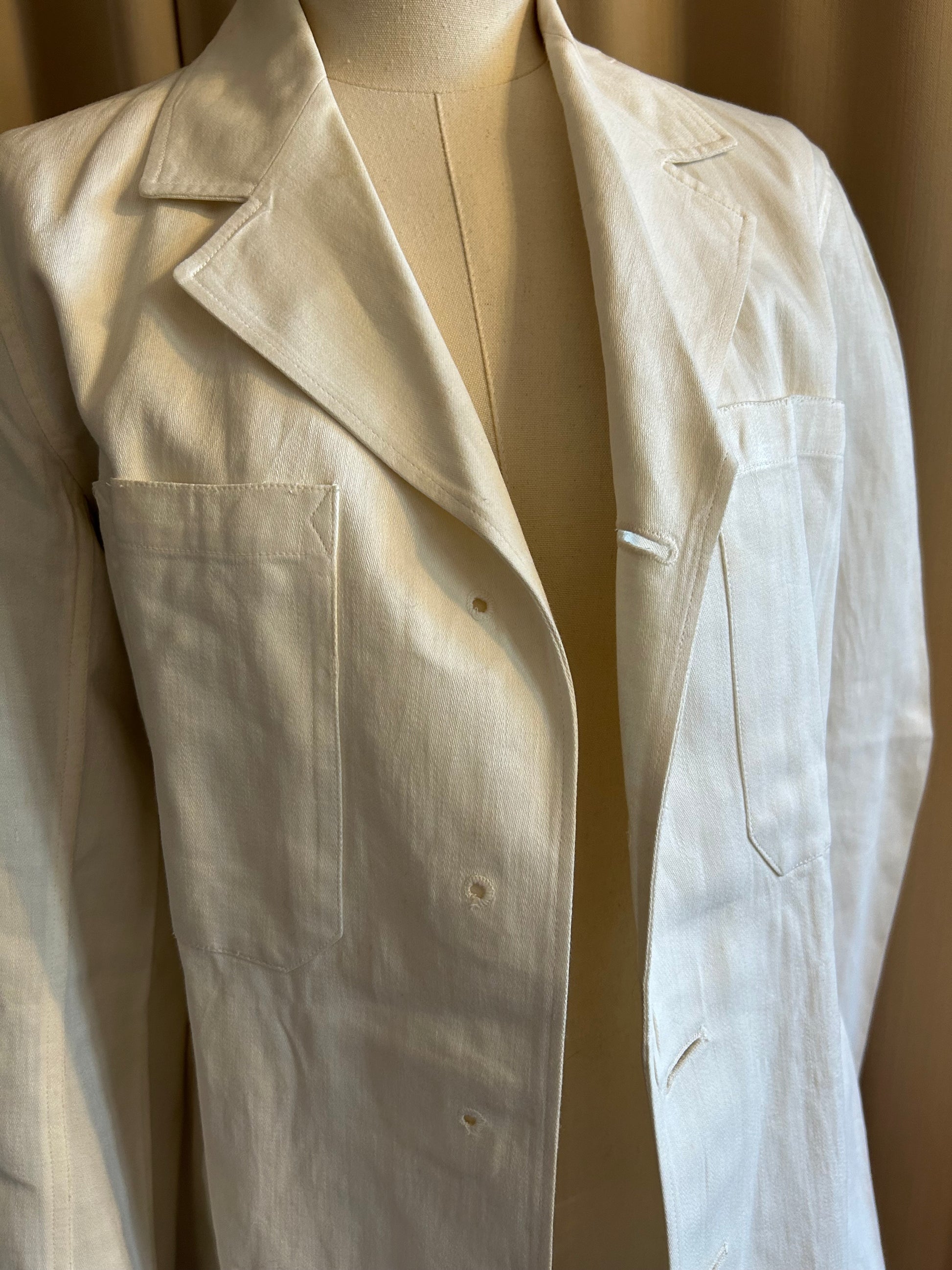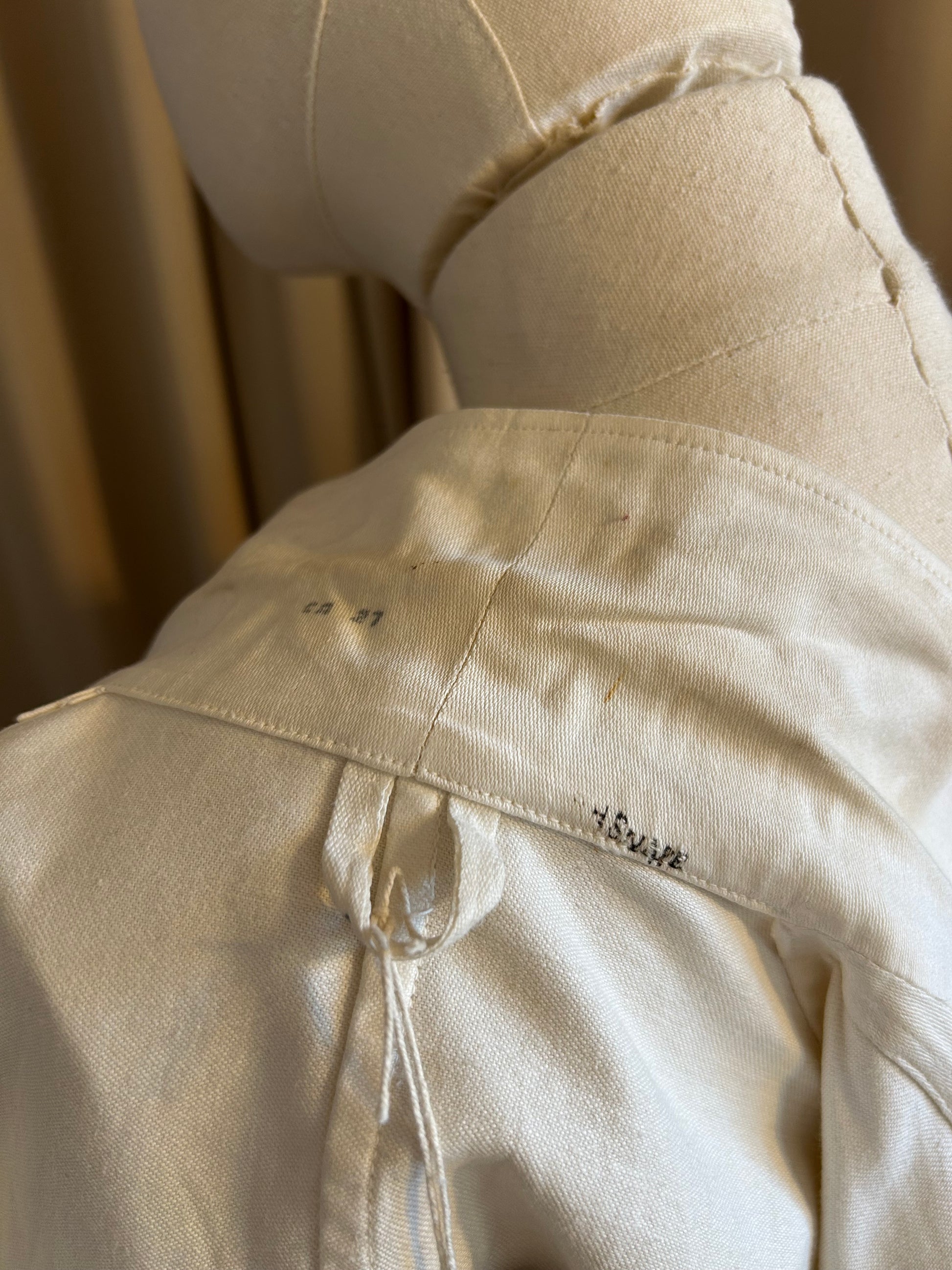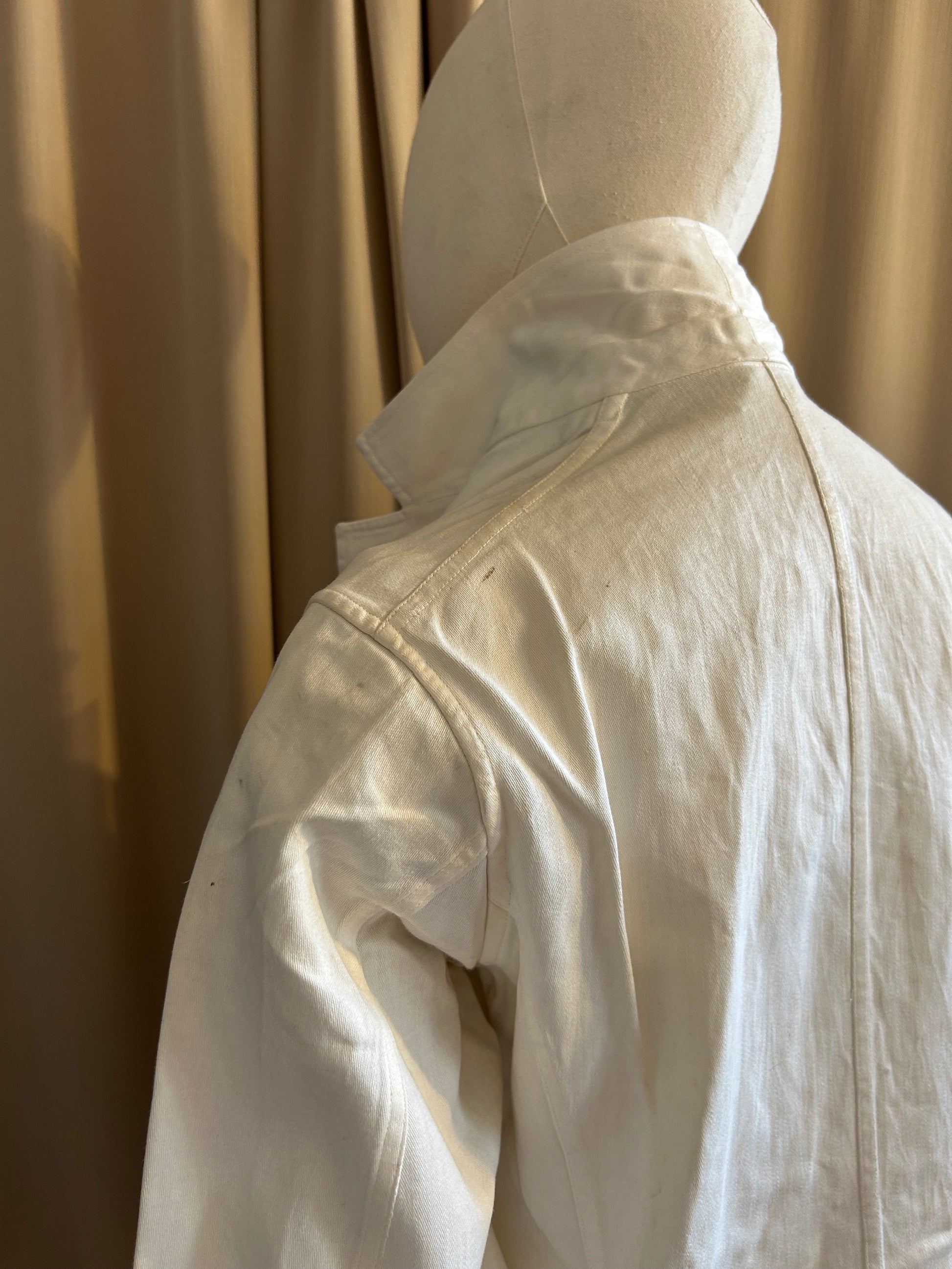 The Vole Brand CC41 white workwear jacket with holes for stud buttons. Some staining and marks as shown but adds to the character of the piece.