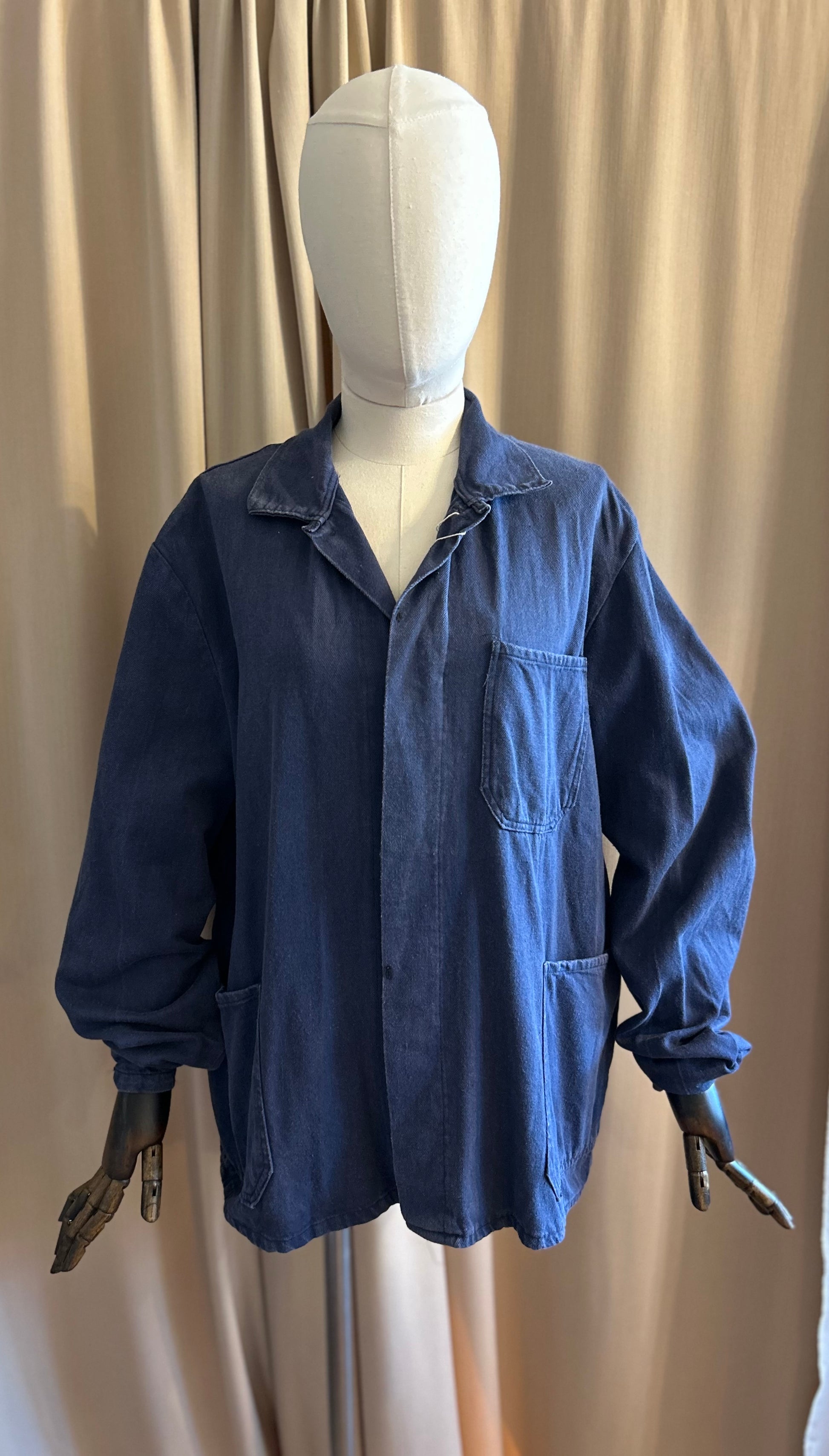 Distressed blue workwear jacket with buttons to keep the long arms from falling down and covered buttons down the front