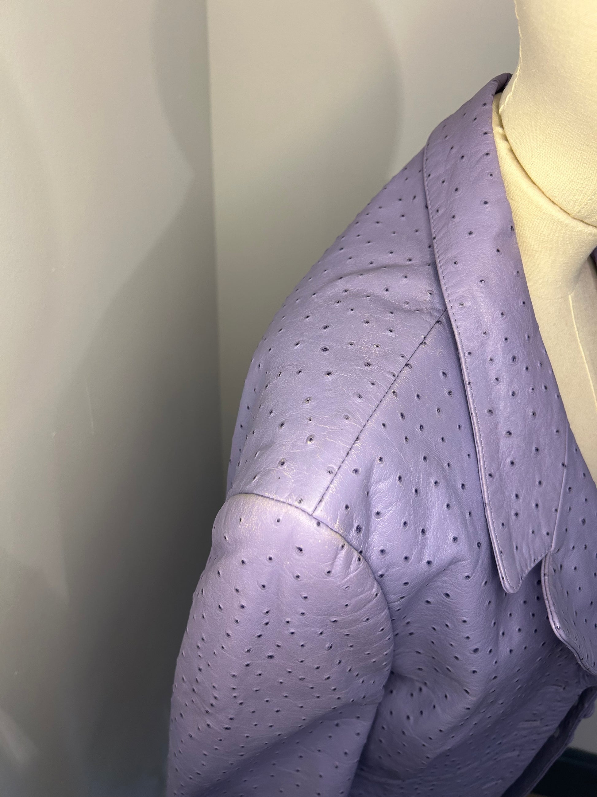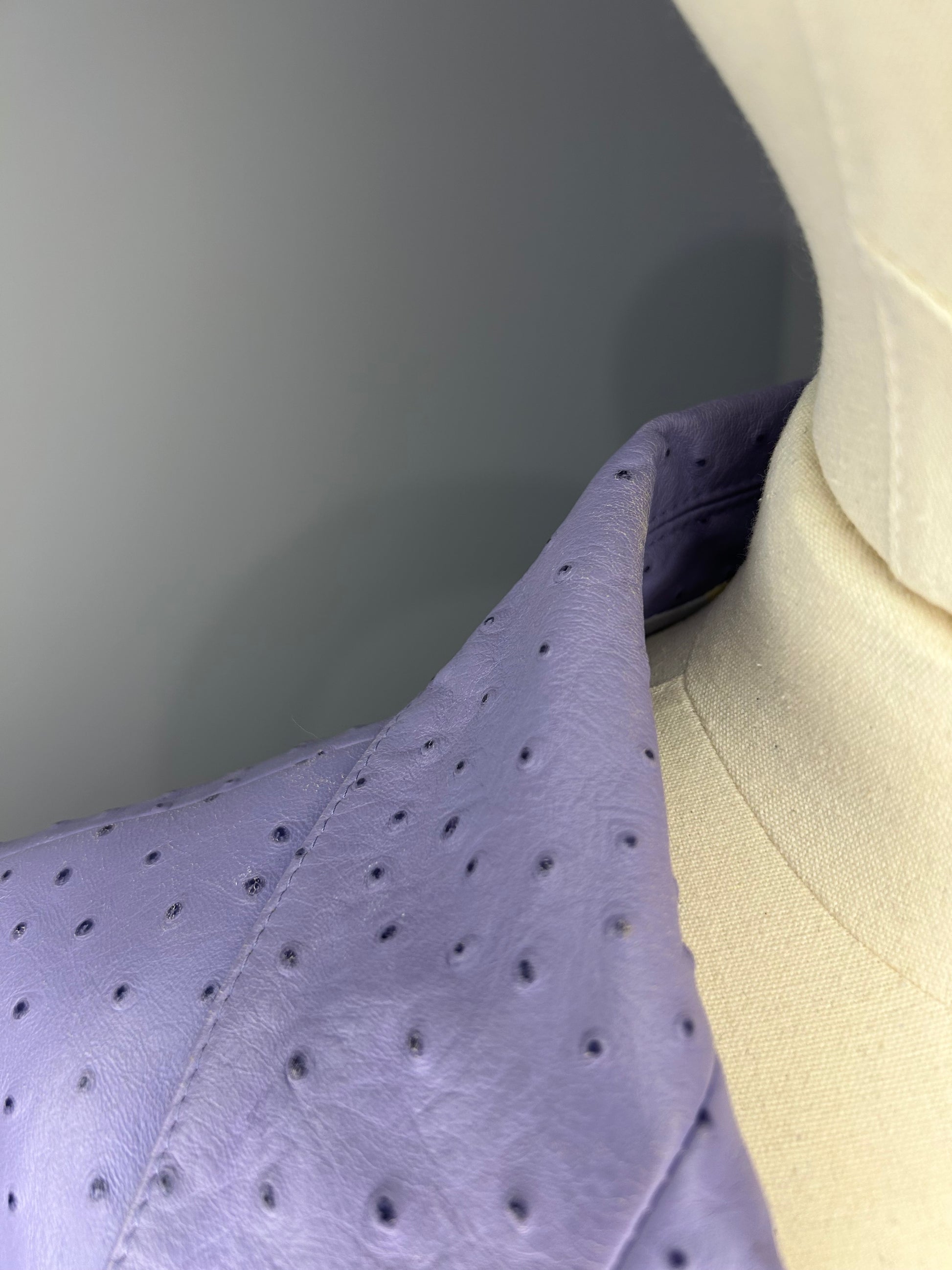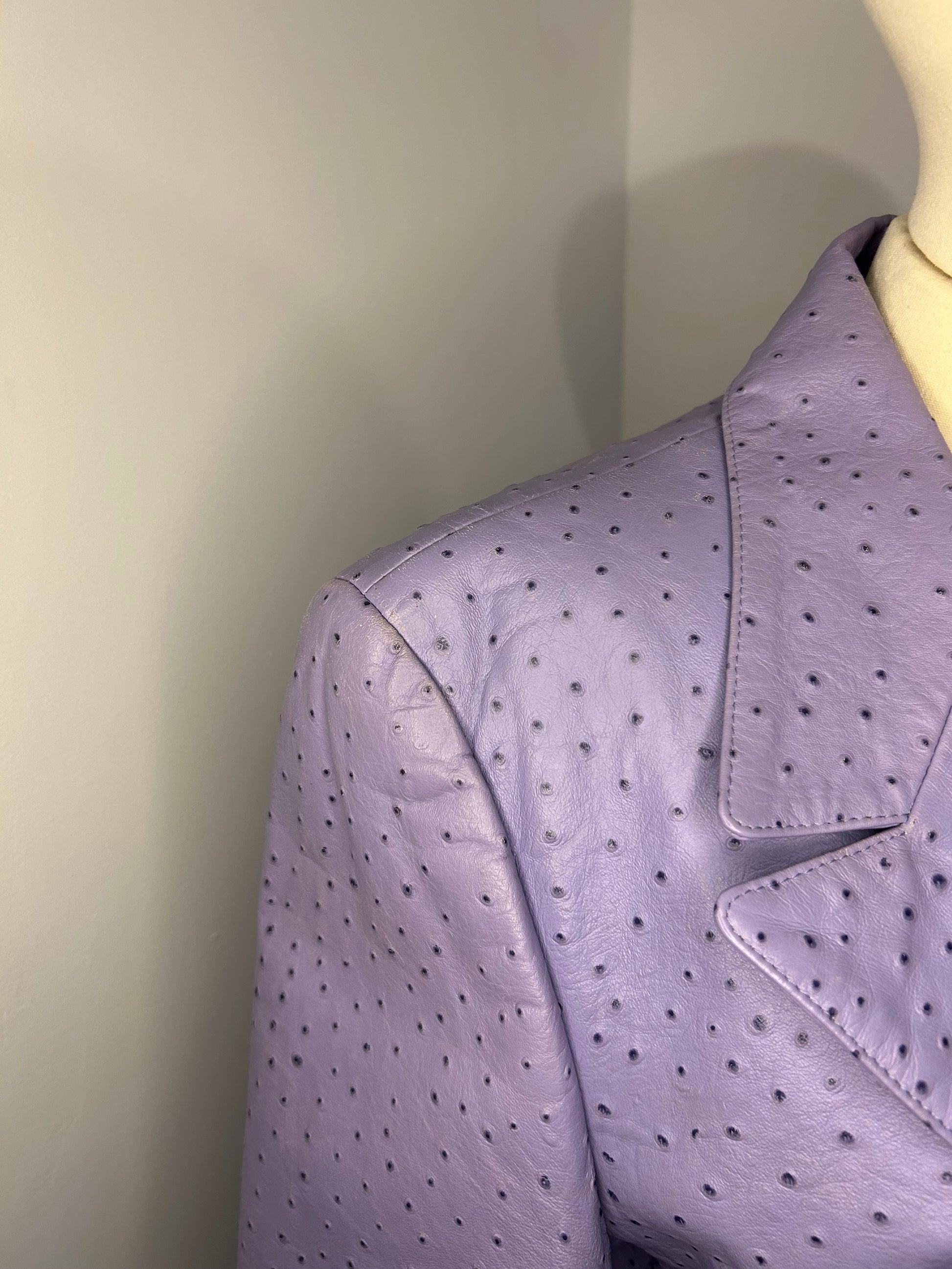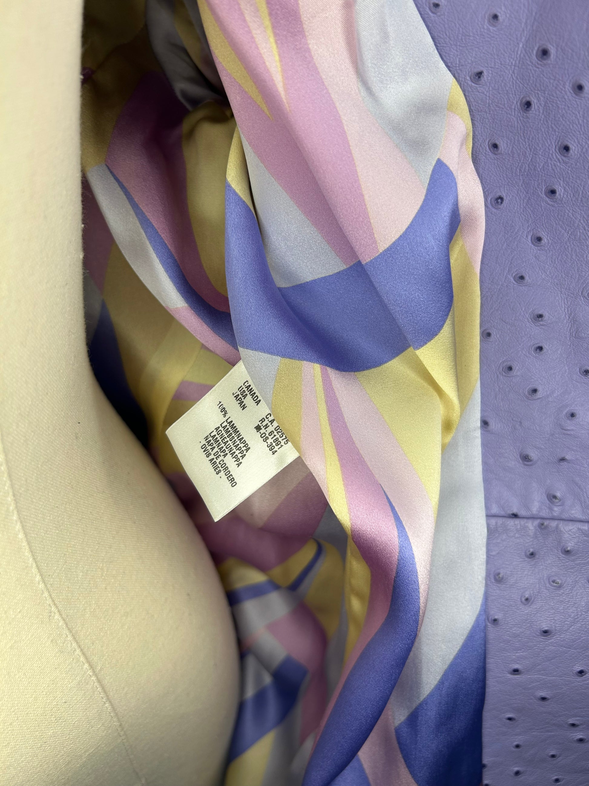 Lambs Nappa Leather with ostrich pattern imprinted. Lilac in colour with pure silk patterned lining. Some wear to the leather as shown in photos