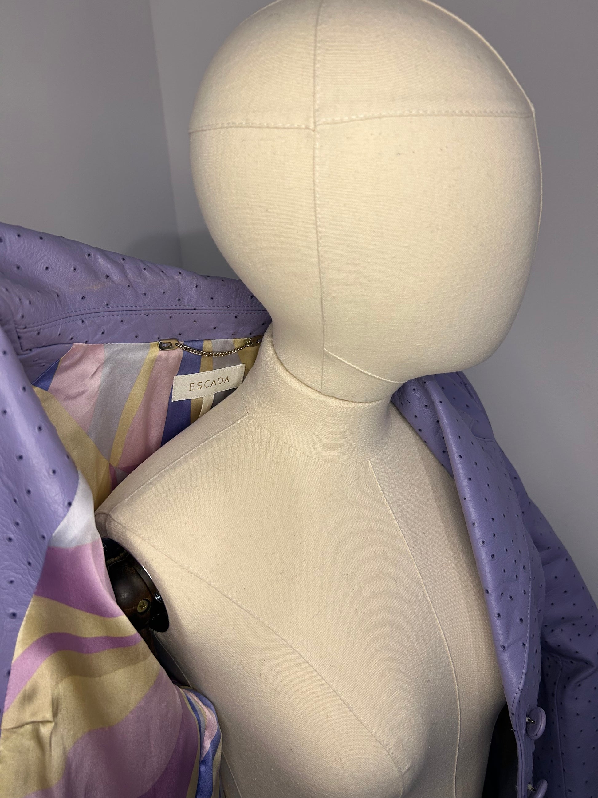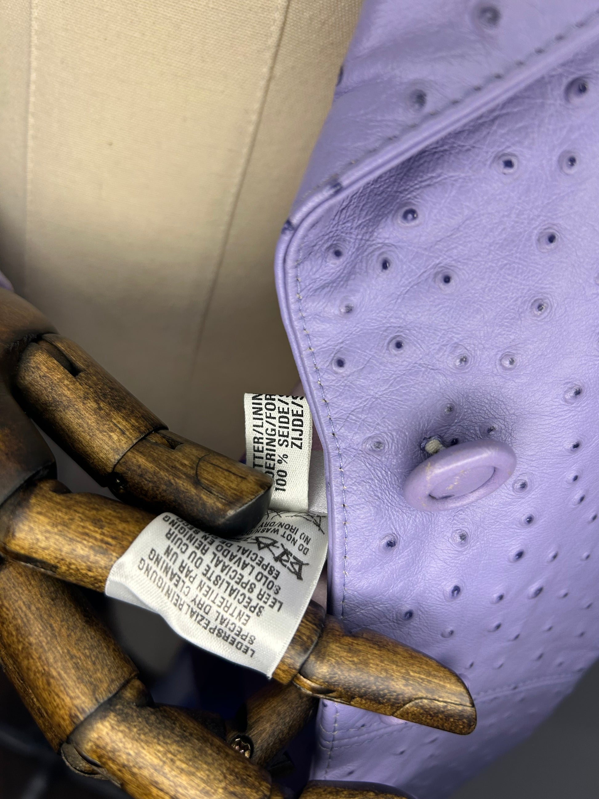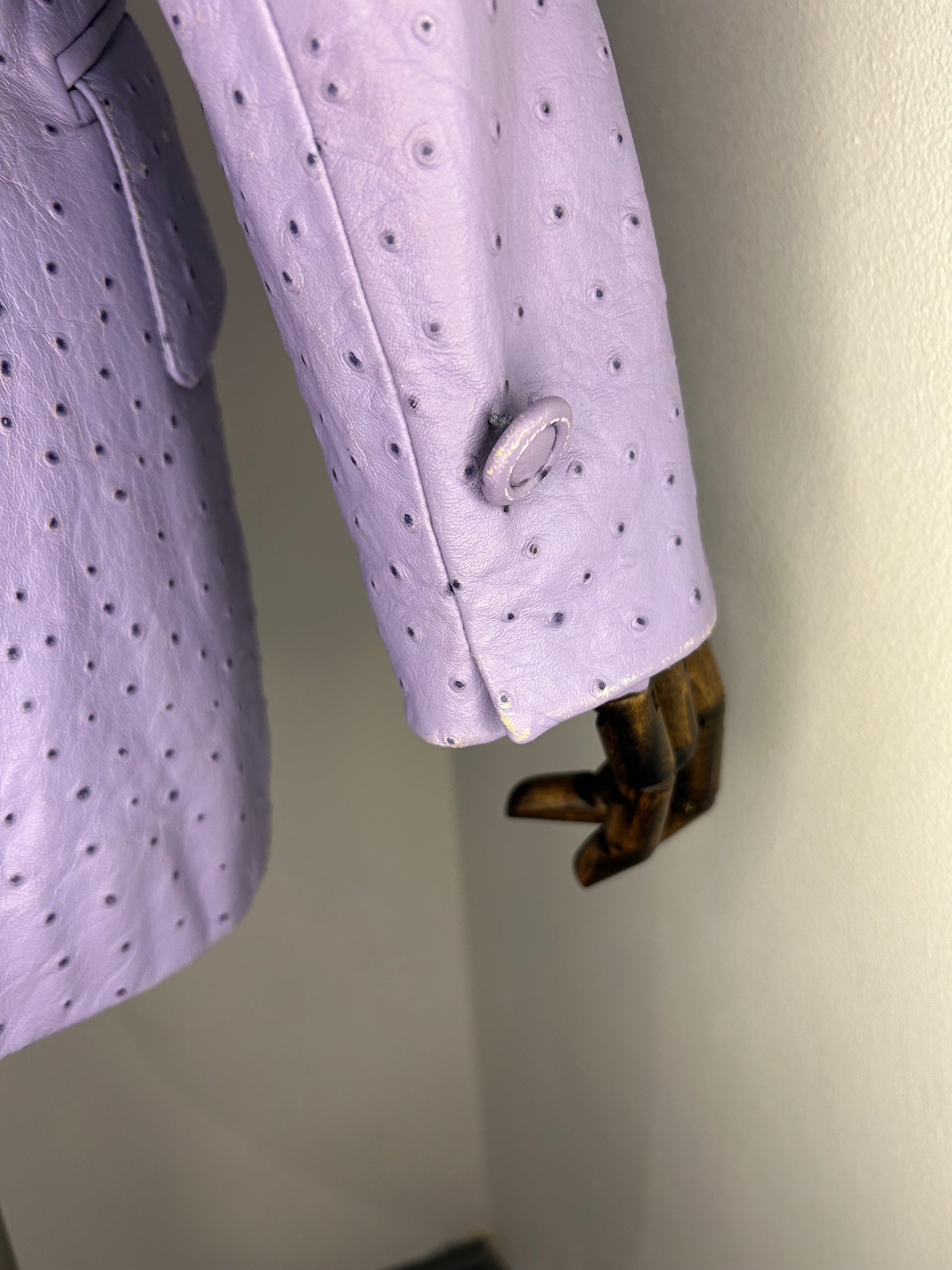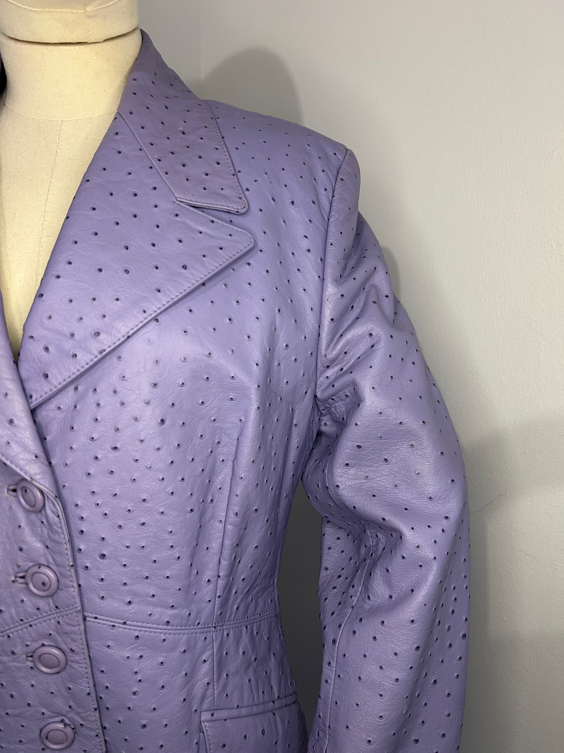 Lambs Nappa Leather with ostrich pattern imprinted. Lilac in colour with pure silk patterned lining. Some wear to the leather as shown in photos