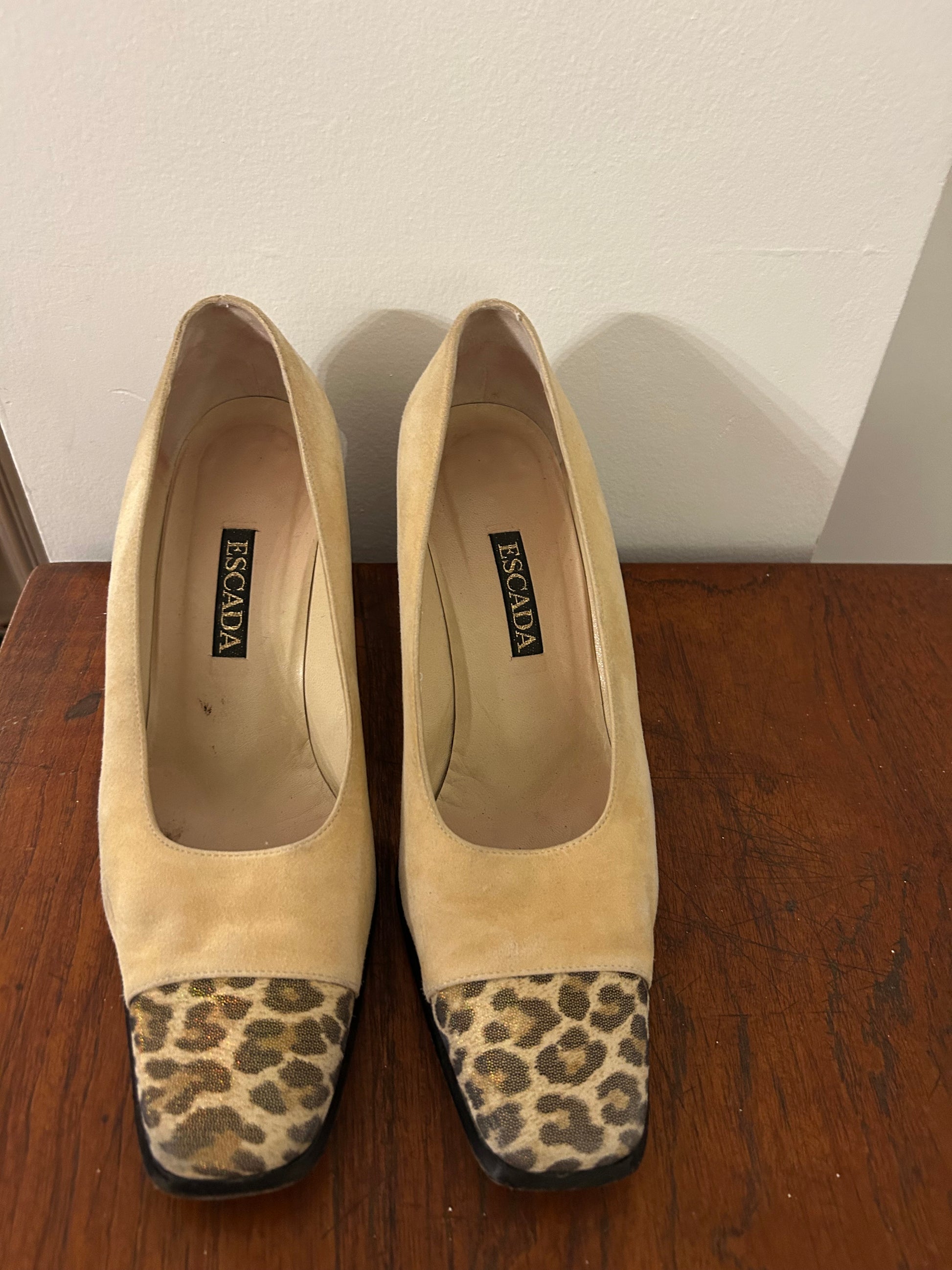Escada iridescent leopard print and beige block heels. Some markings as shown