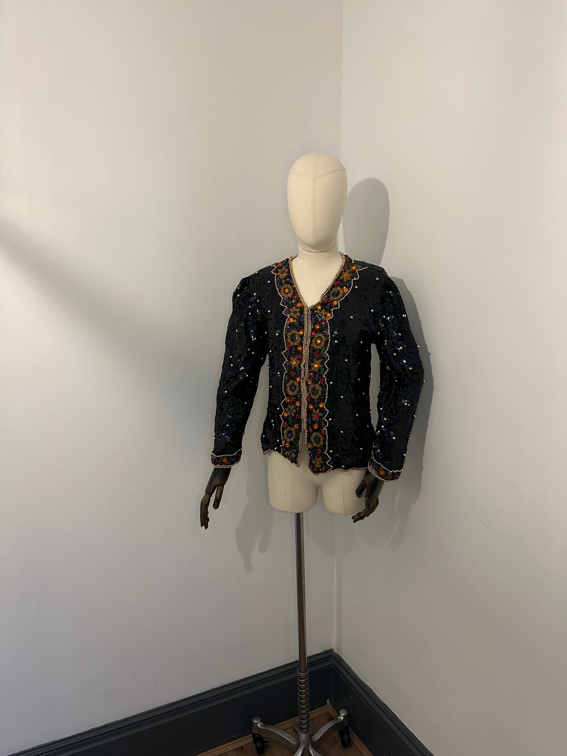 1980s black sequin jacket/cardigan, gold and coloured detail around the neck and down the front