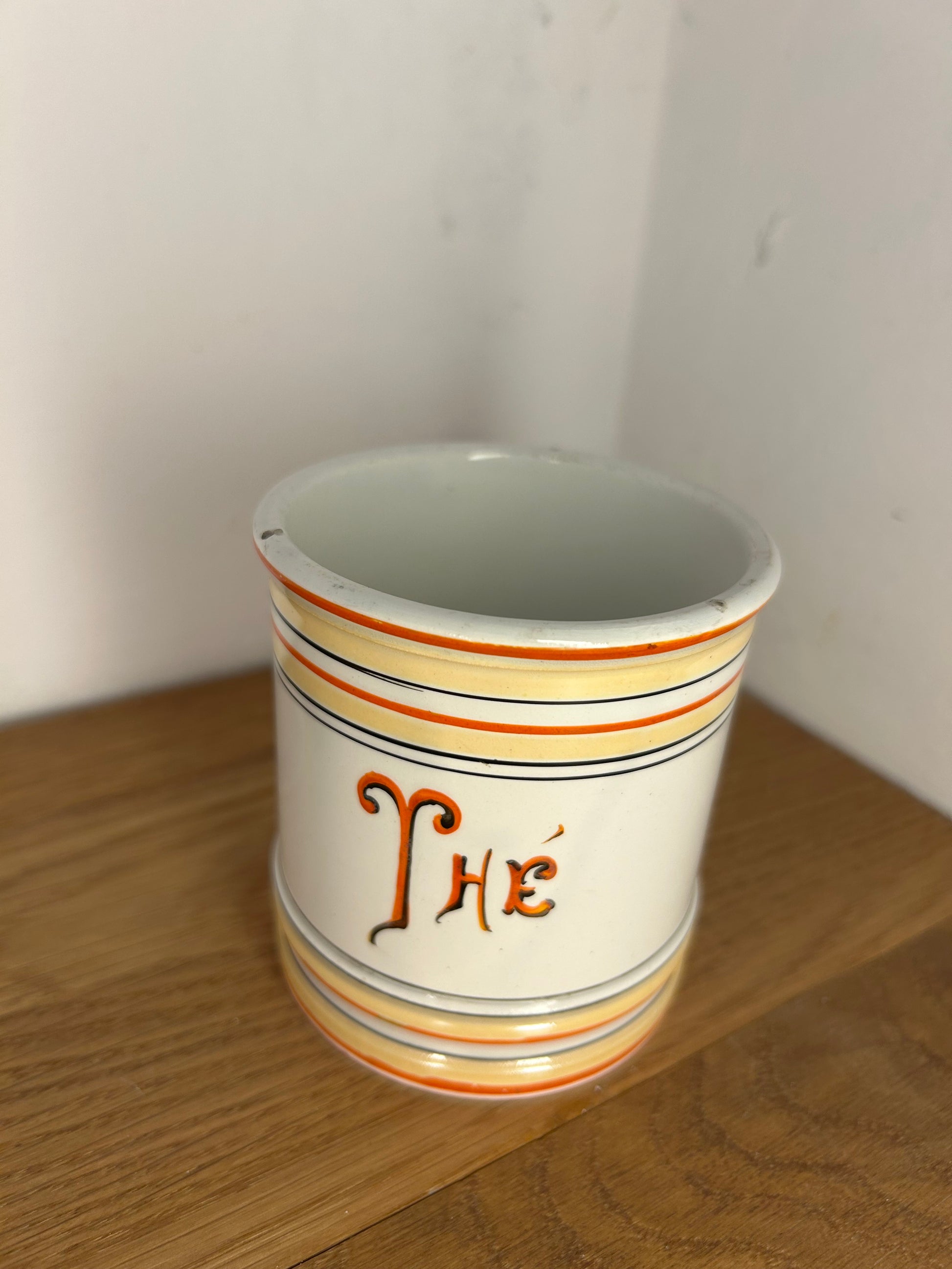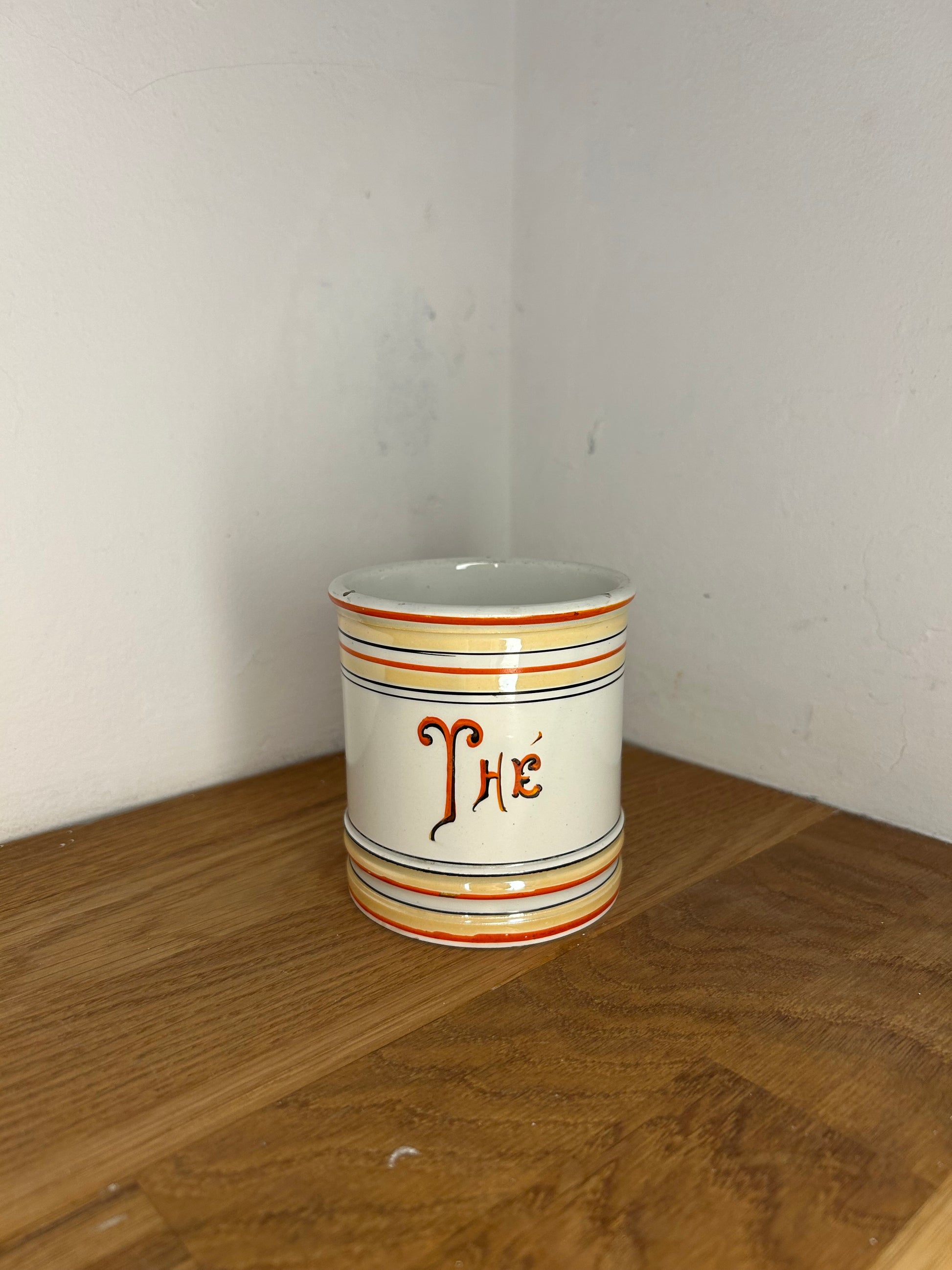French vessel with ‘thé’ painted with stripes. Unlidded. Stamped on the base ‘Vieillard & Cie‘