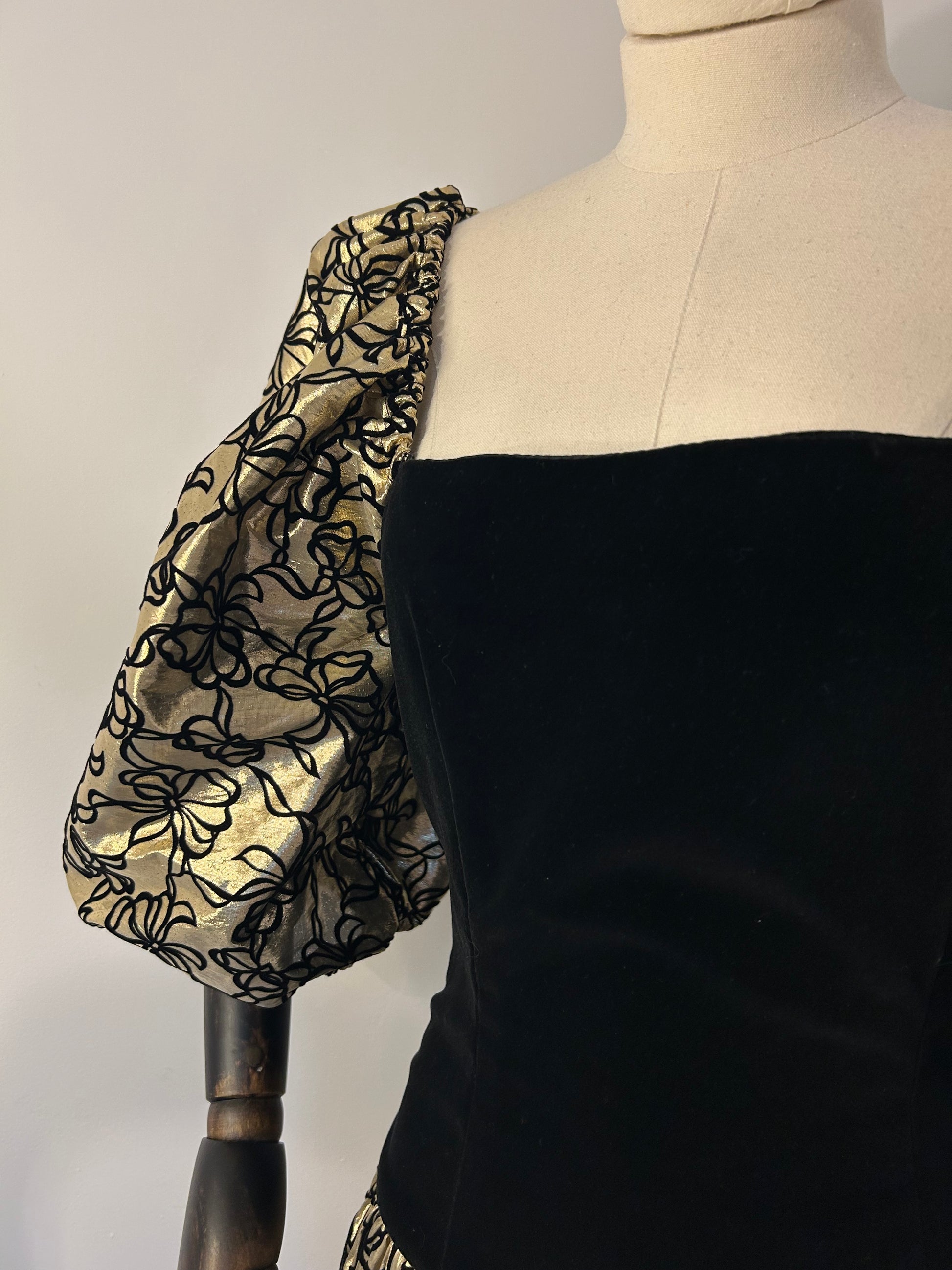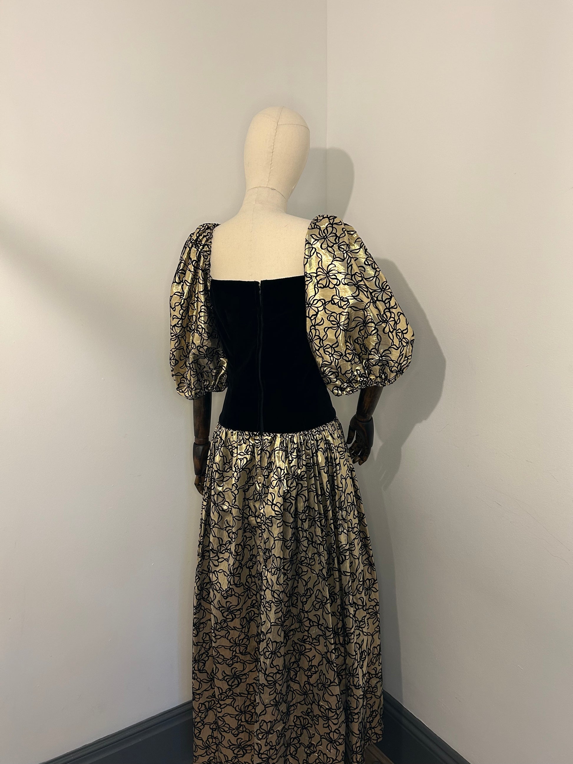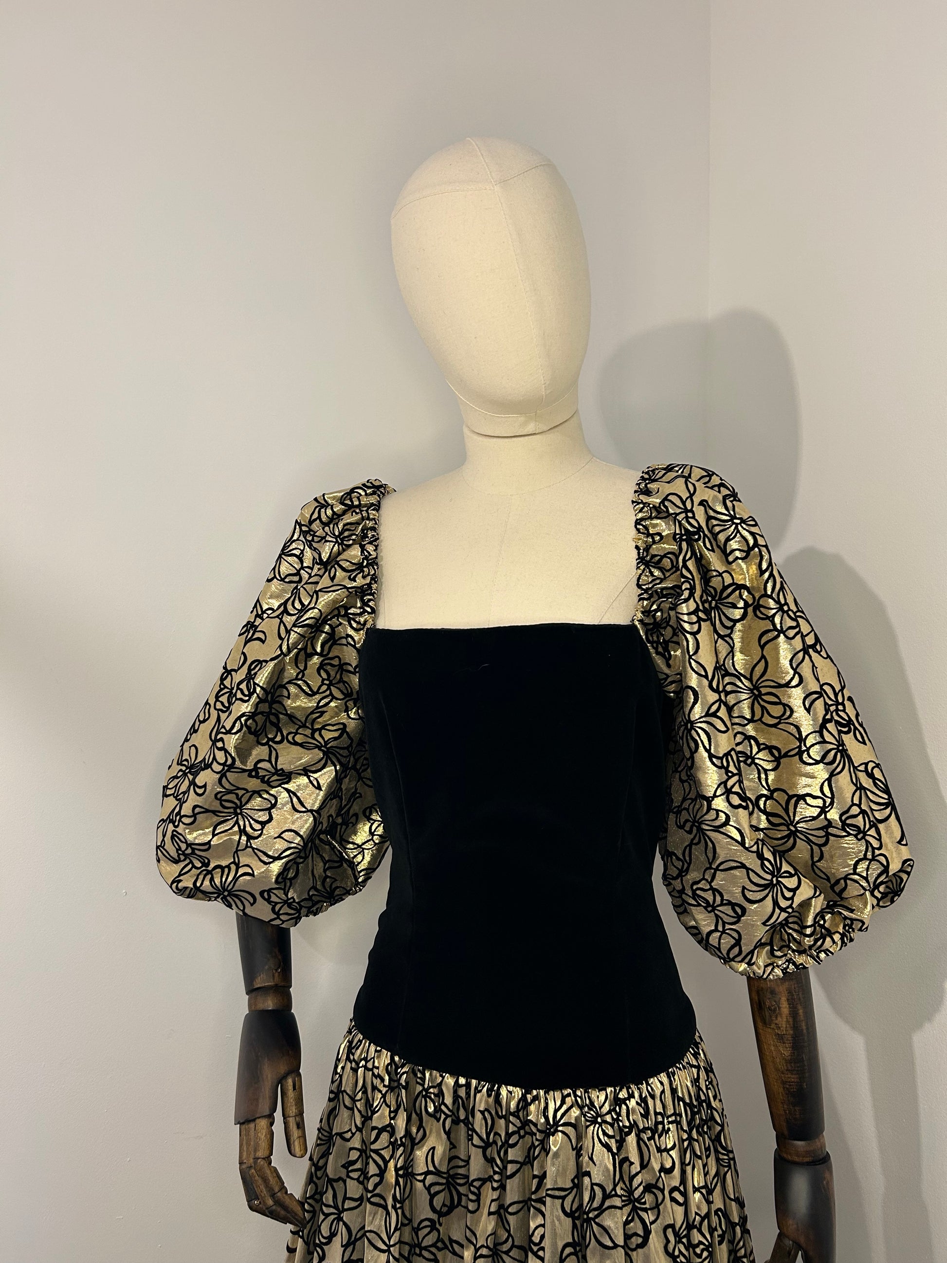 1980s handmade taffeta ballgown with black velvet bodice. Huge dramatic sleeves.