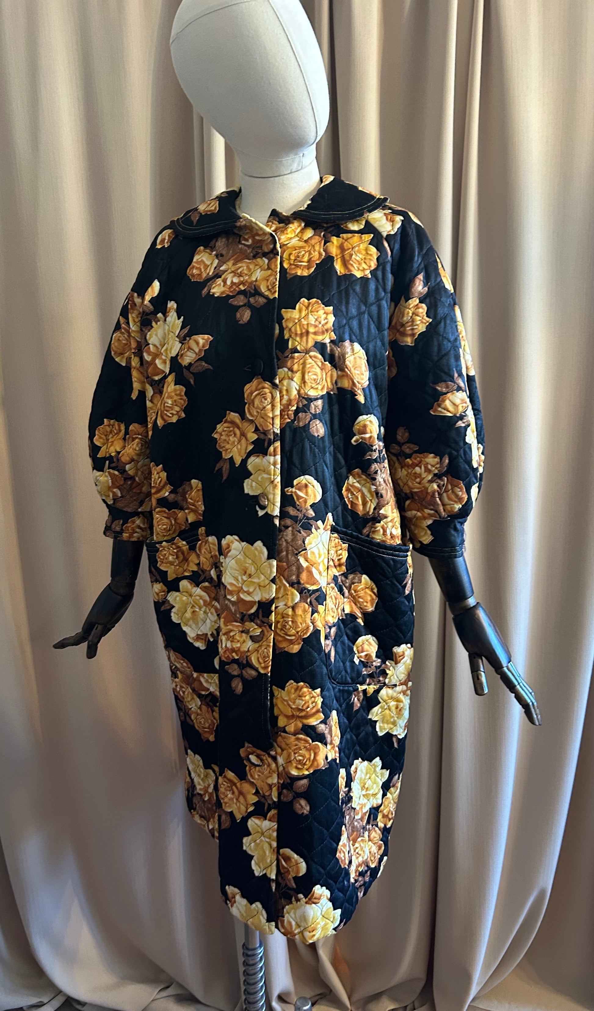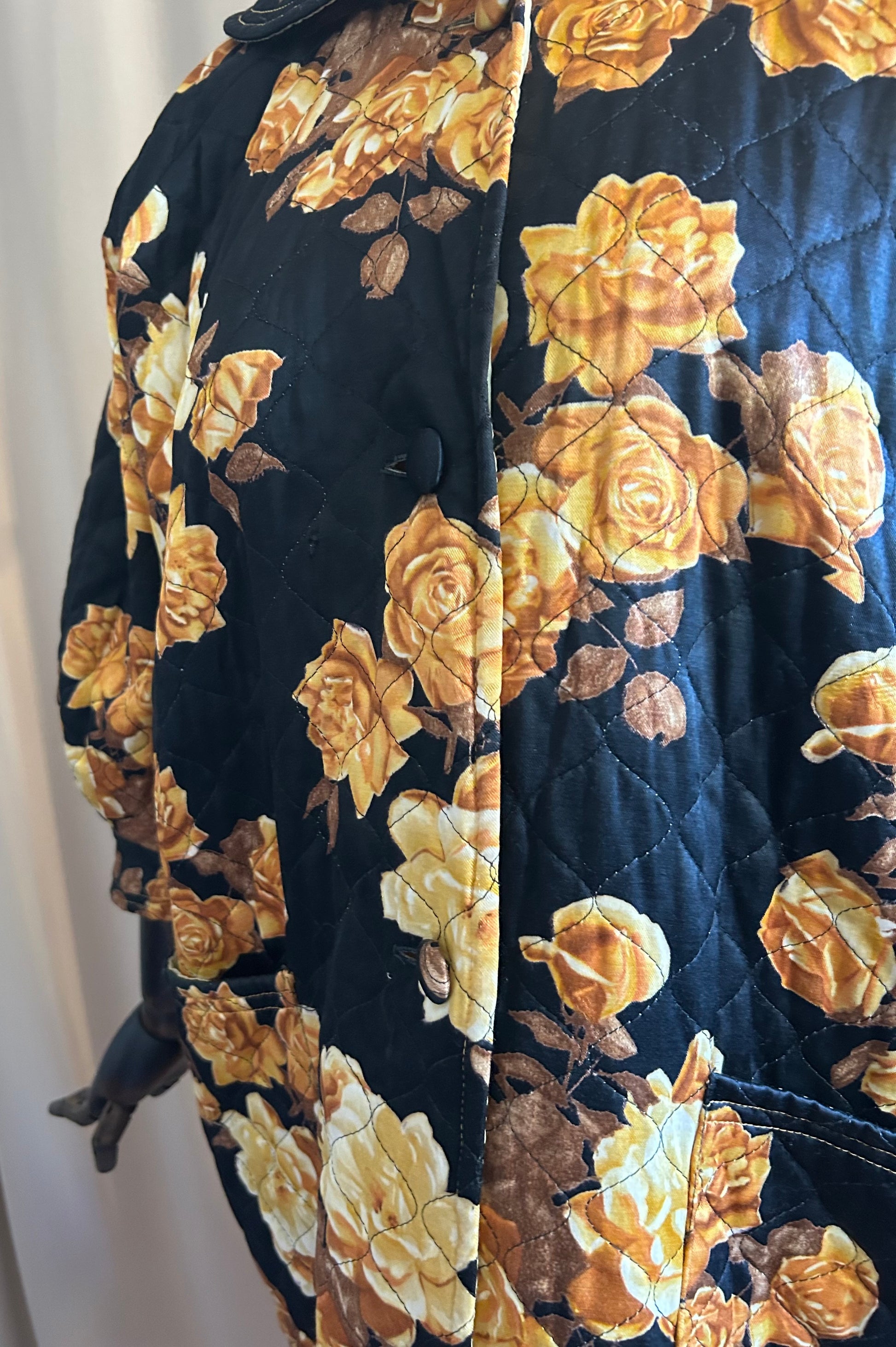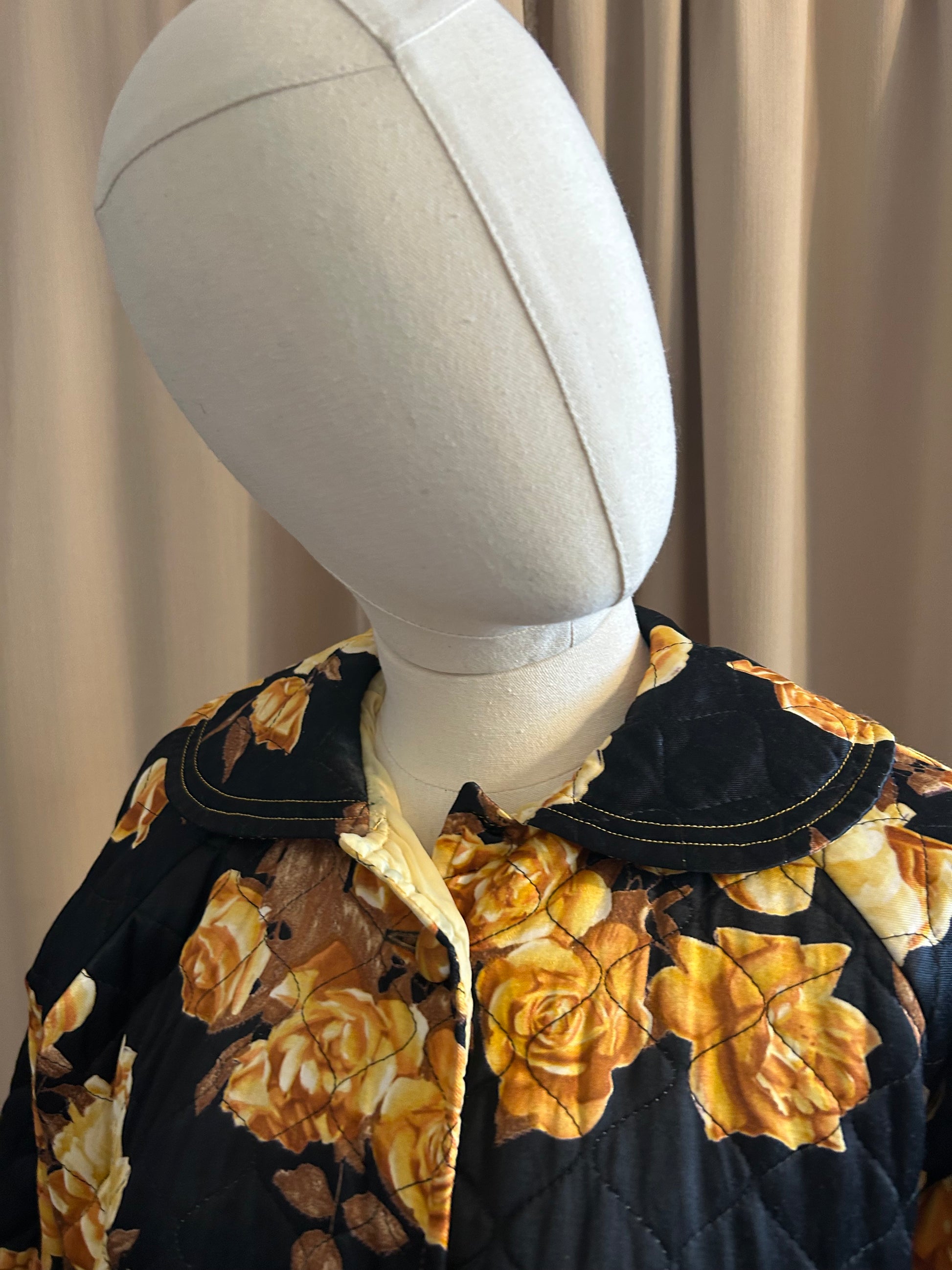 Black quilted house coat with golden yellow roses all over. Three quarter puffy sleeves