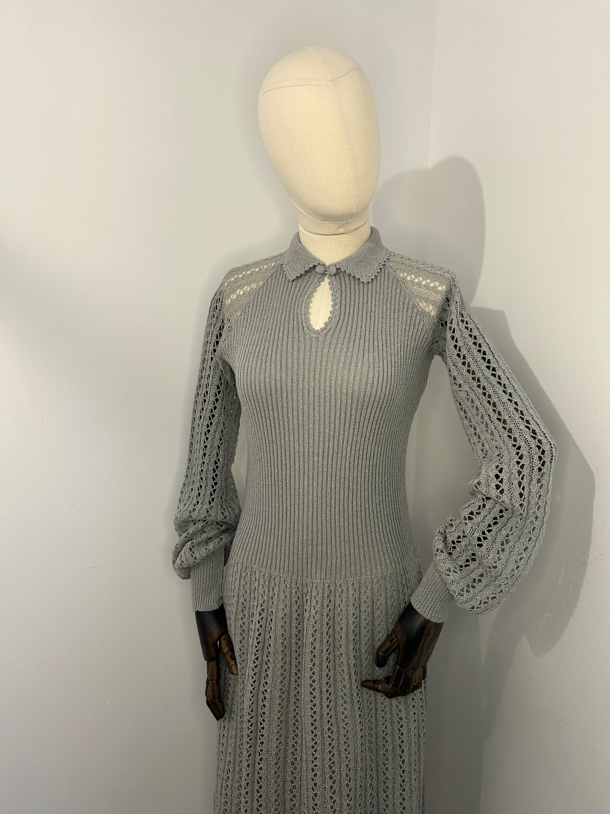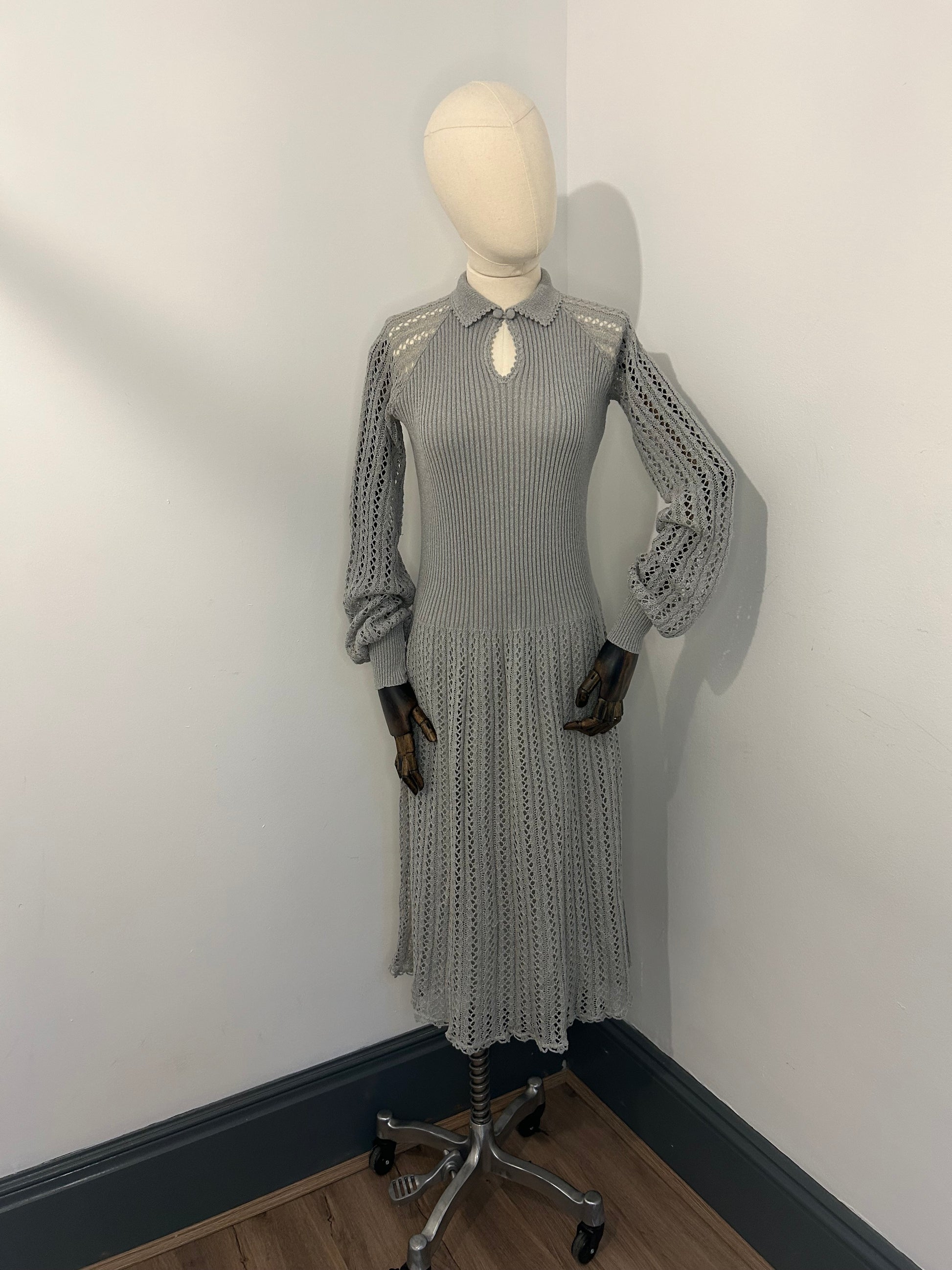 Grey knitted dress with collar. Button closure at the neck. Open knitted sleeve. Lined