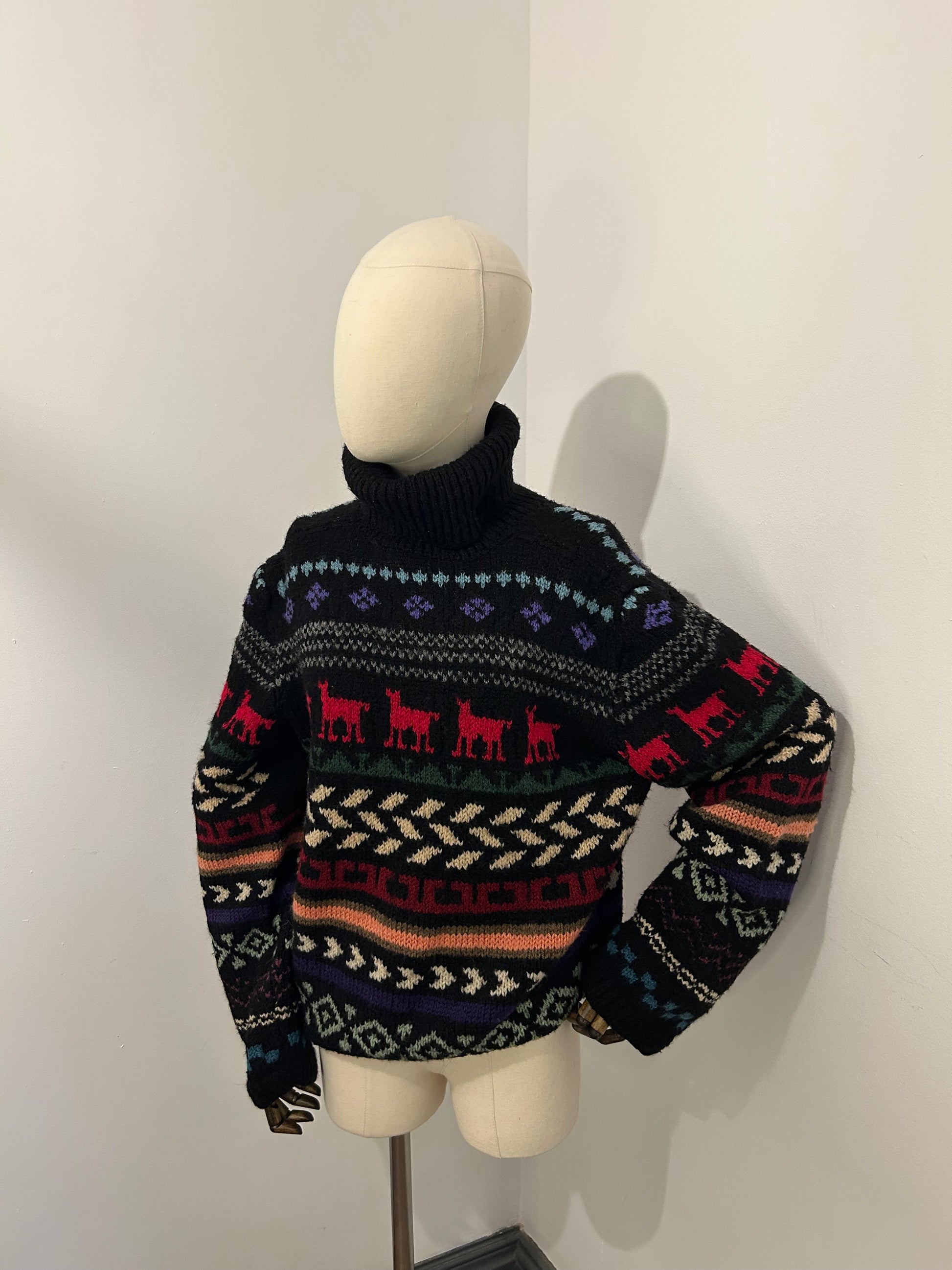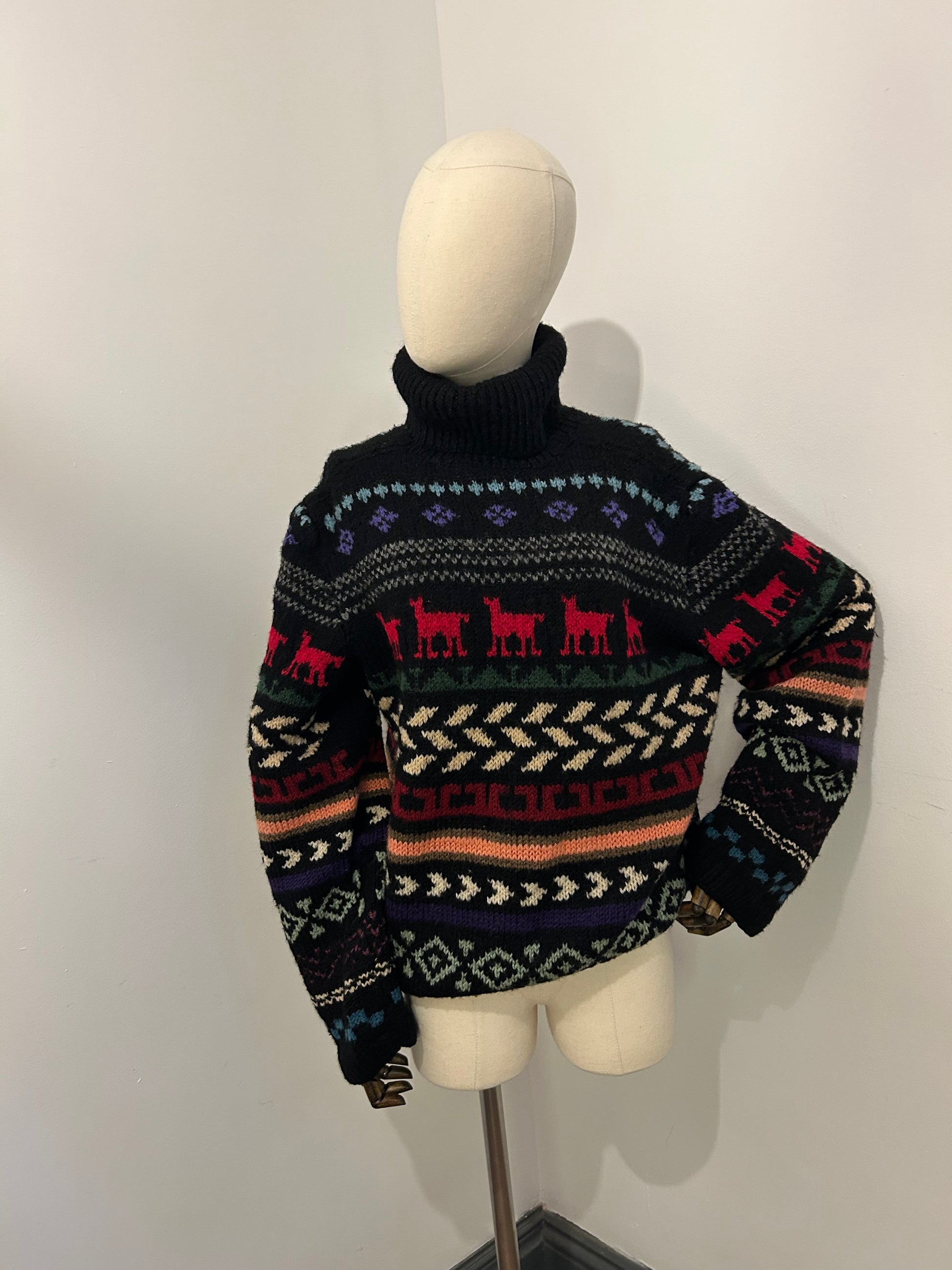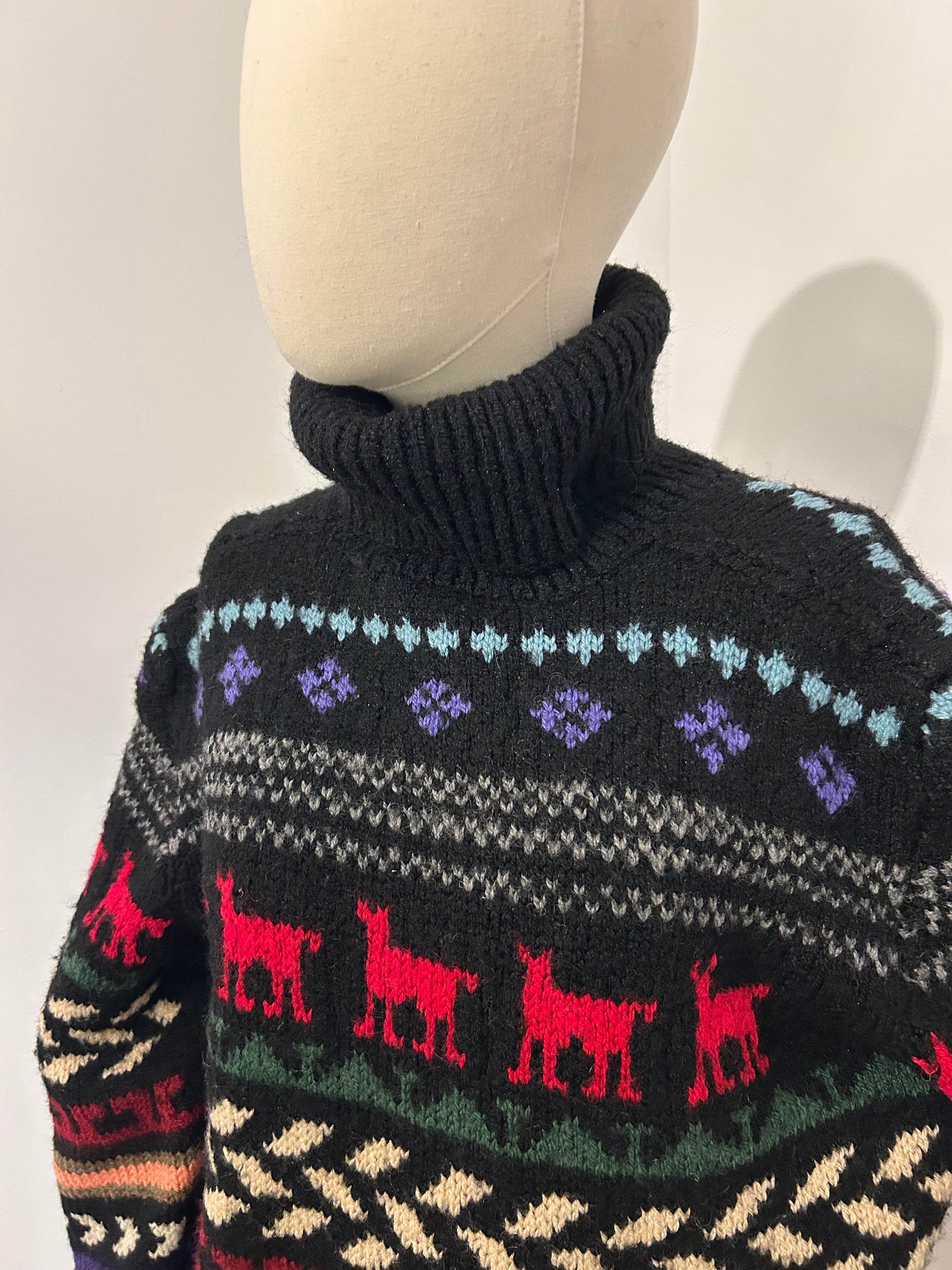 Hand knitted jumper with different variations of patterns with a line of llamas. Roll neck