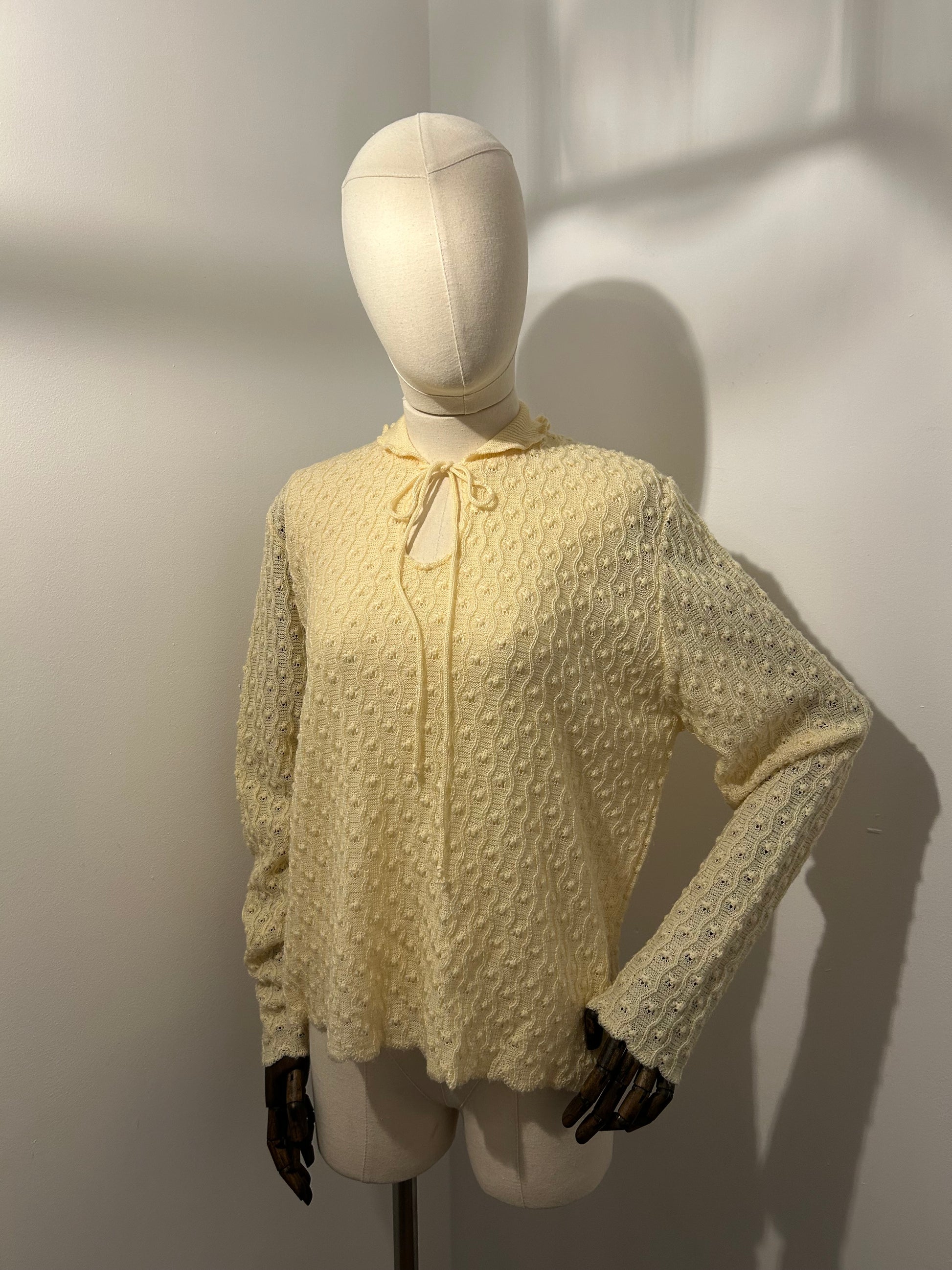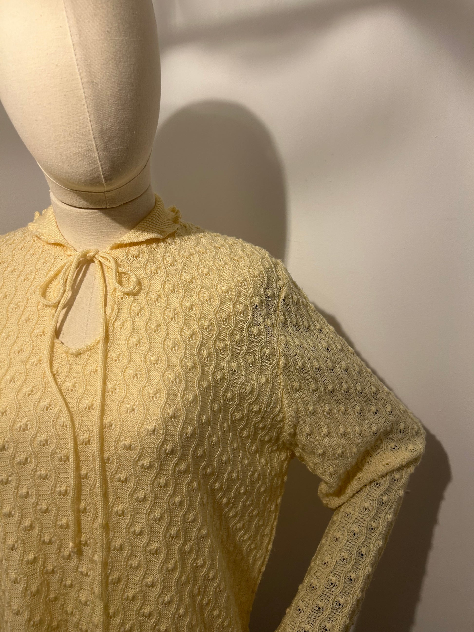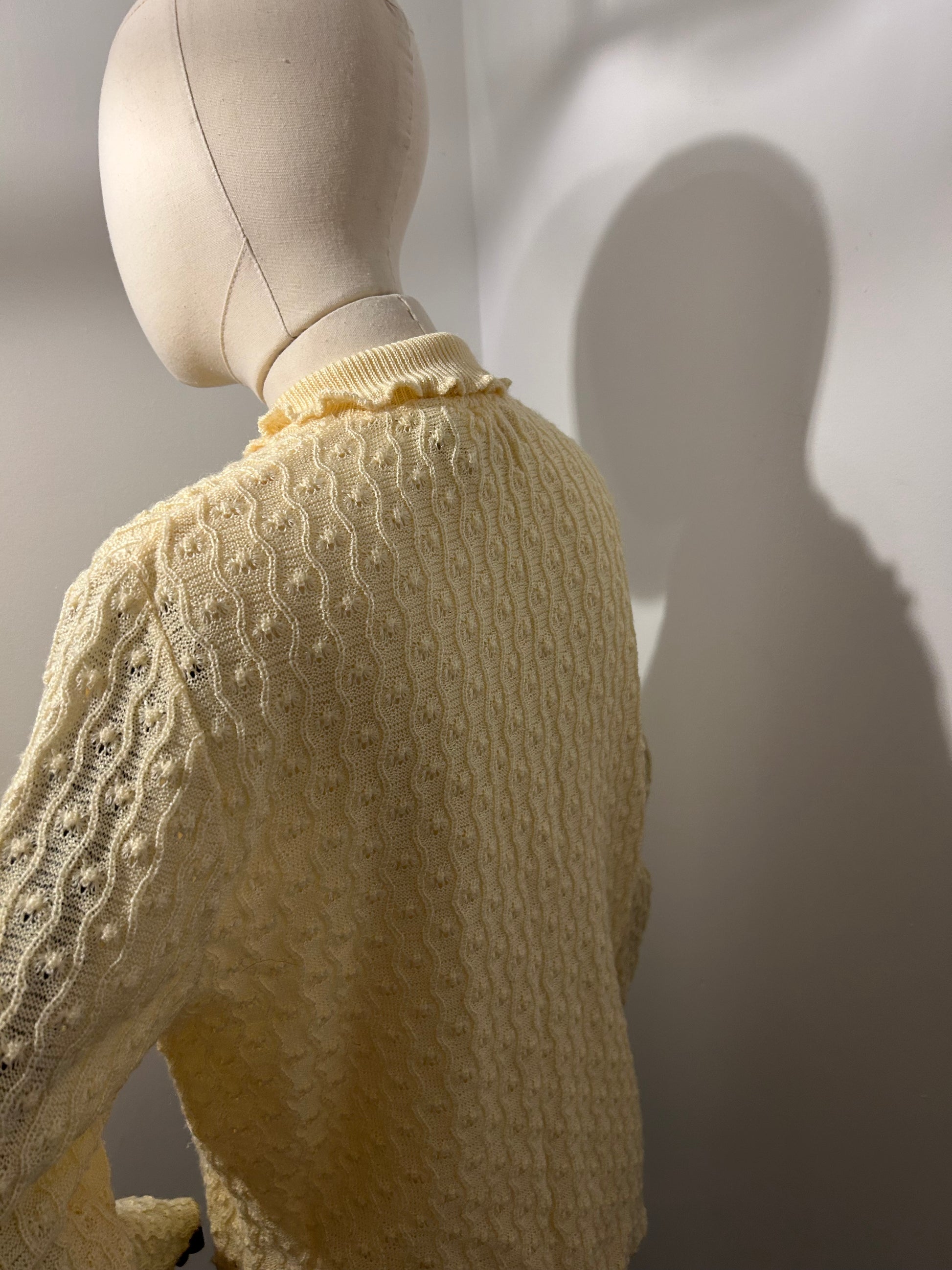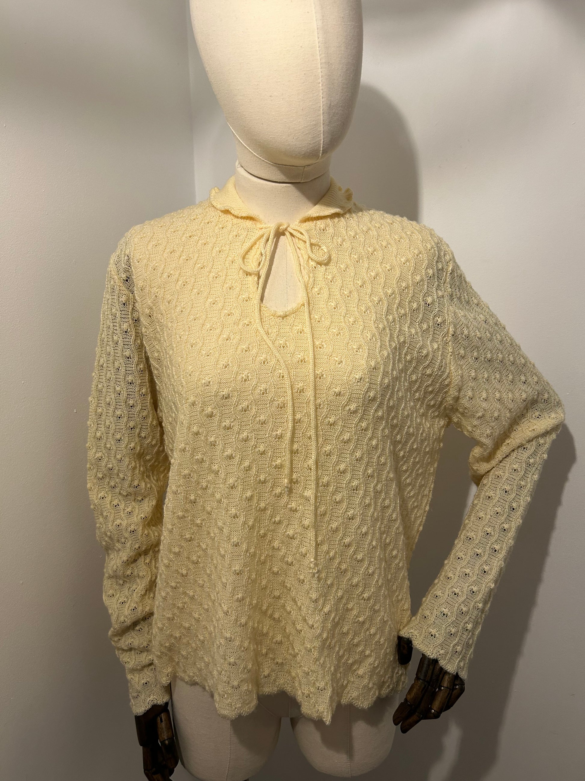 Light lemon knitted jumper with frilled collar and hems.