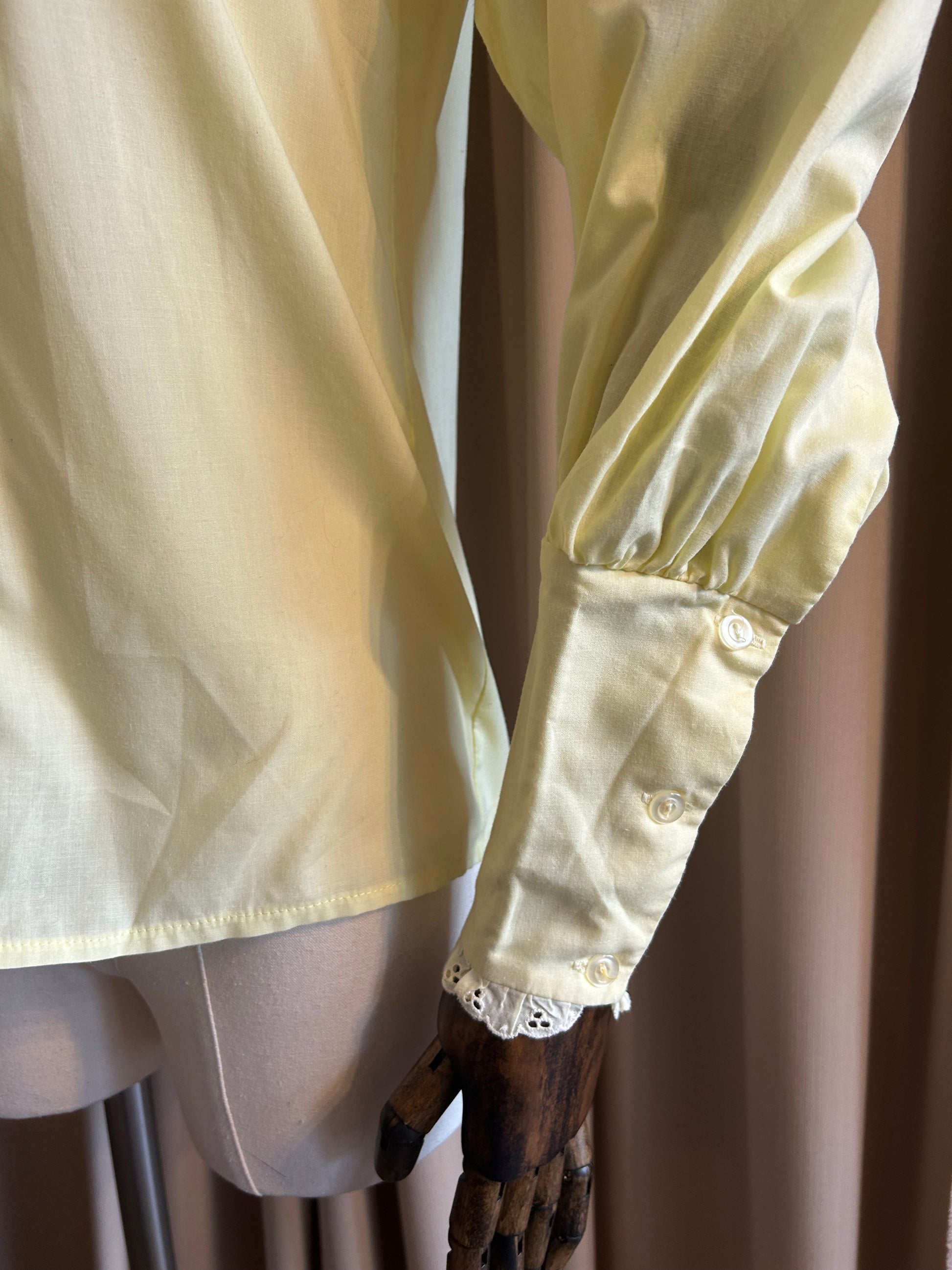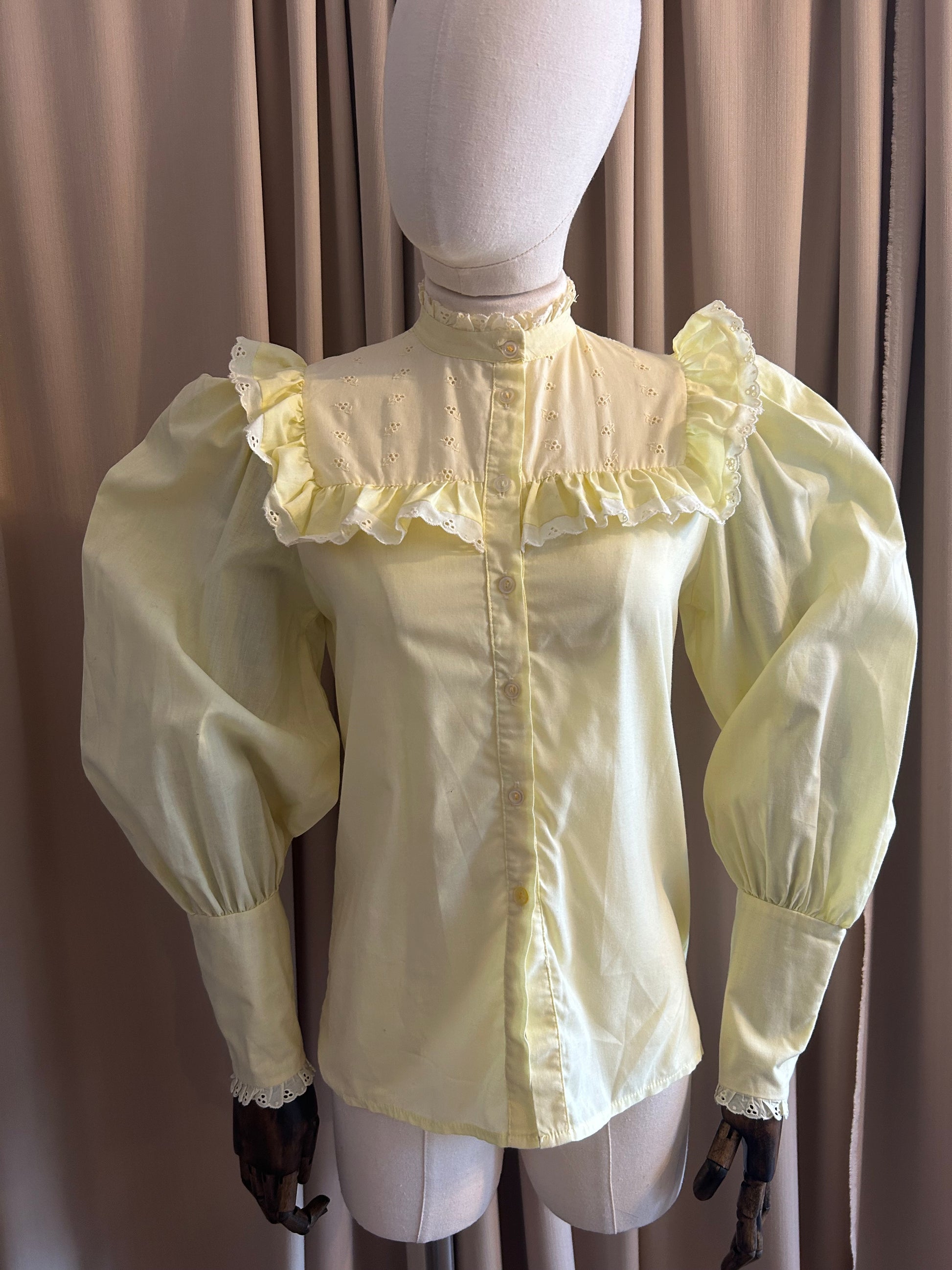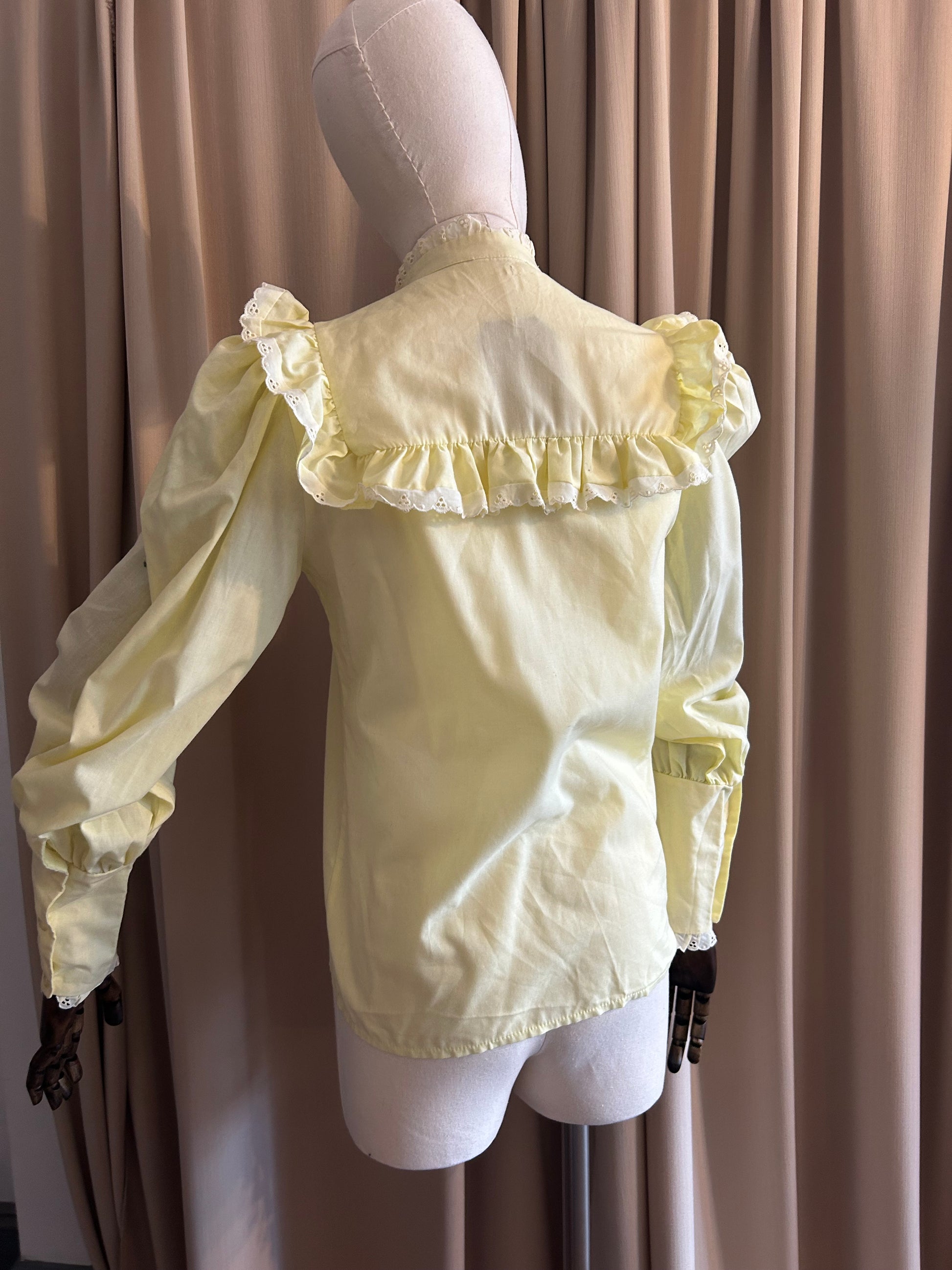 Lemon yellow prairie blouse with puff sleeves and lace ruffle around yolk