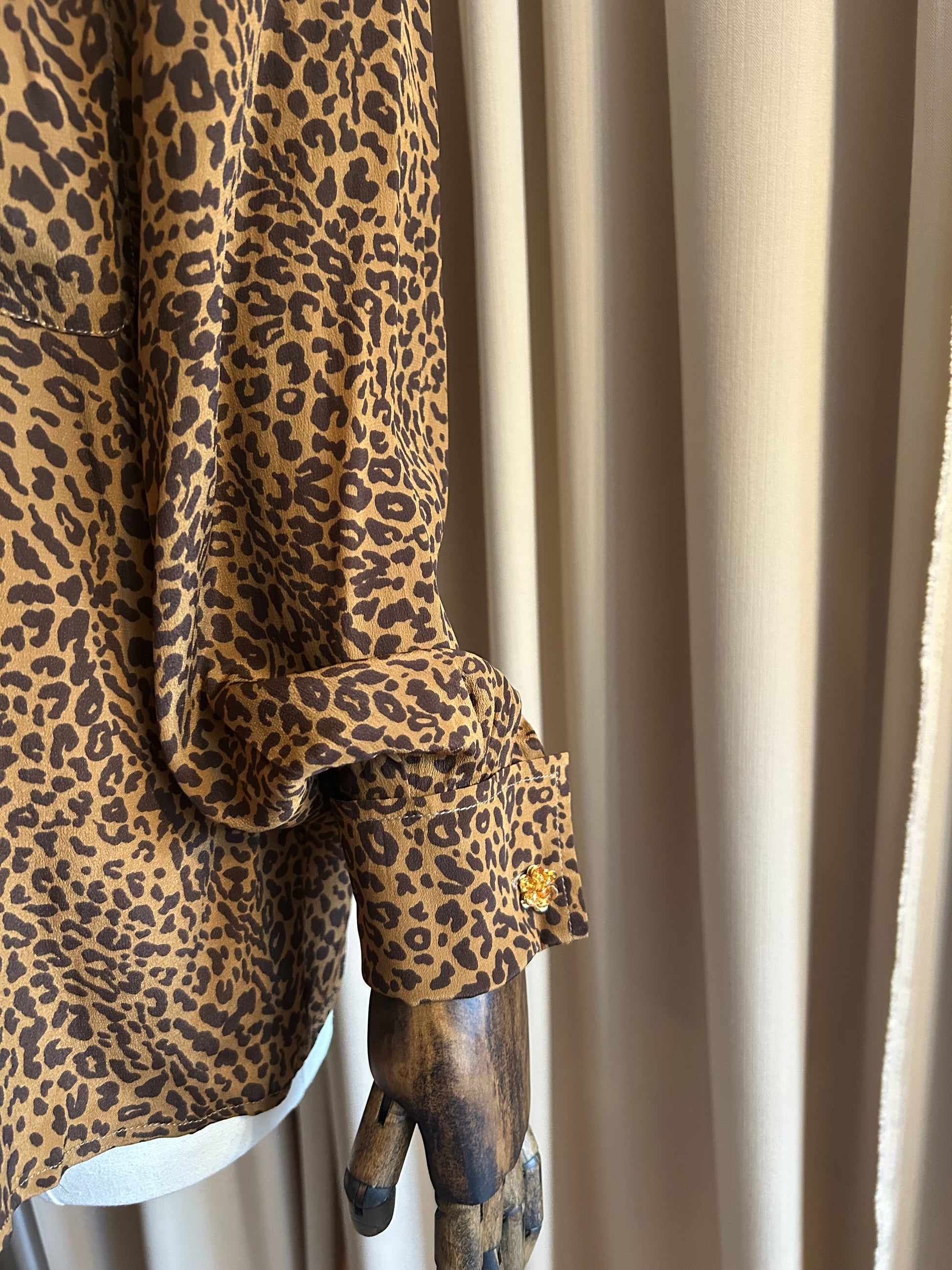 Leopard print vintage Valentino blouse with cufflink holes (shown here with clip on earrings) unusual shaped neckline and of course the 80s shoulder pads