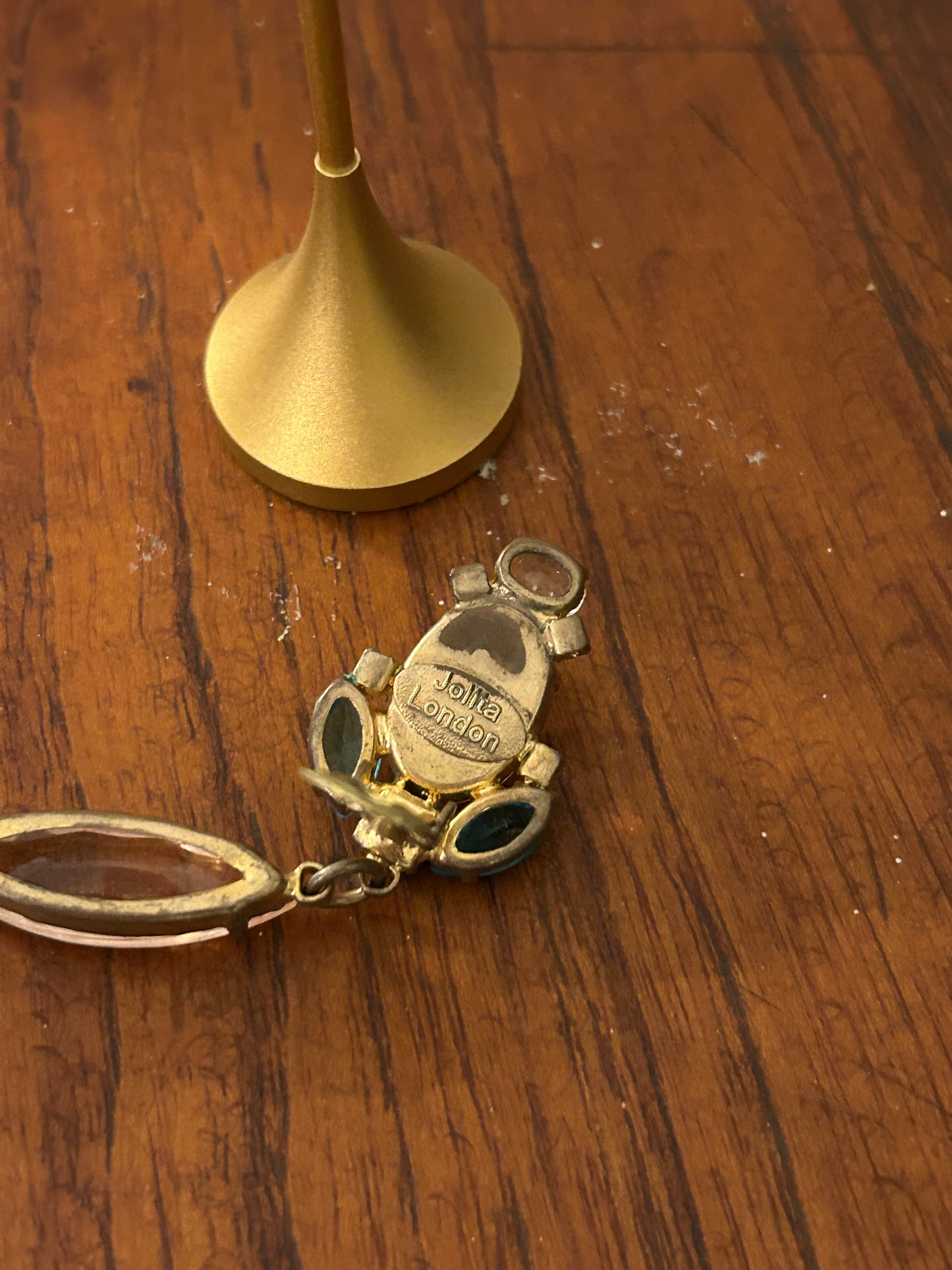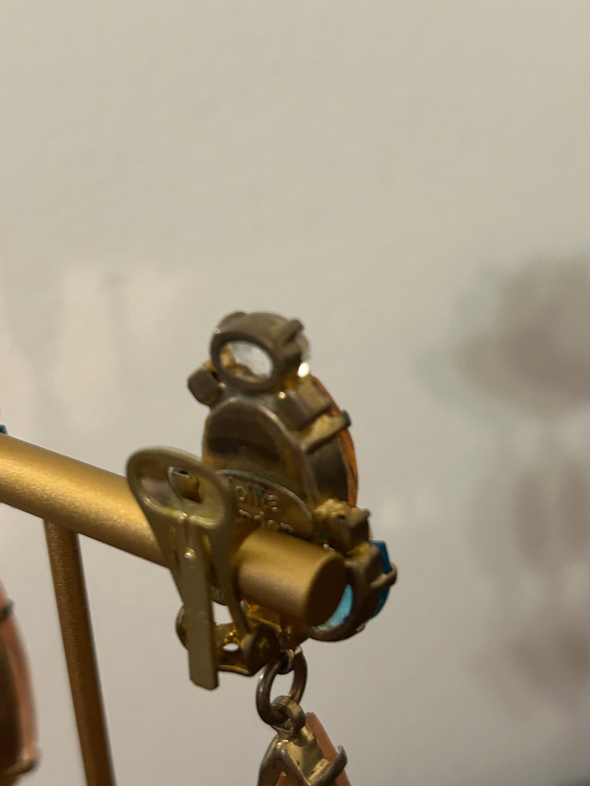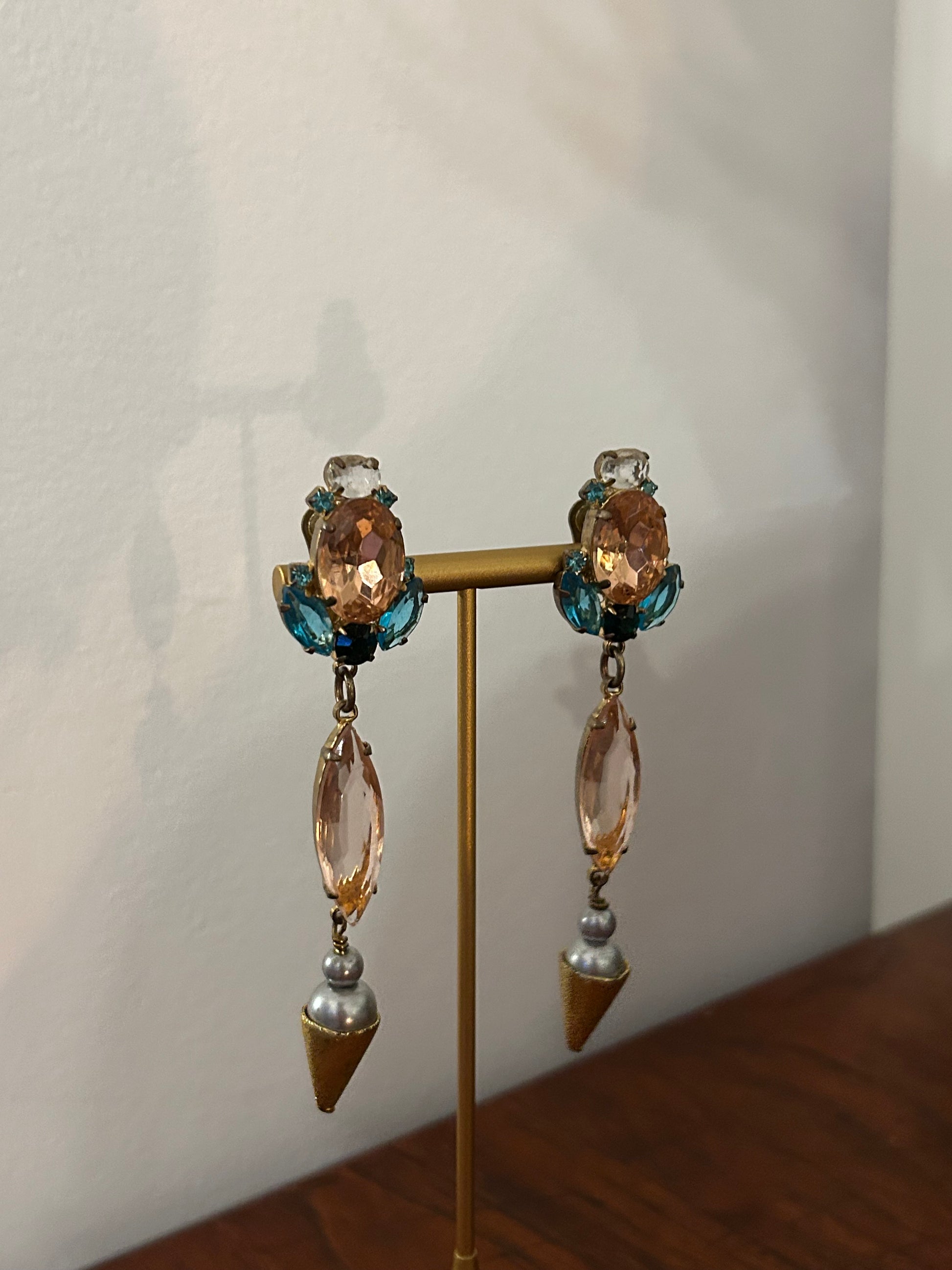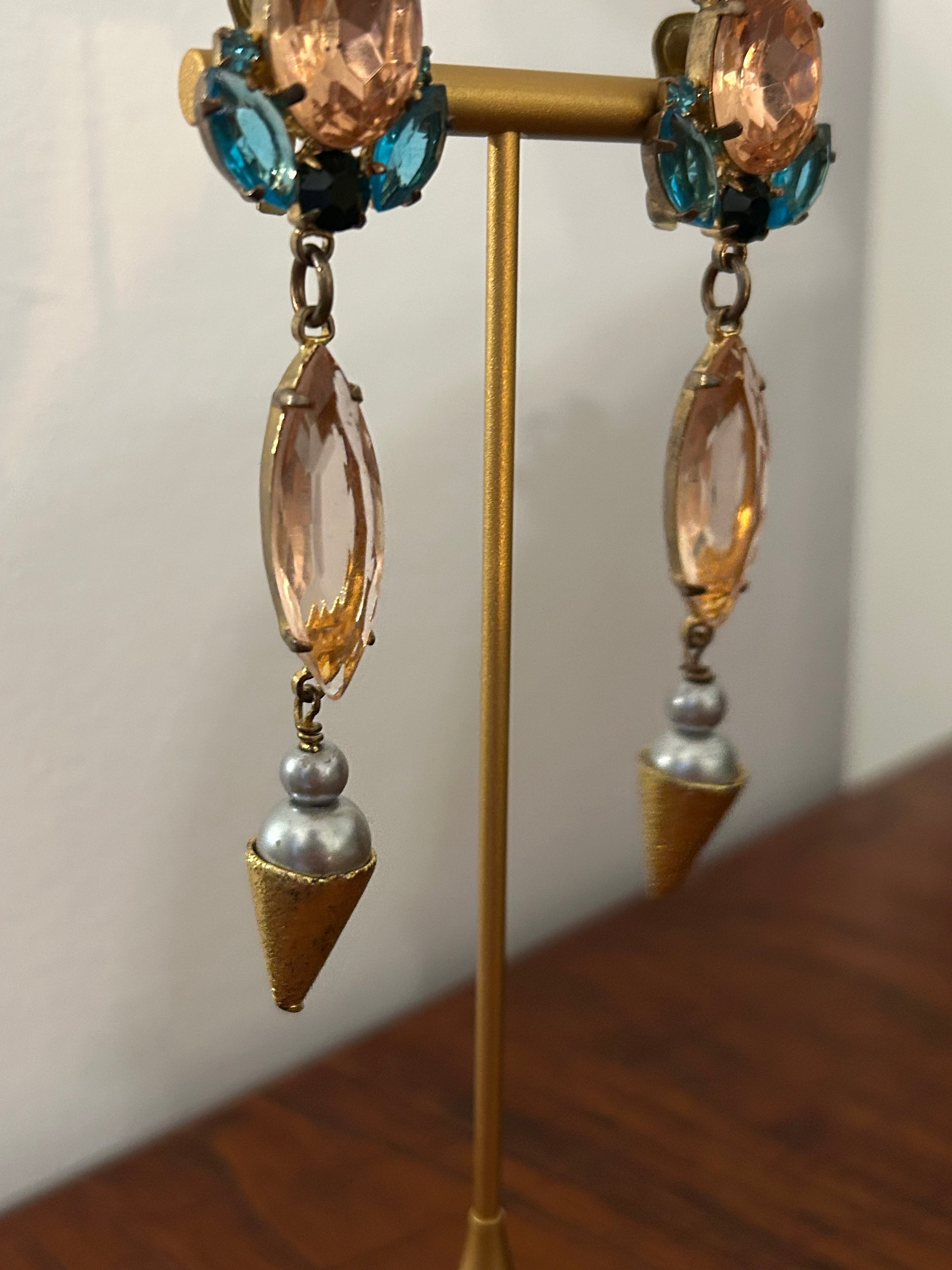 Long beaded clip on earrings by Jolita London with pink and turquoise drops