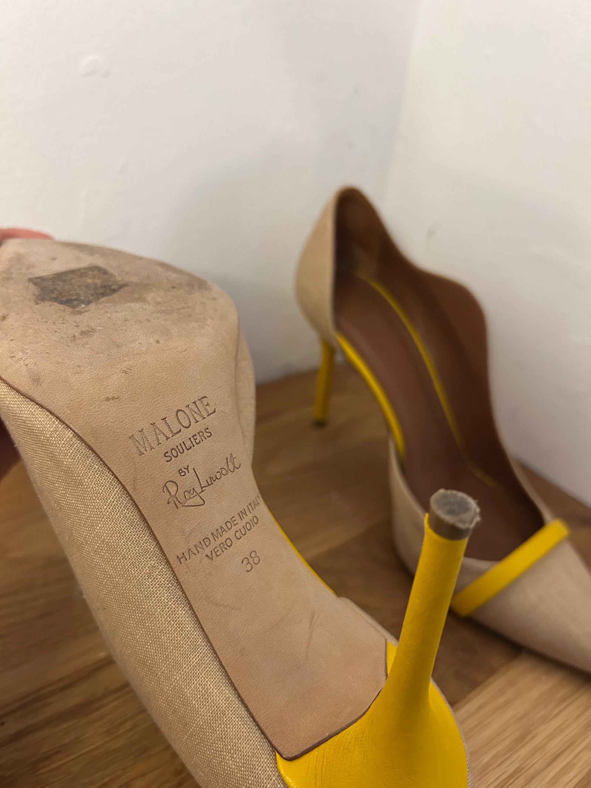Linen and bright yellow patent details, worn a few times but pretty good condition.