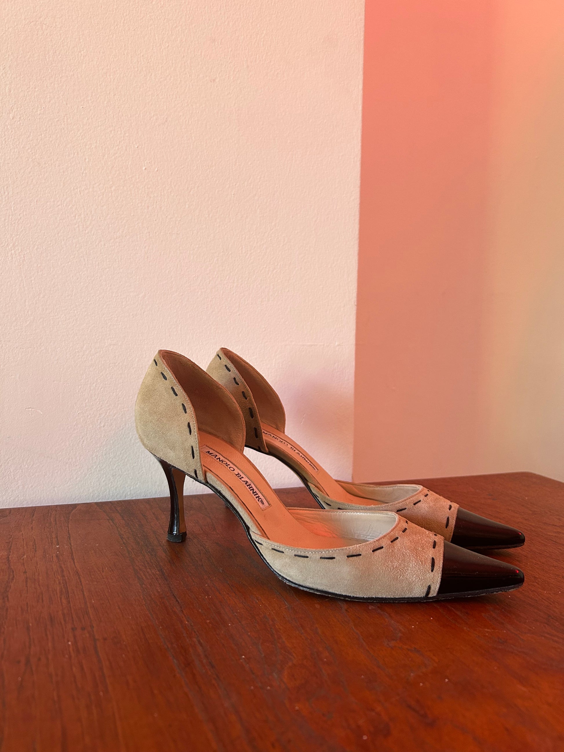 Brown suede and black patent accents on these Manolo Blahnik kitten heels with pointed toe
