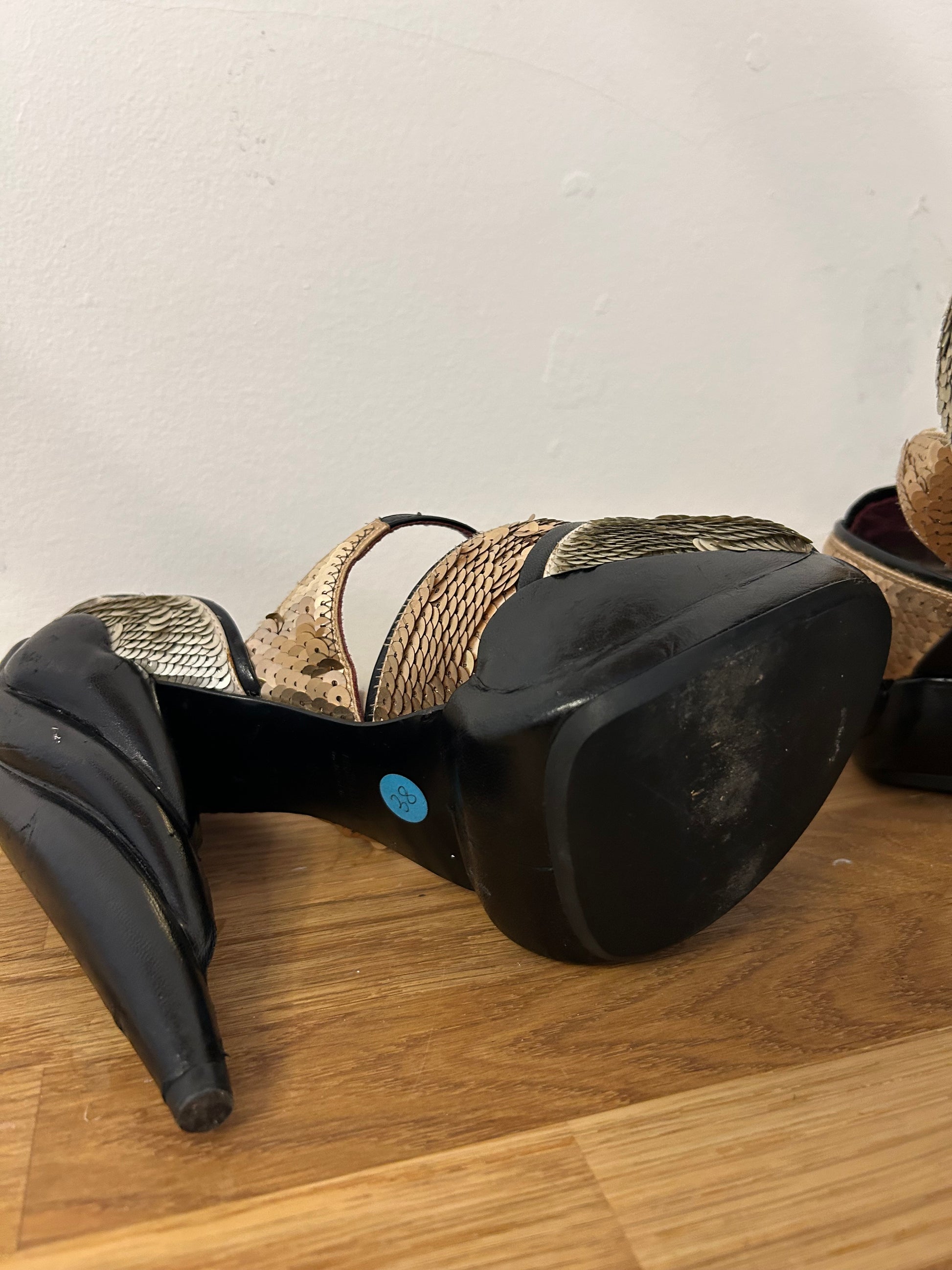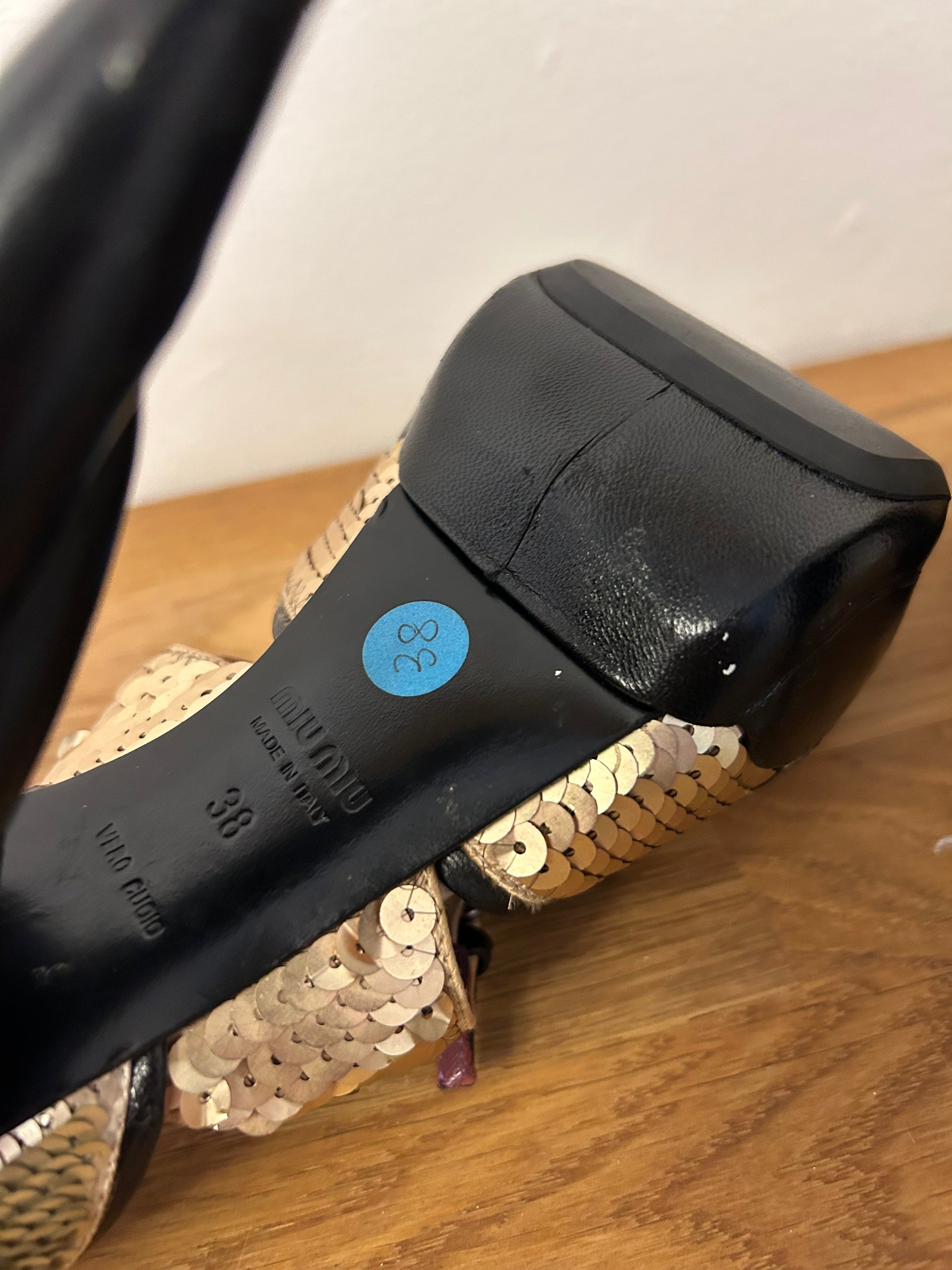 Miumiu statement heels with sequins and swirled leather heels. Worn condition