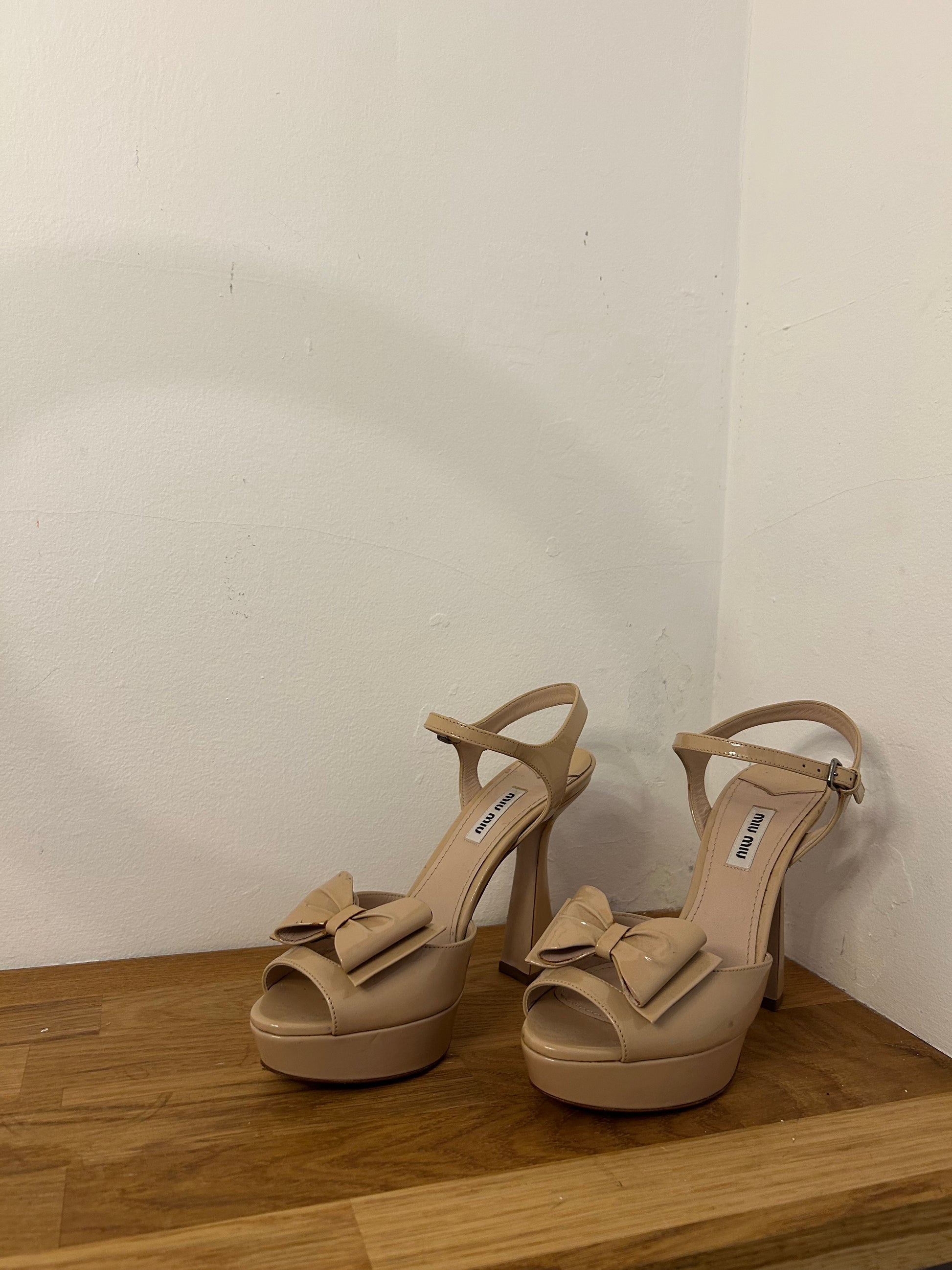 Miumiu patent nude heels platform style with bow on the toe, some glue seepage as shown in photos