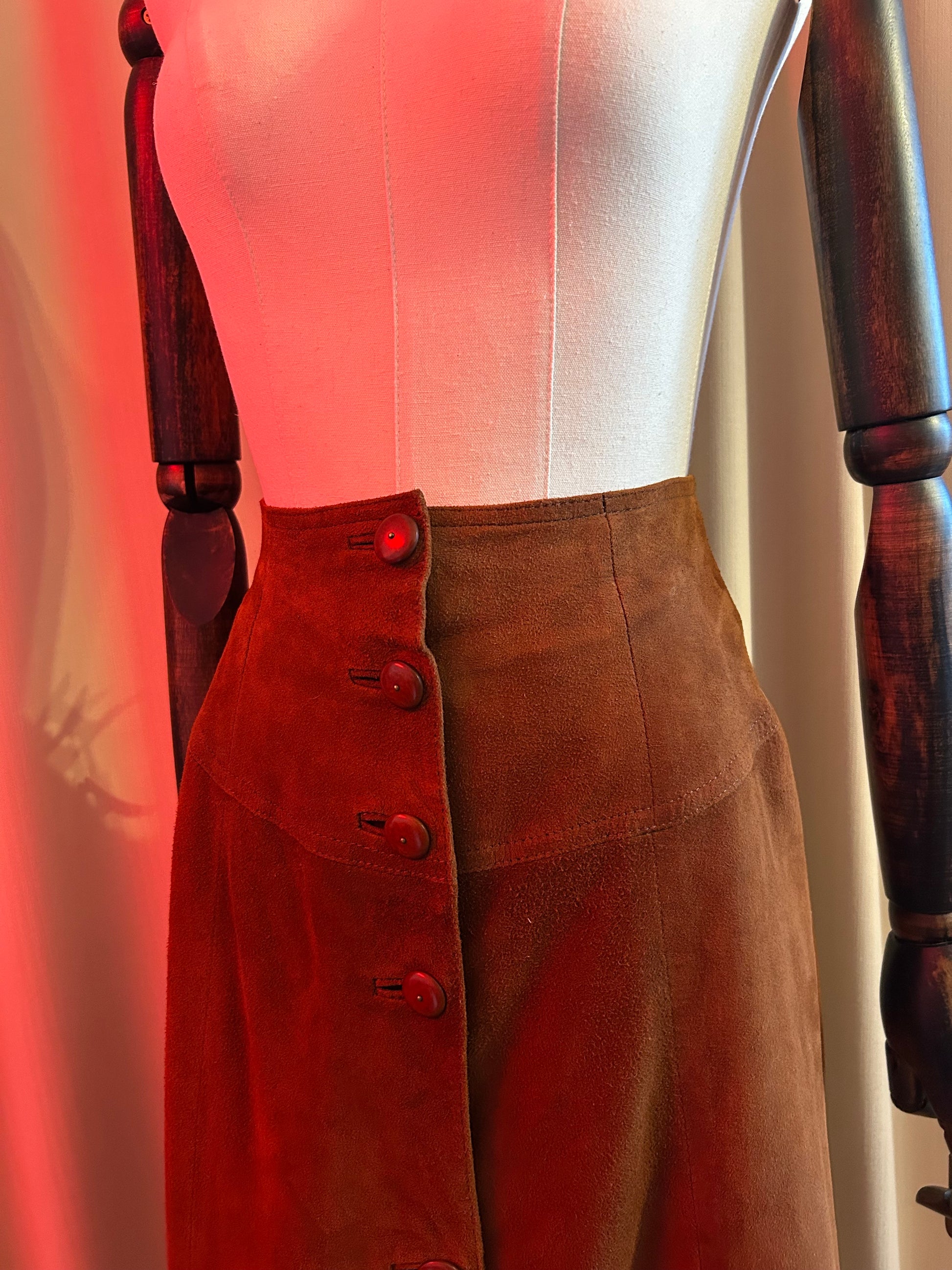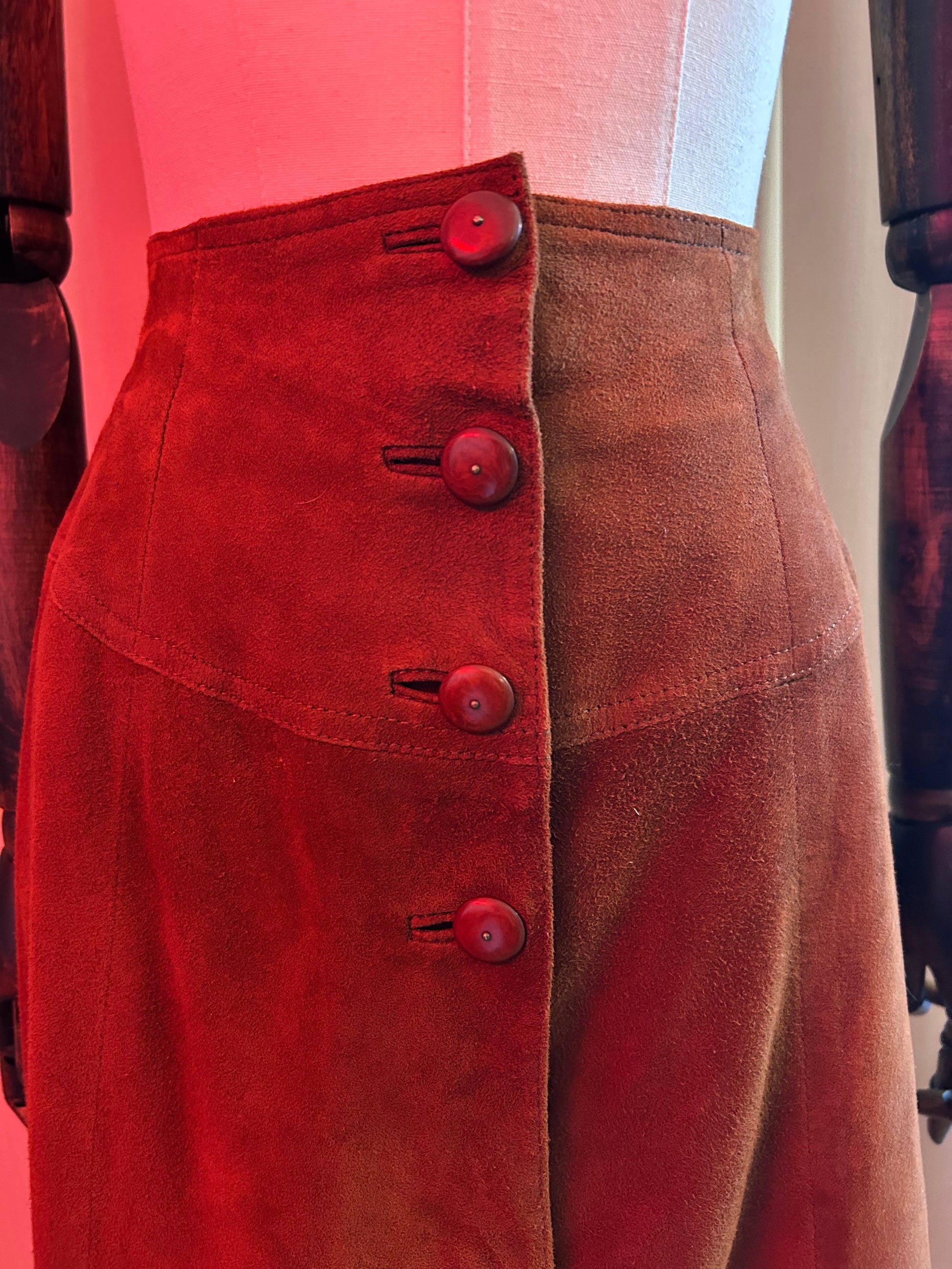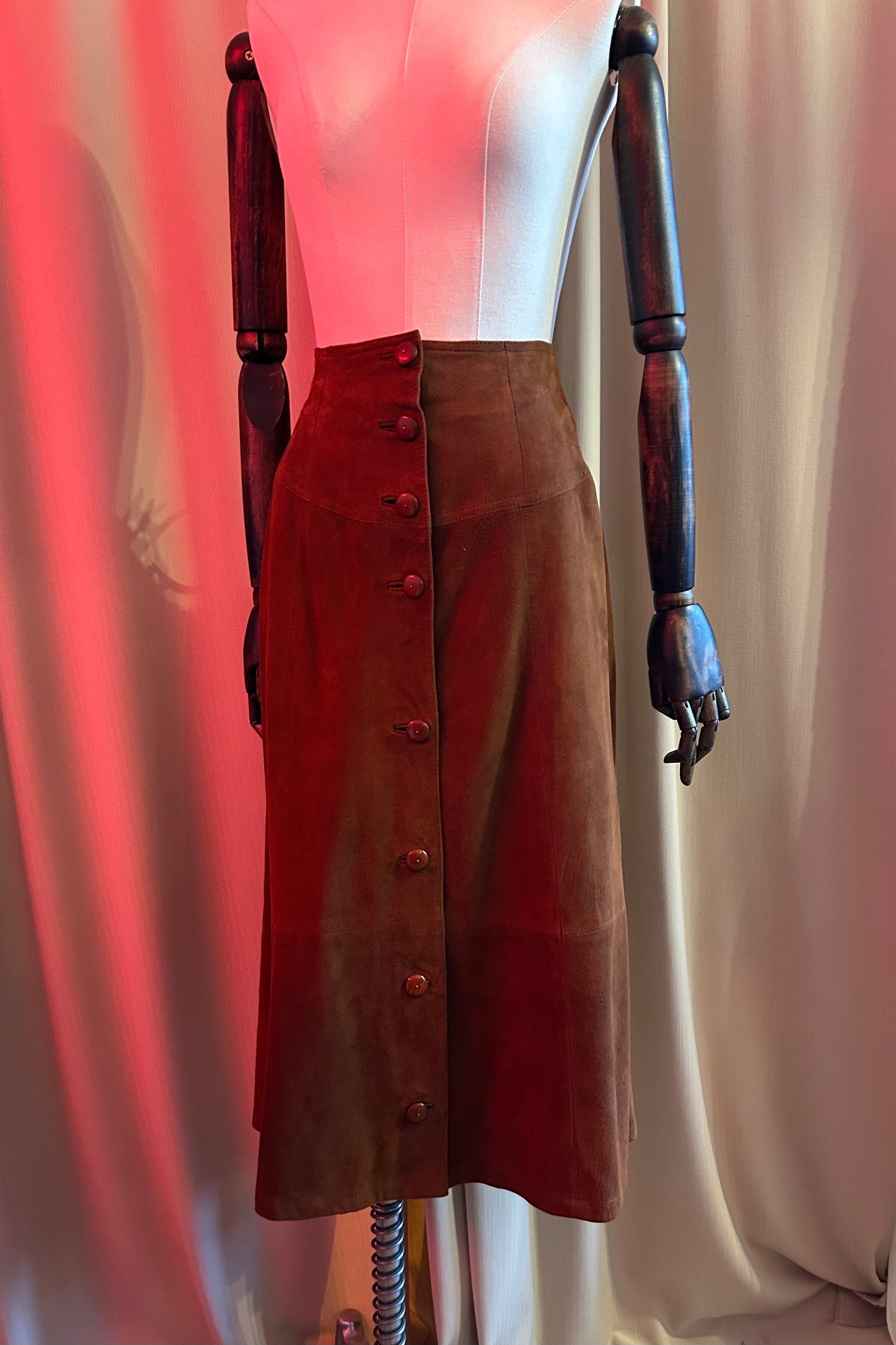 100% suede leather skirt with a nice swing to it! Buttons all down front. Probably from the 90s.