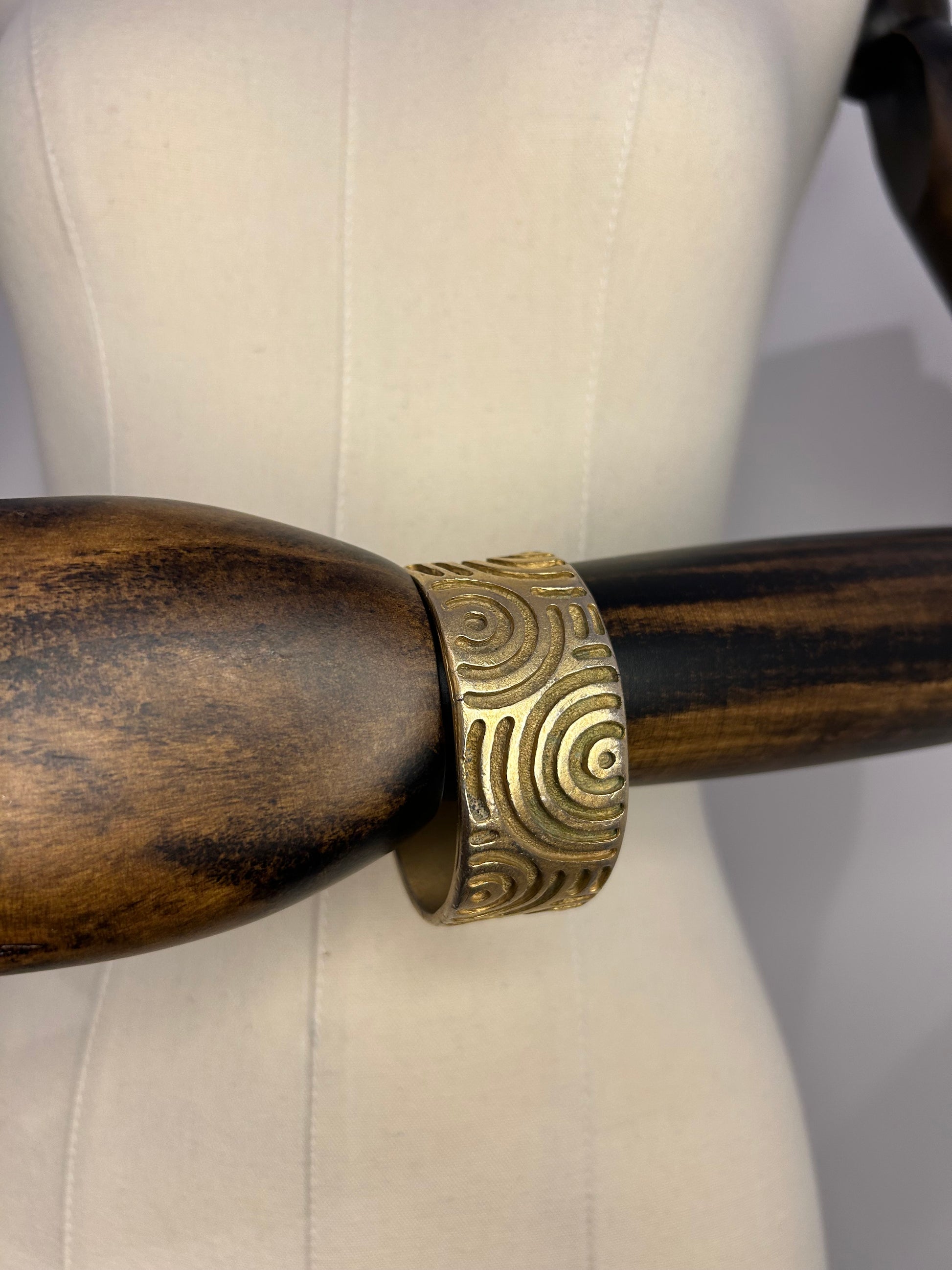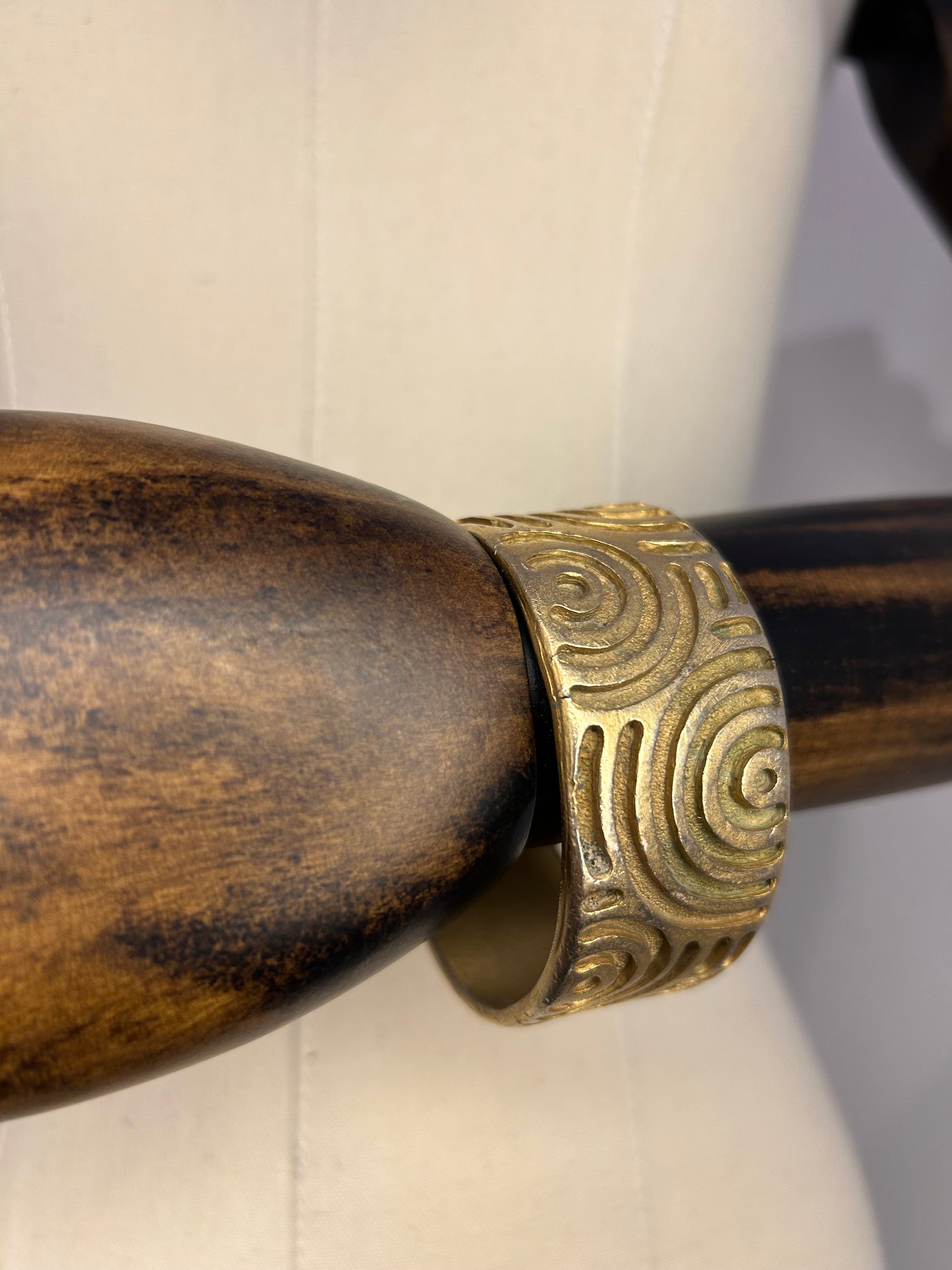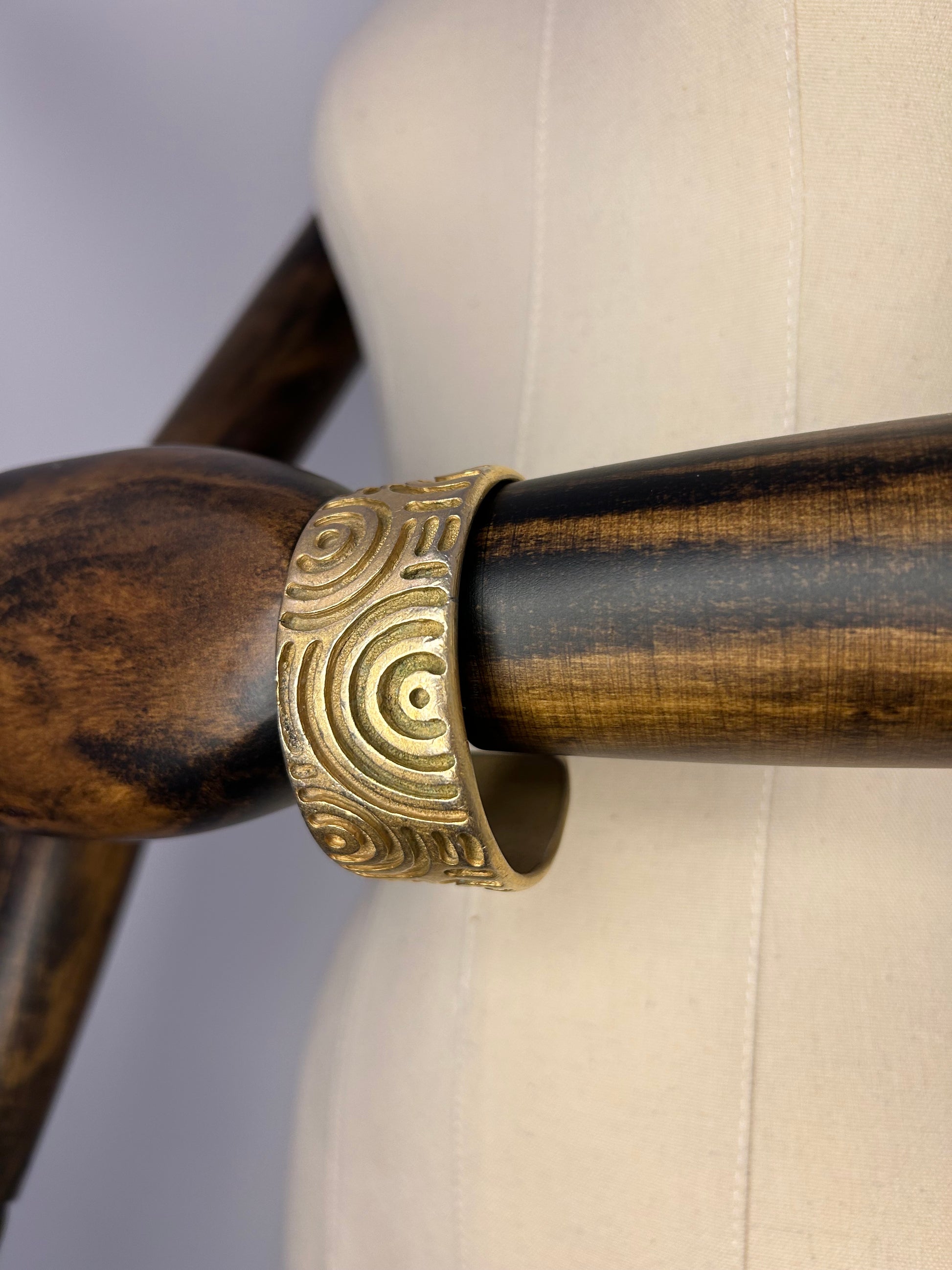 1980s Per Spook bangle with gold tone swirls embossed in. Worn over the years with a few defects as shown in photos, slight cracking on inside