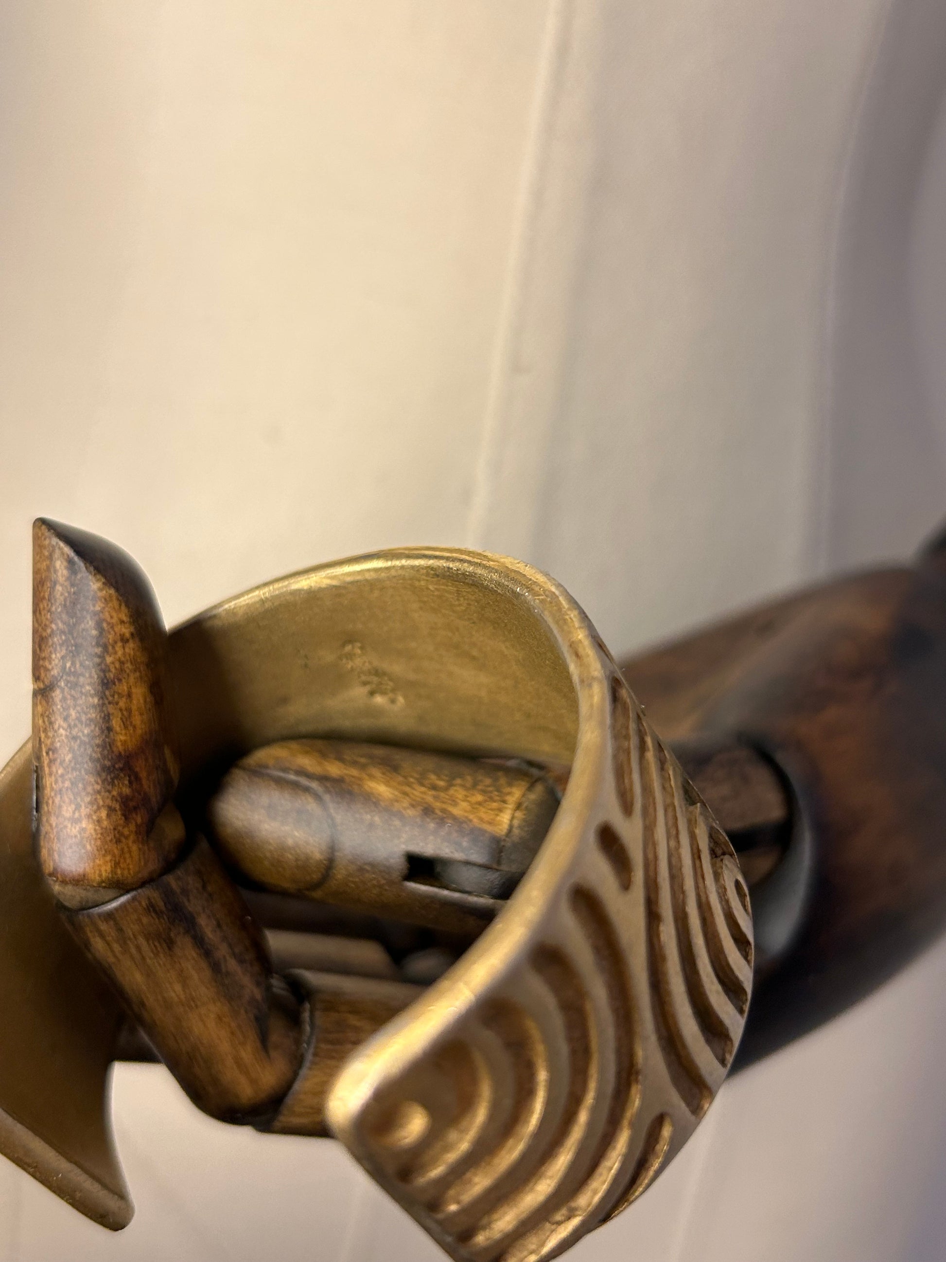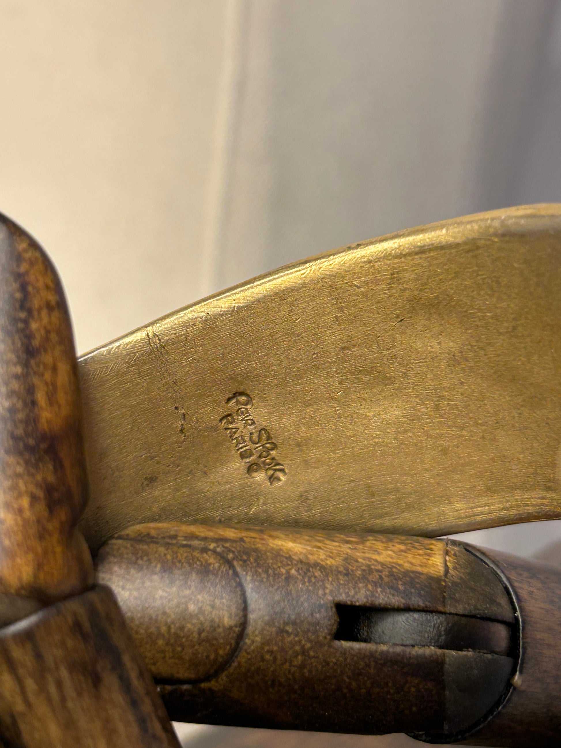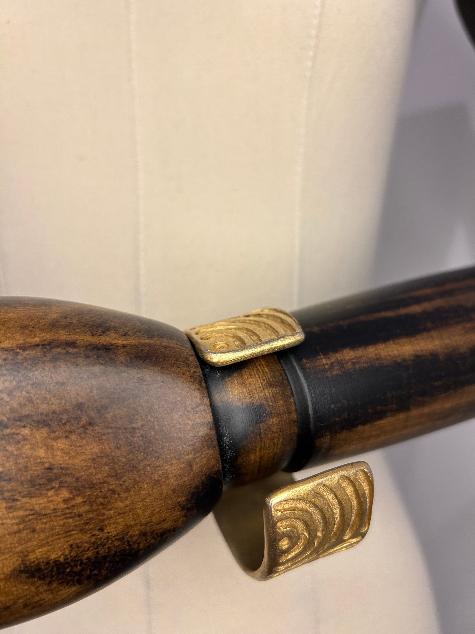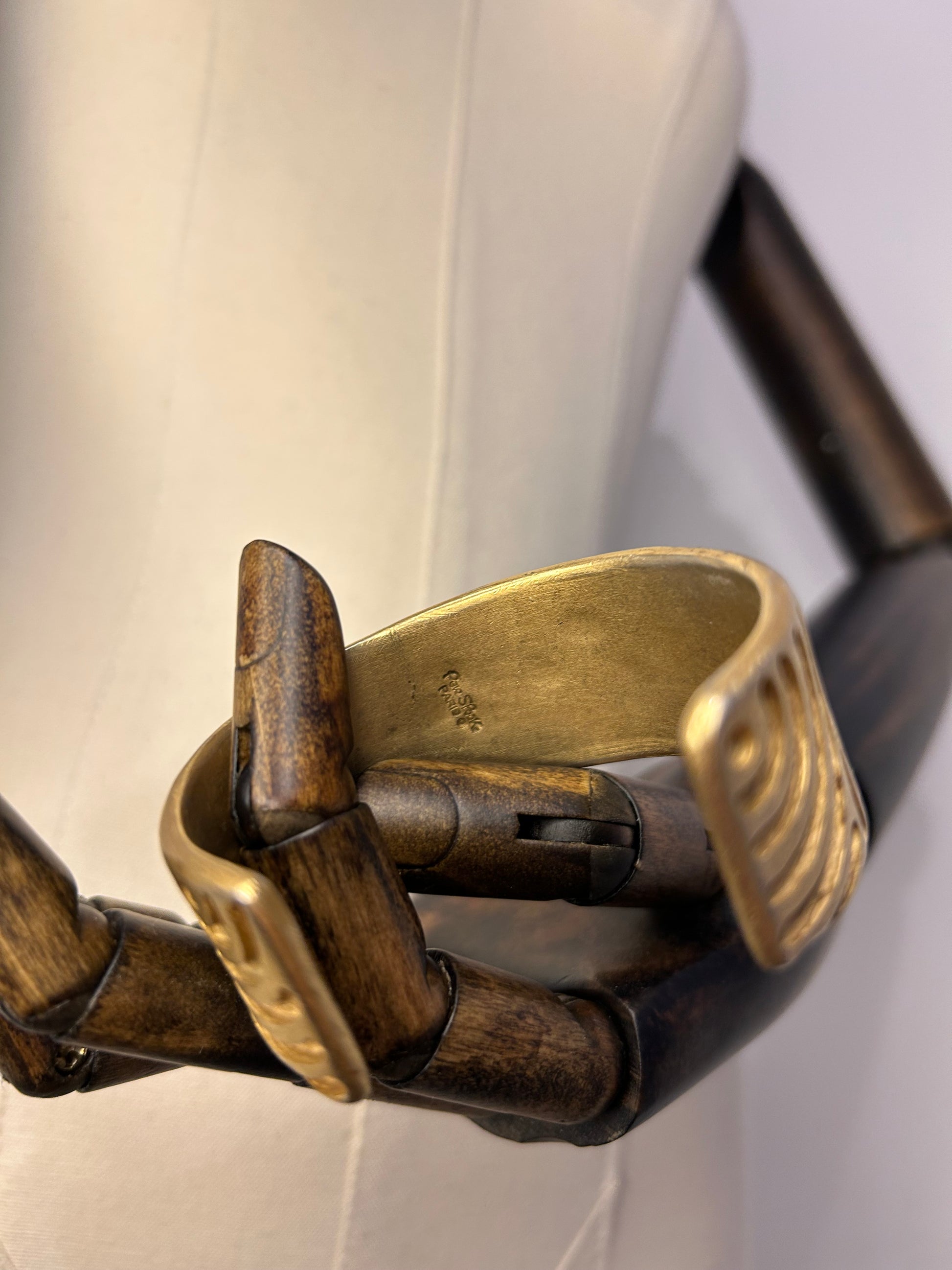 1980s Per Spook bangle with gold tone swirls embossed in. Worn over the years with a few defects as shown in photos, slight cracking on inside