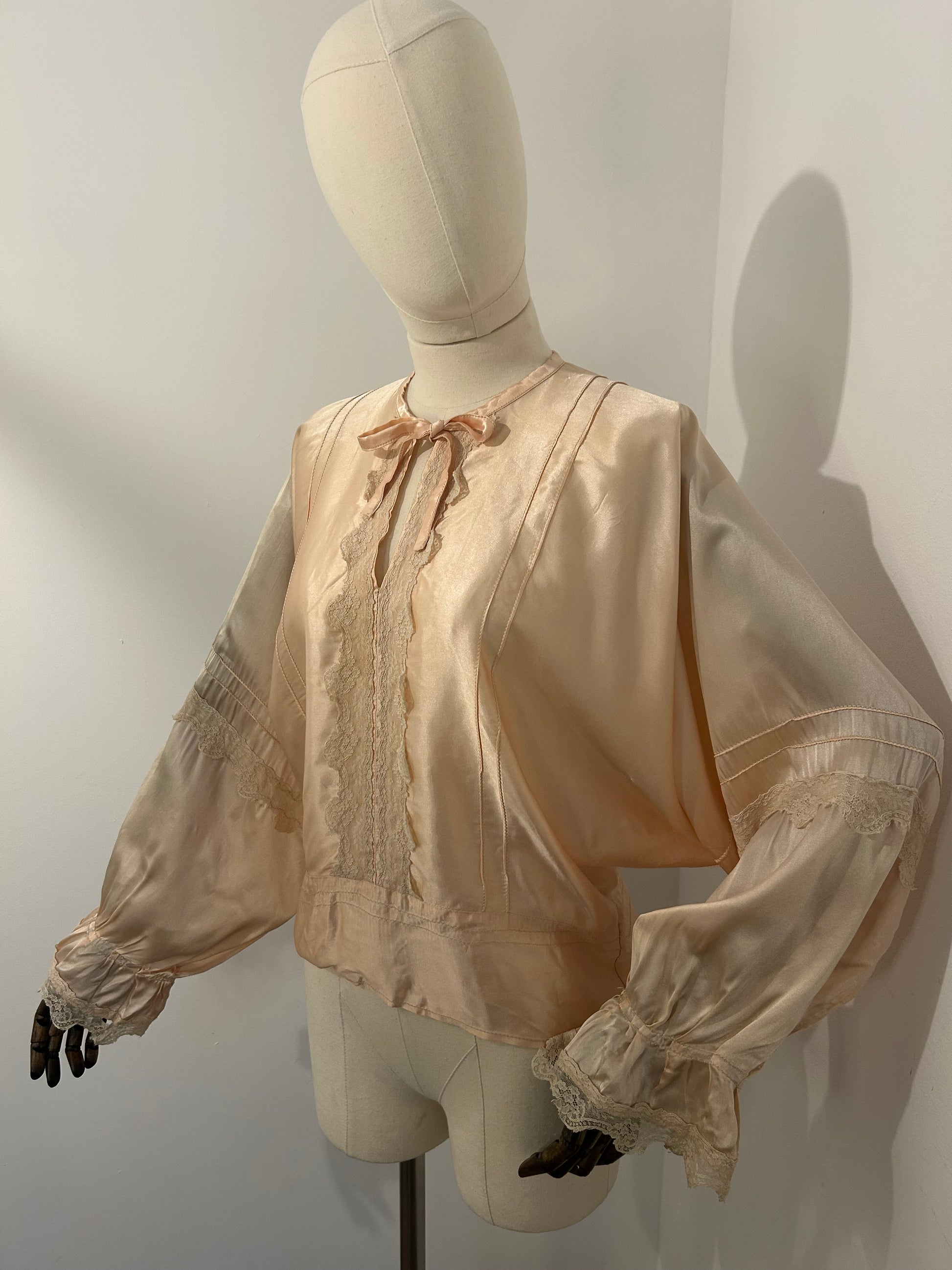 1940s dusty pink silk satin balloon sleeve blouse with lace trim details. please see photos as due to age there is some issues