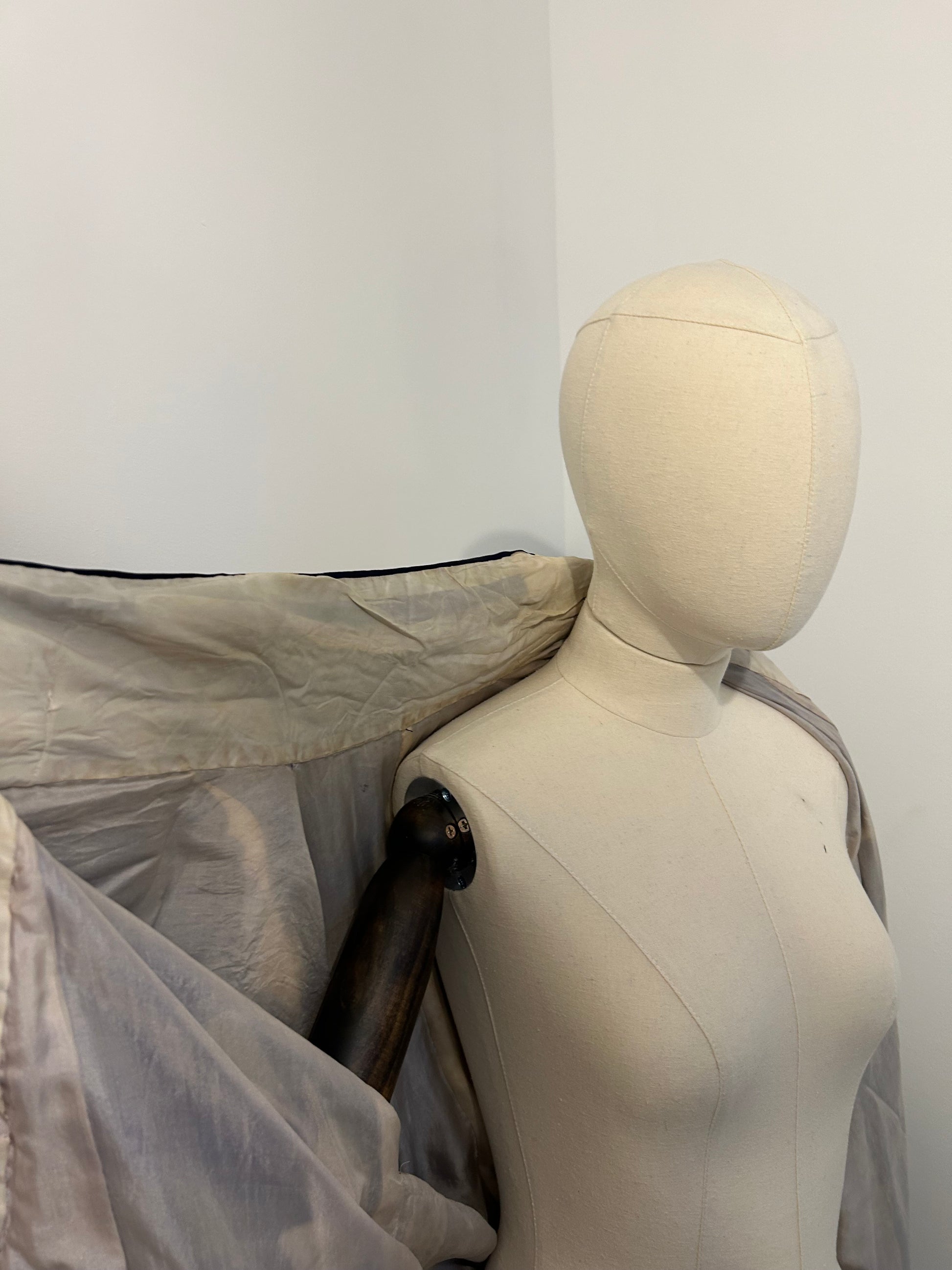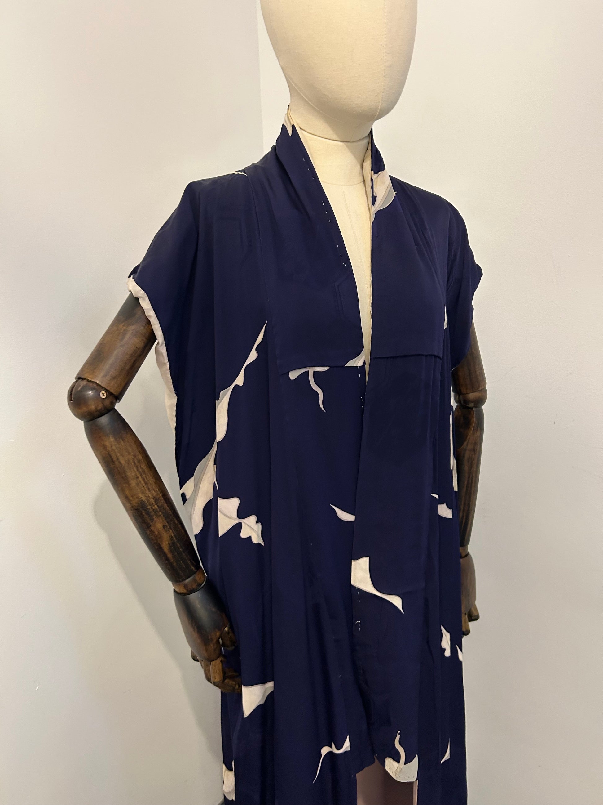 Sleeveless pure silk kimono style jacket with blue background and white fluid design