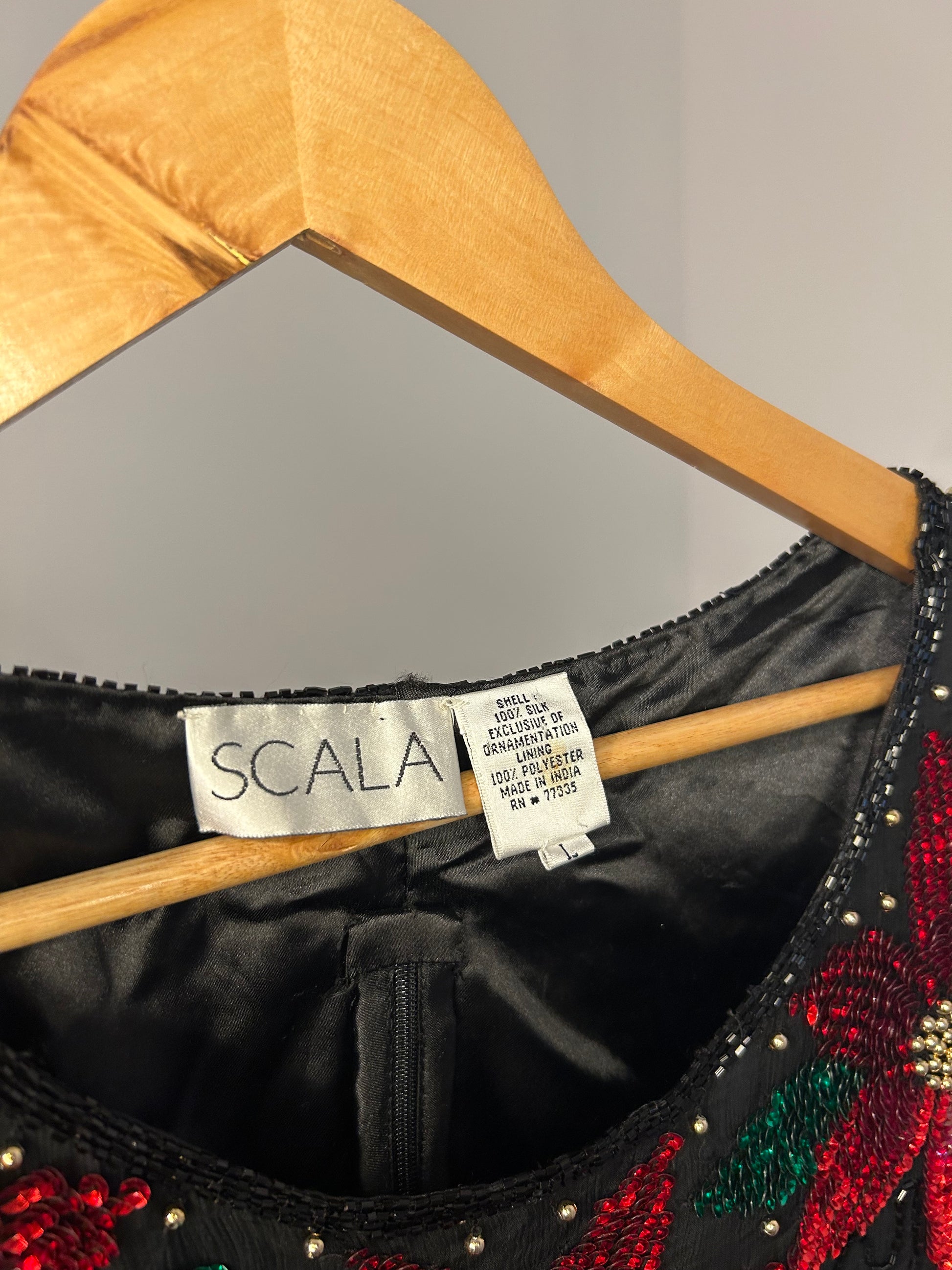 Sequin black with poinsettia flower detail all over. Zip up from the hem and stops an inch or so before the neckline.