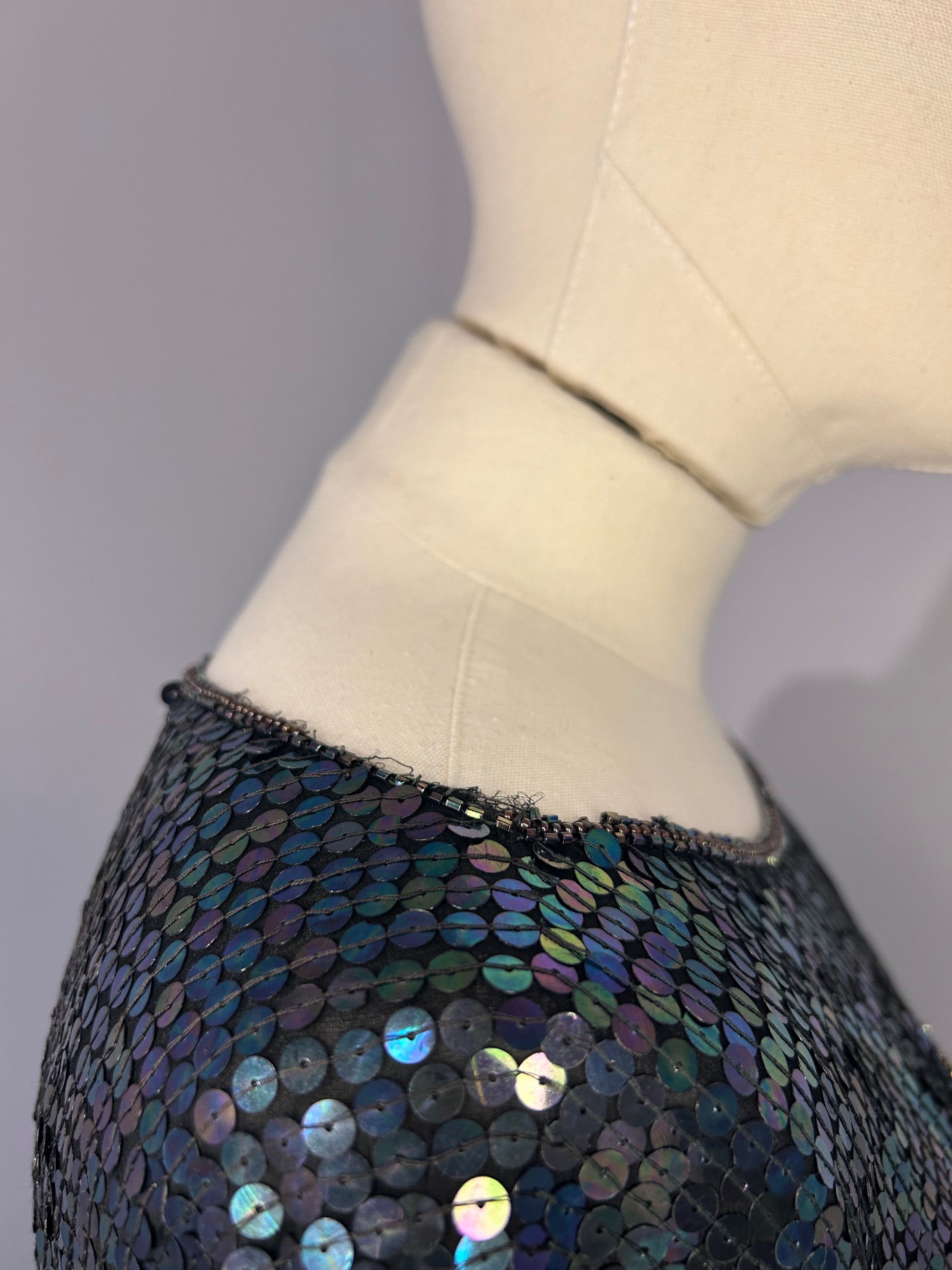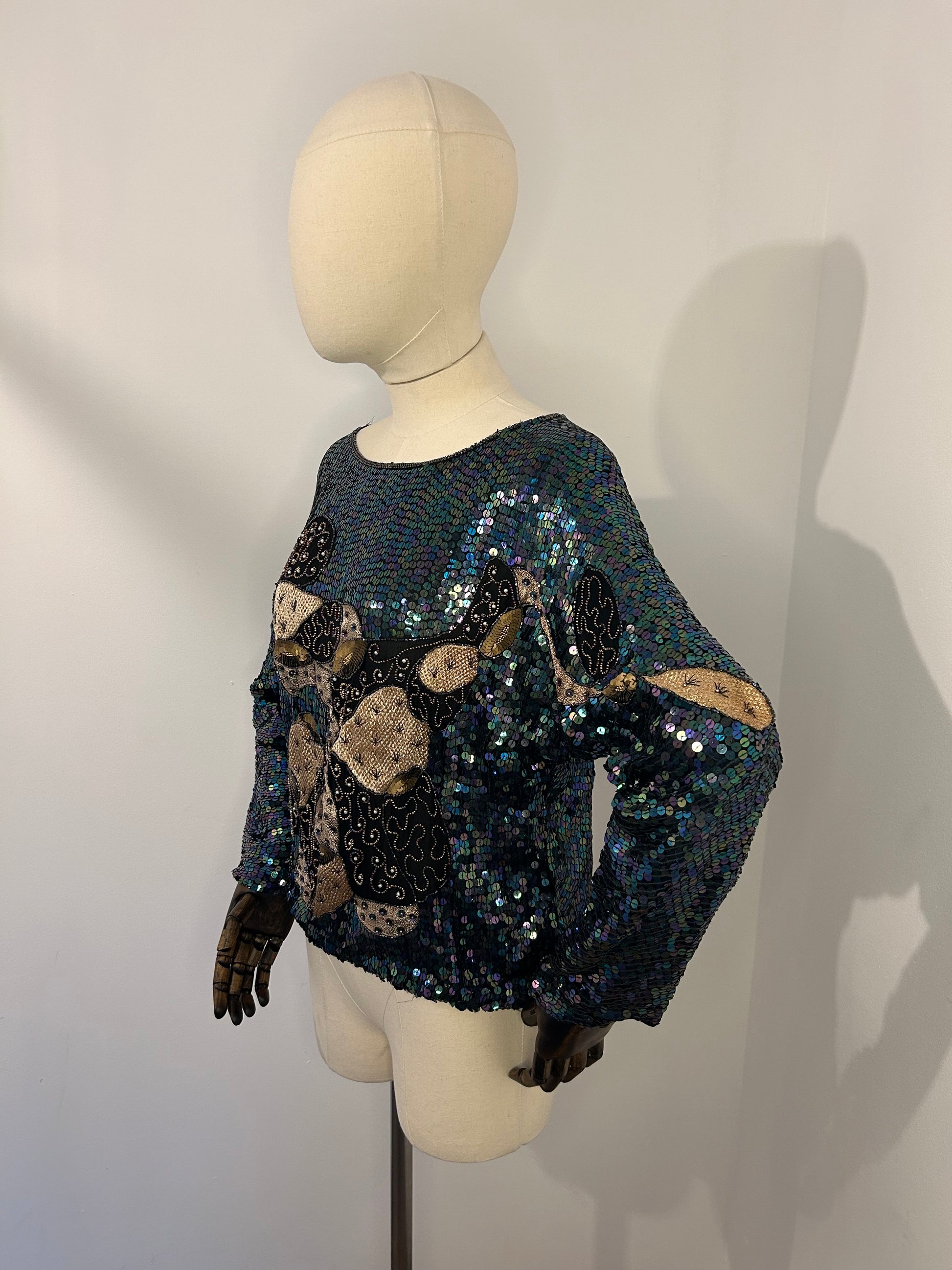 Sequin navy / iridescent top with gold detail across the front. Elastic waist to give it a balloon effect with the slight balloon long sleeve