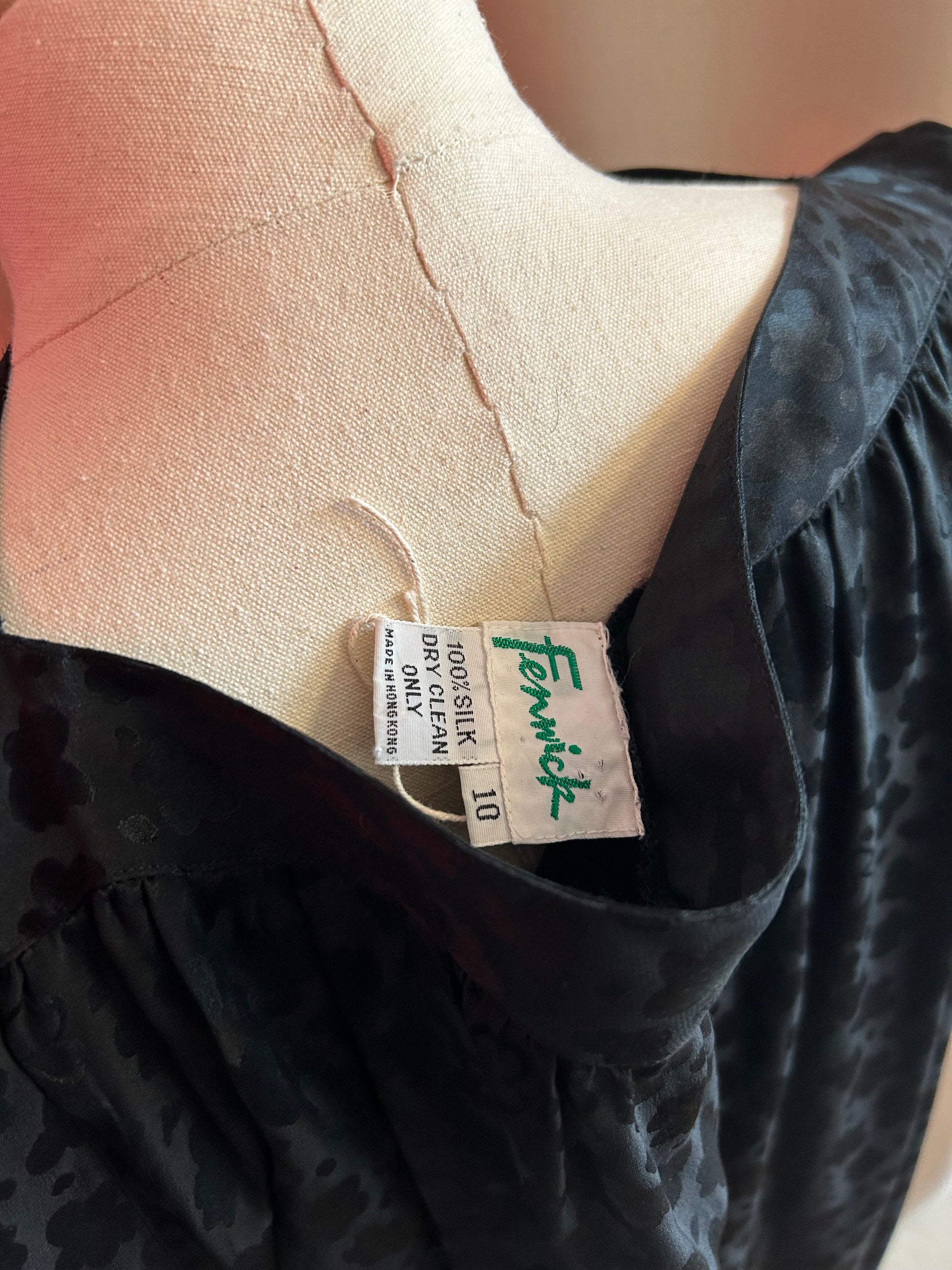 Pure silk black printed Fenwick dress with drop waist and tie detail and shoulder detail to make the neckline amazing
