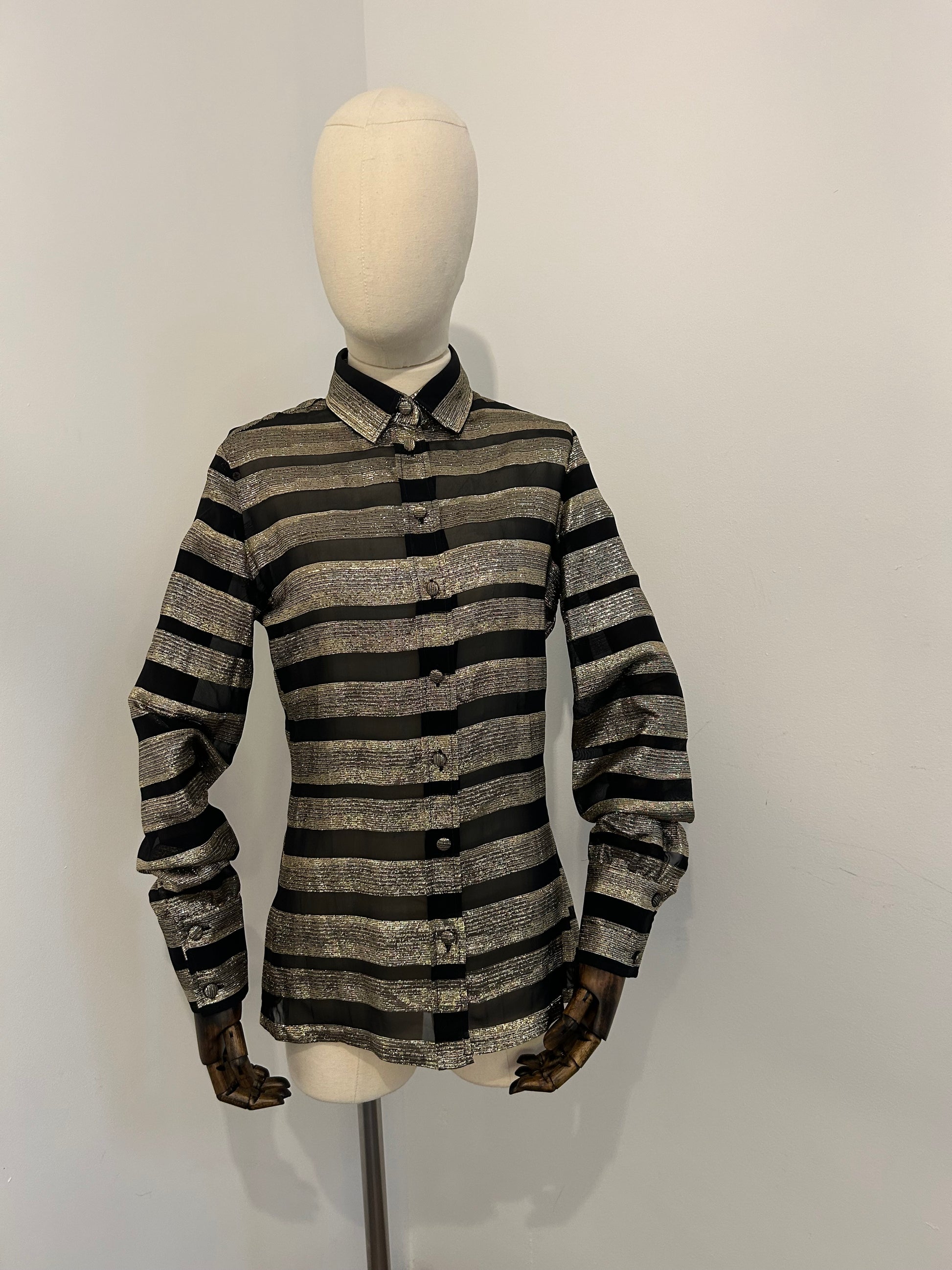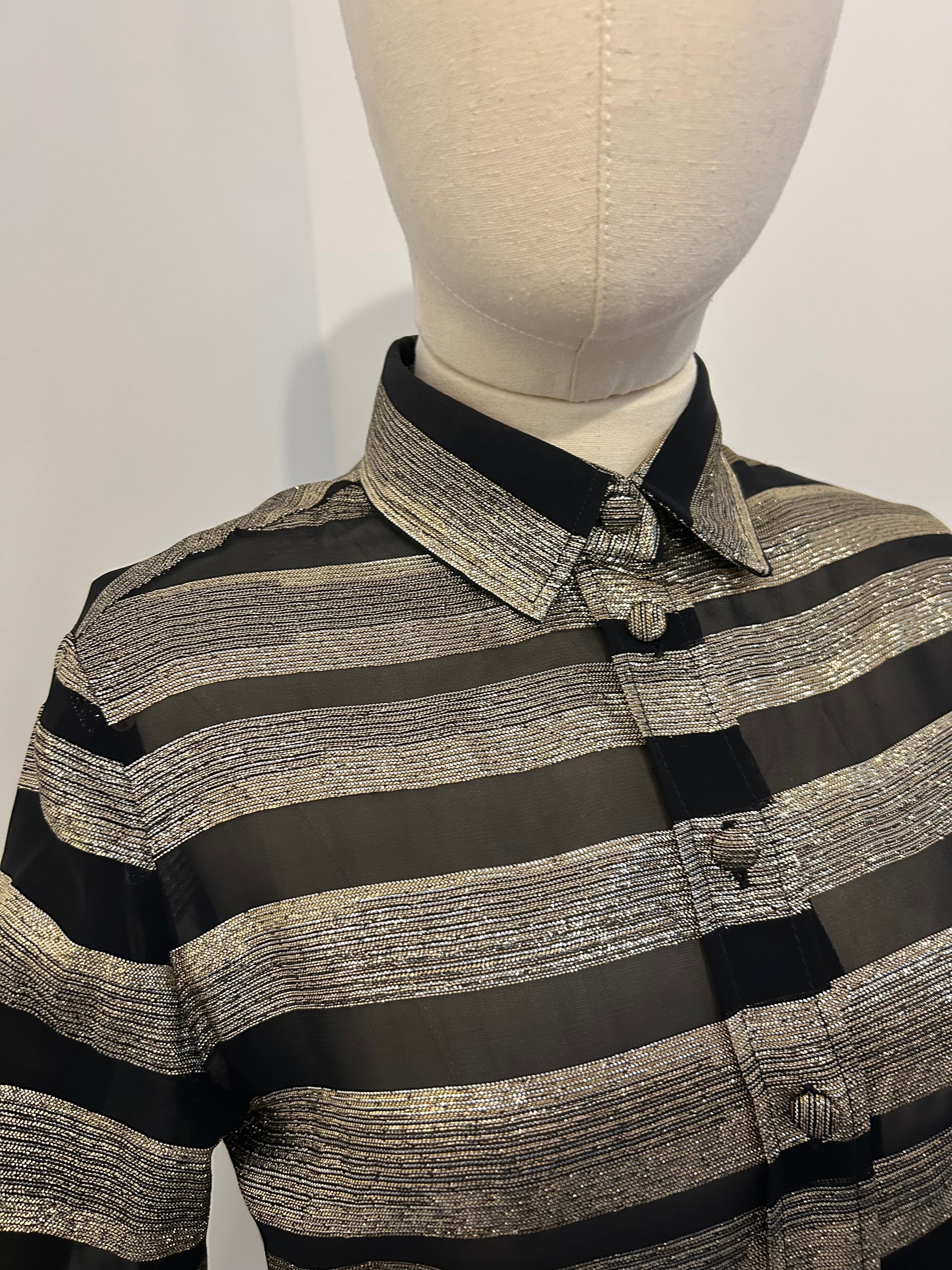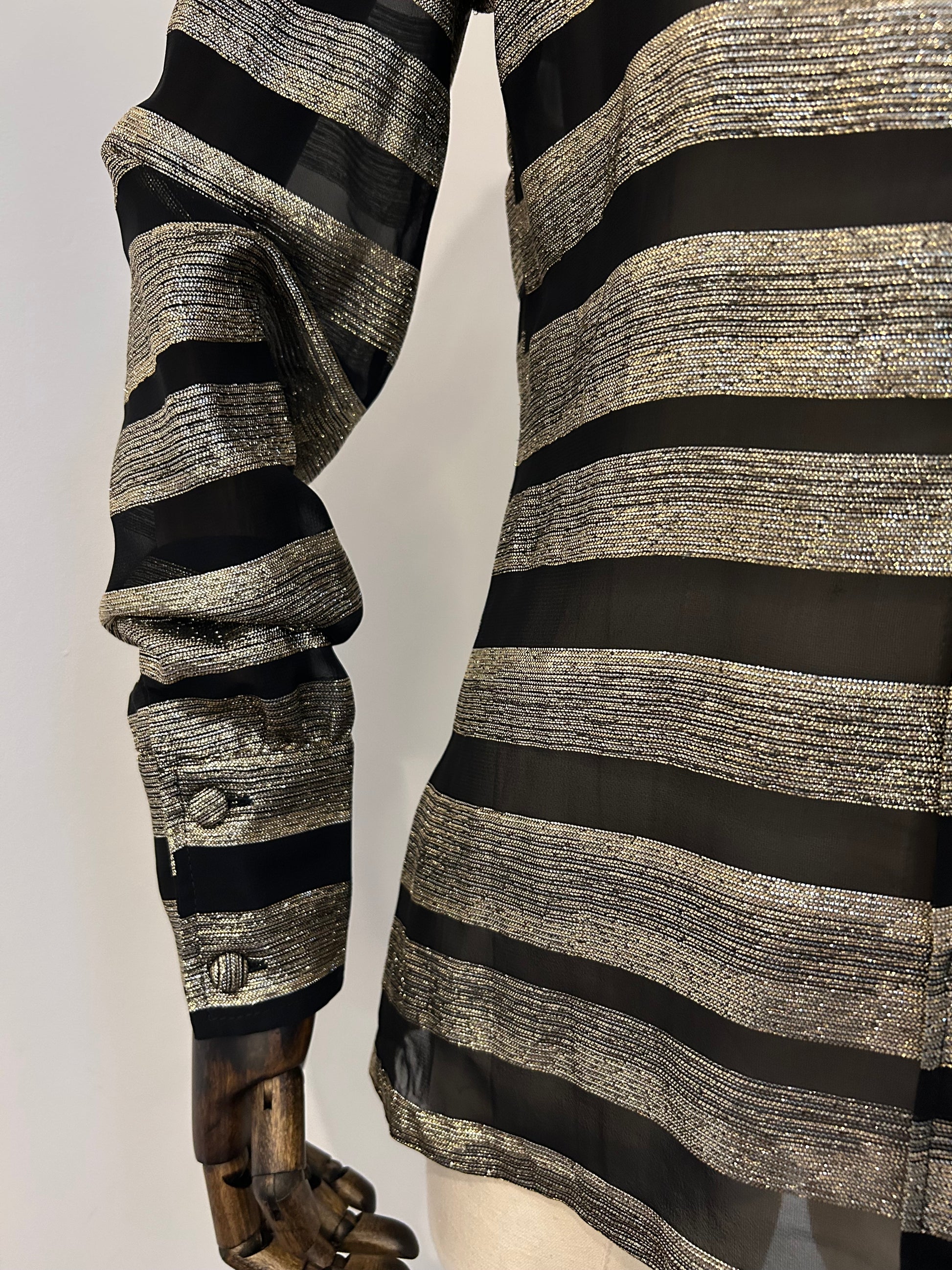 Gold lamè striped shirt semi sheer with black contrasting panels