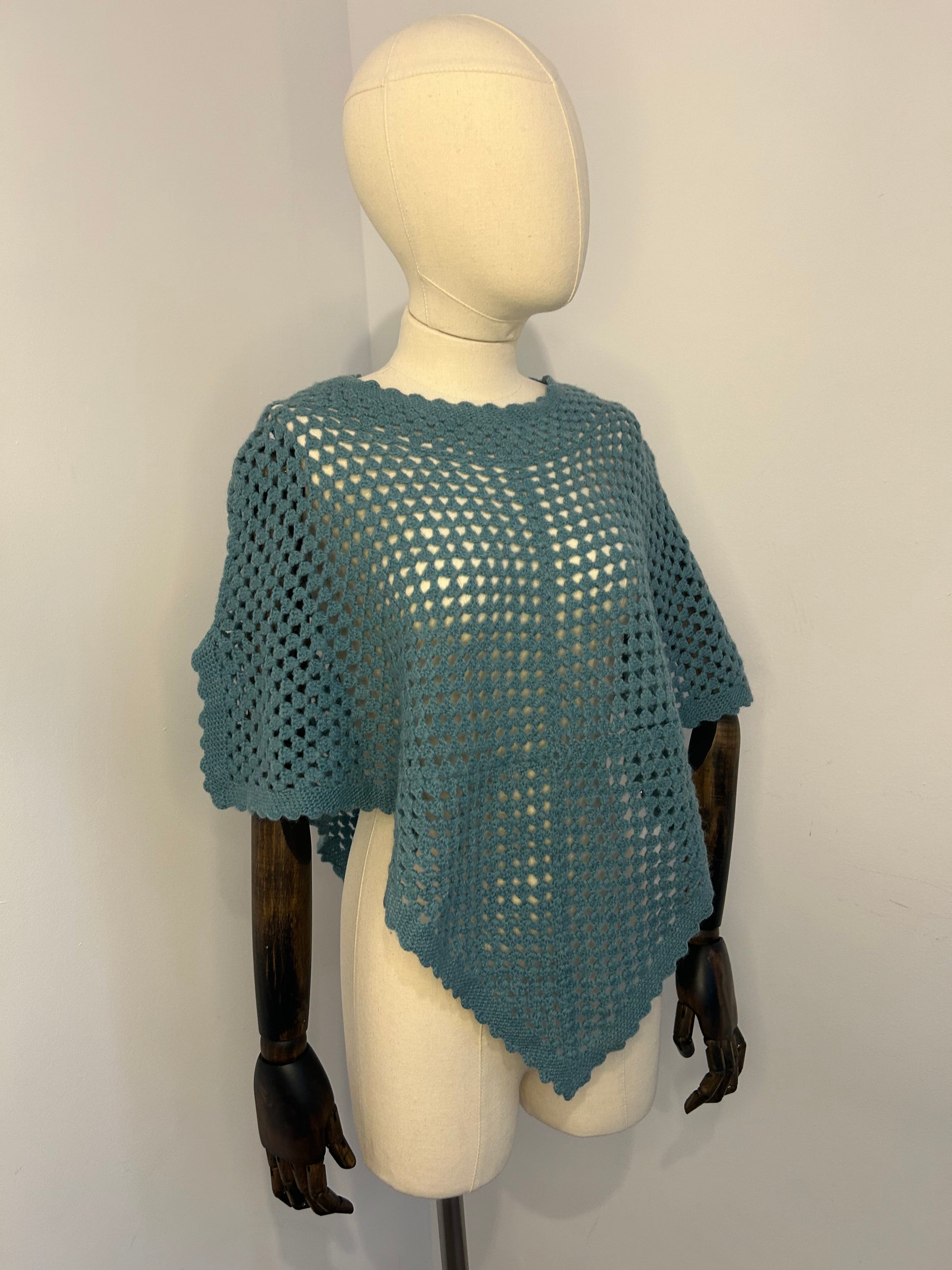 Hand crochet teal / seafoam shoulder cape. Small detail on sides where arms would be
