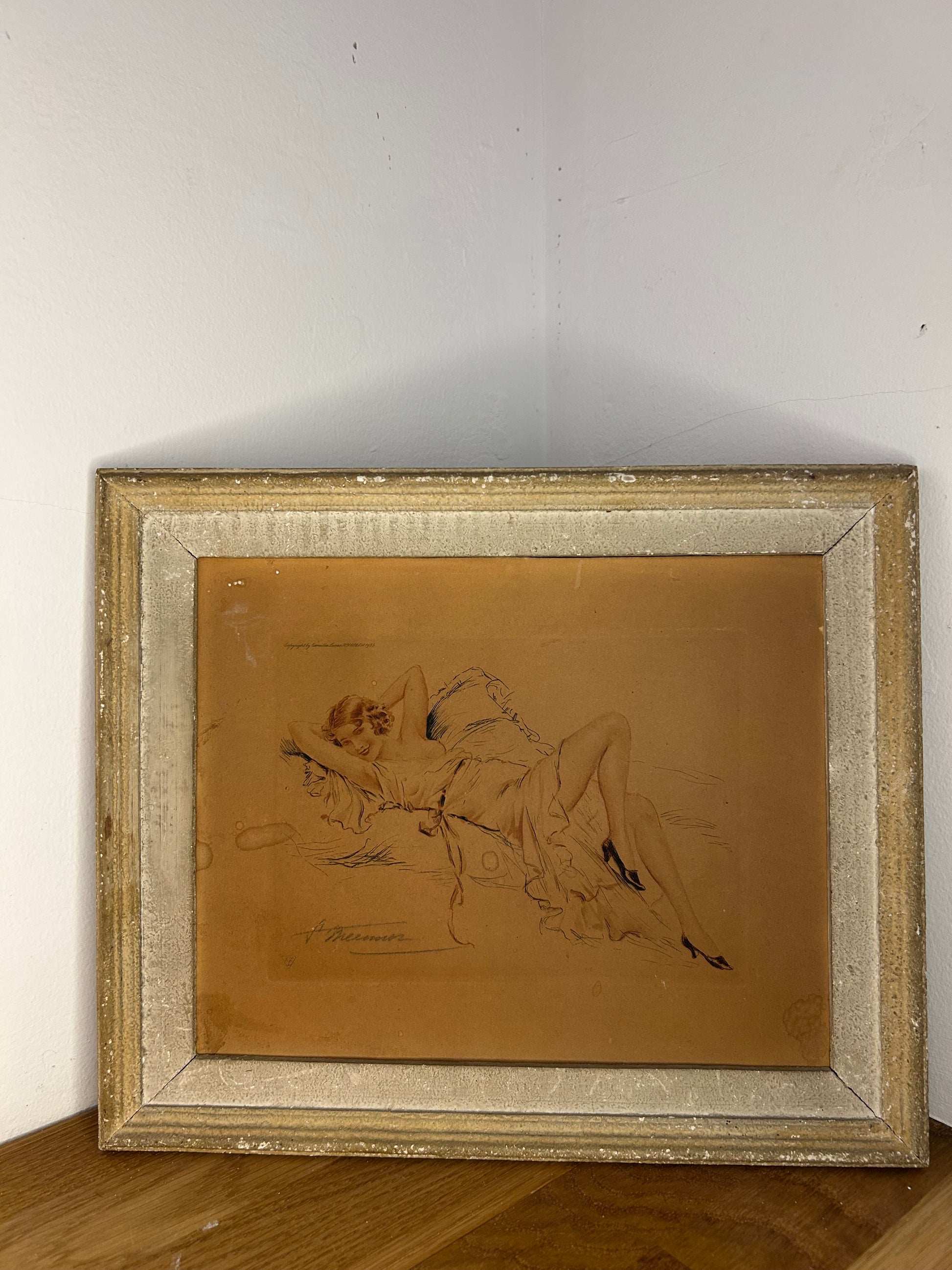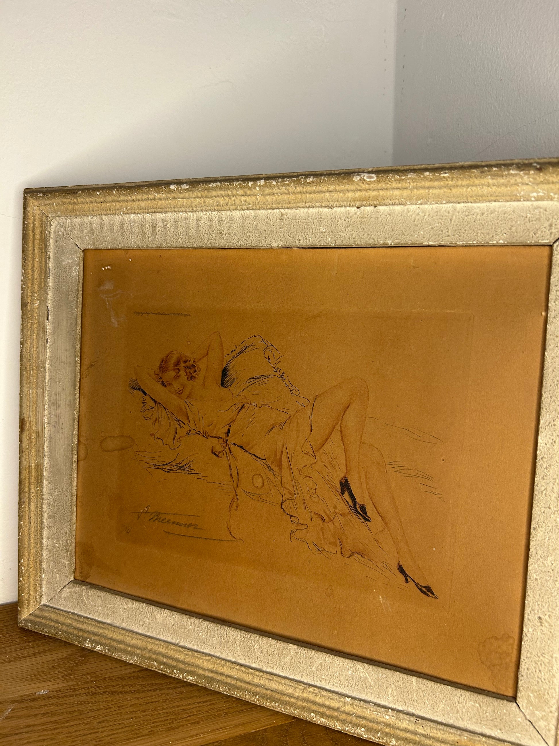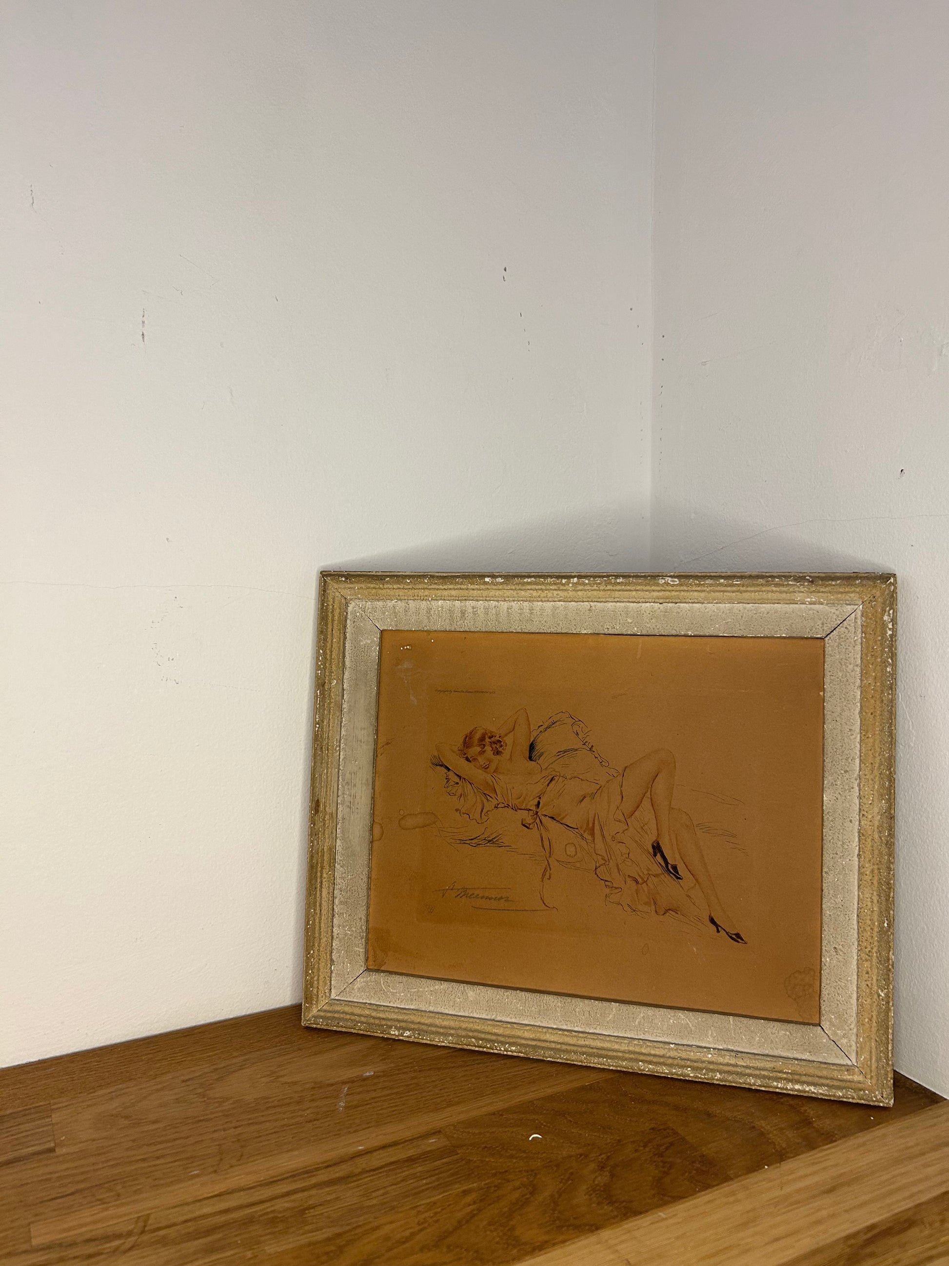 Found in Marseille, France. A reclining French lady draws you in. No glass but in original frame. Some marks and not pristine however adds to her charm…she’s been around!