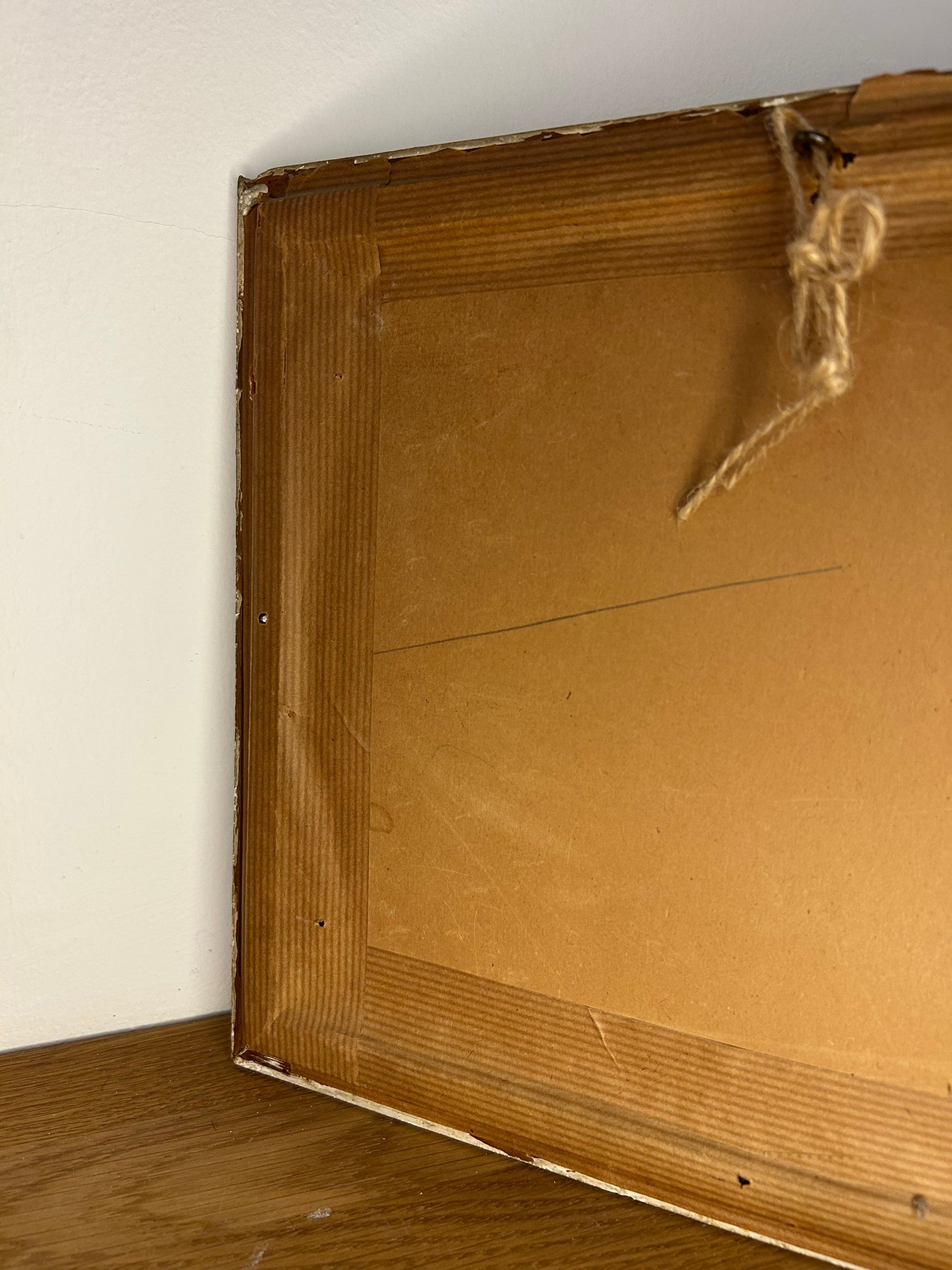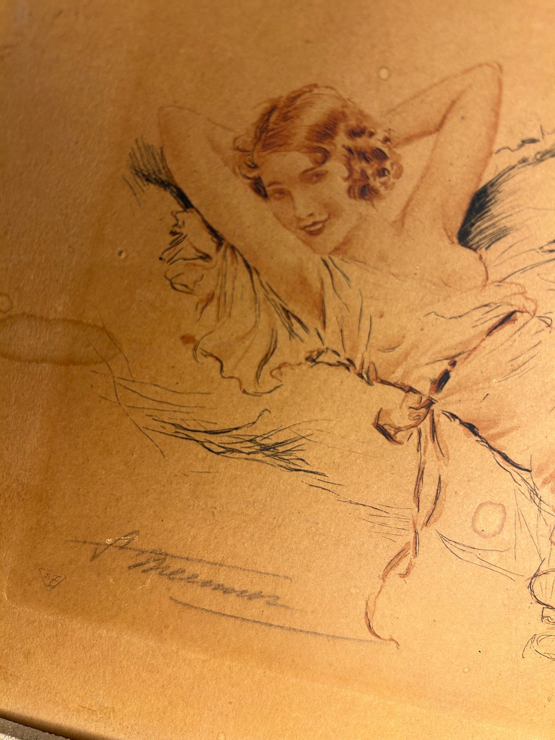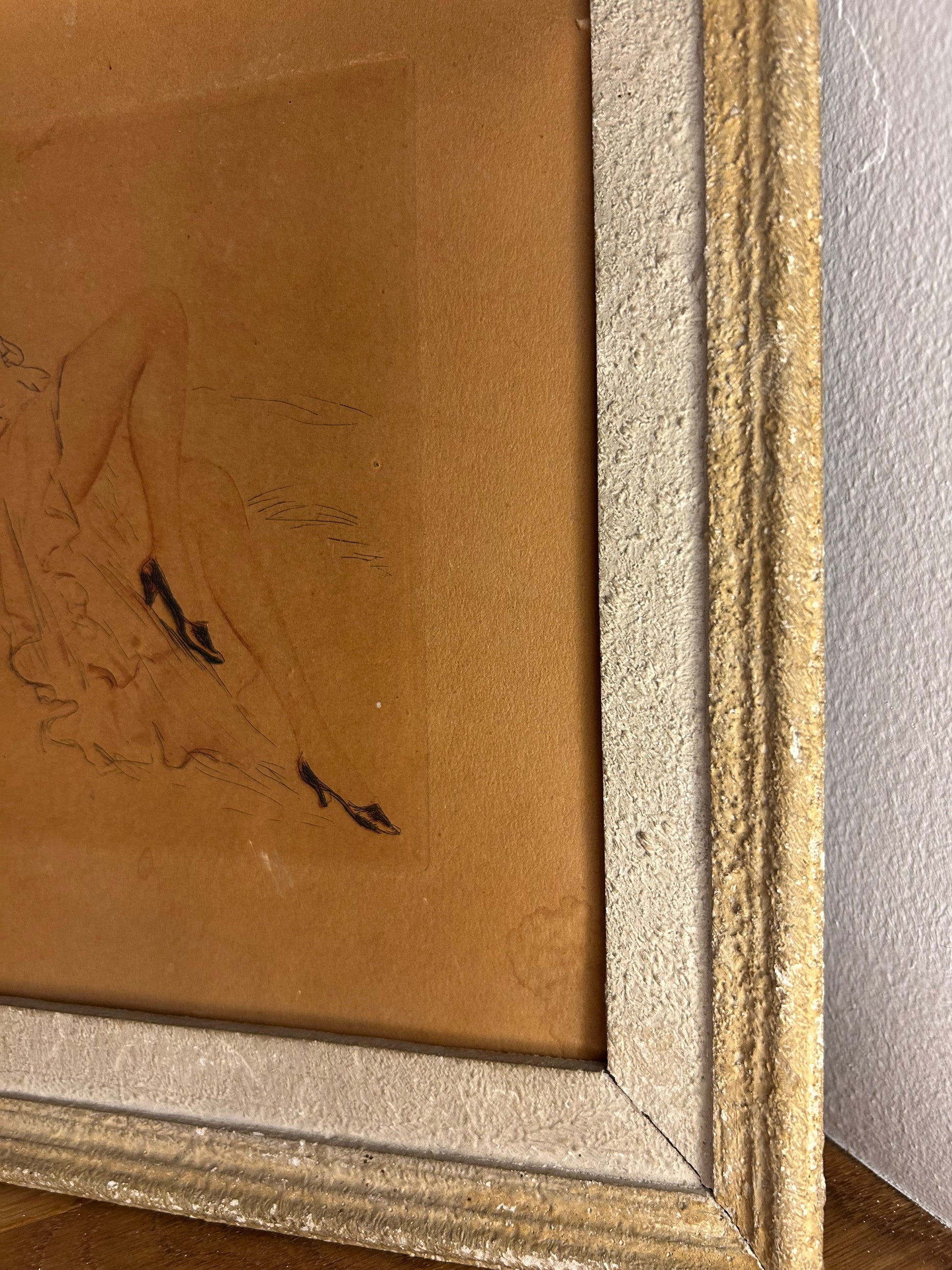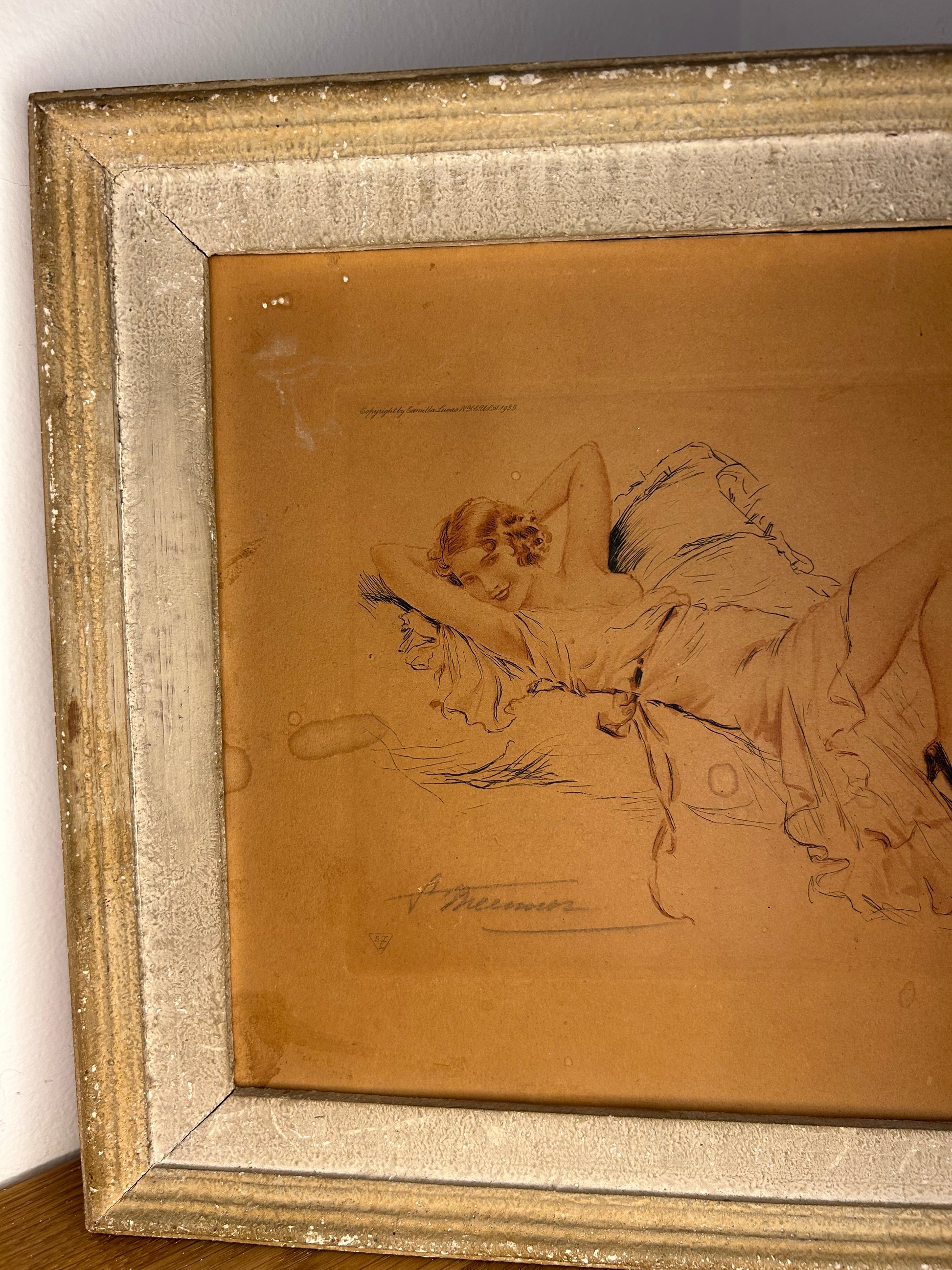 Found in Marseille, France. A reclining French lady draws you in. No glass but in original frame. Some marks and not pristine however adds to her charm…she’s been around!
