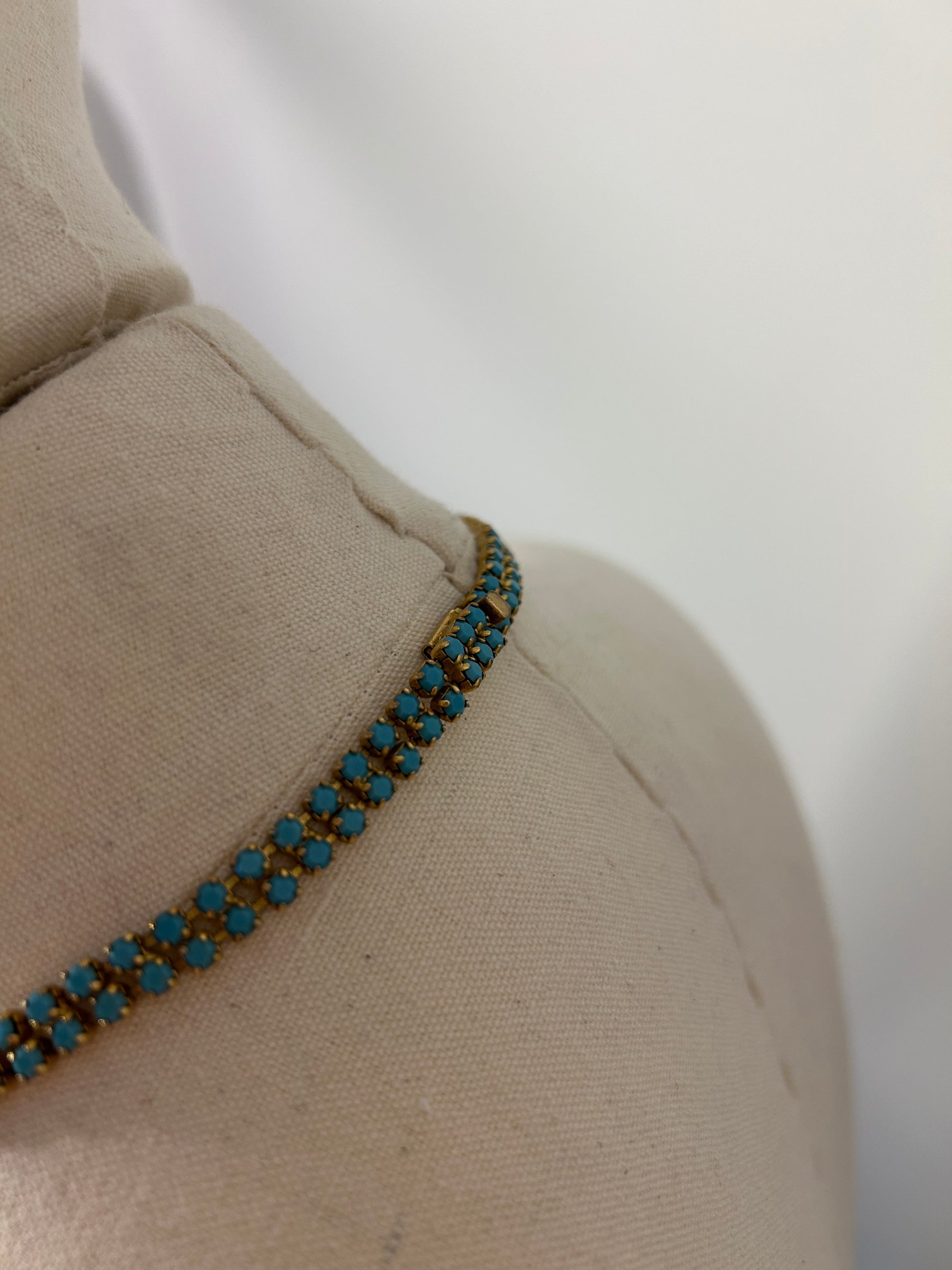 Simplistic necklace with faux turquoise stones all around, hidden clasp. Unsigned