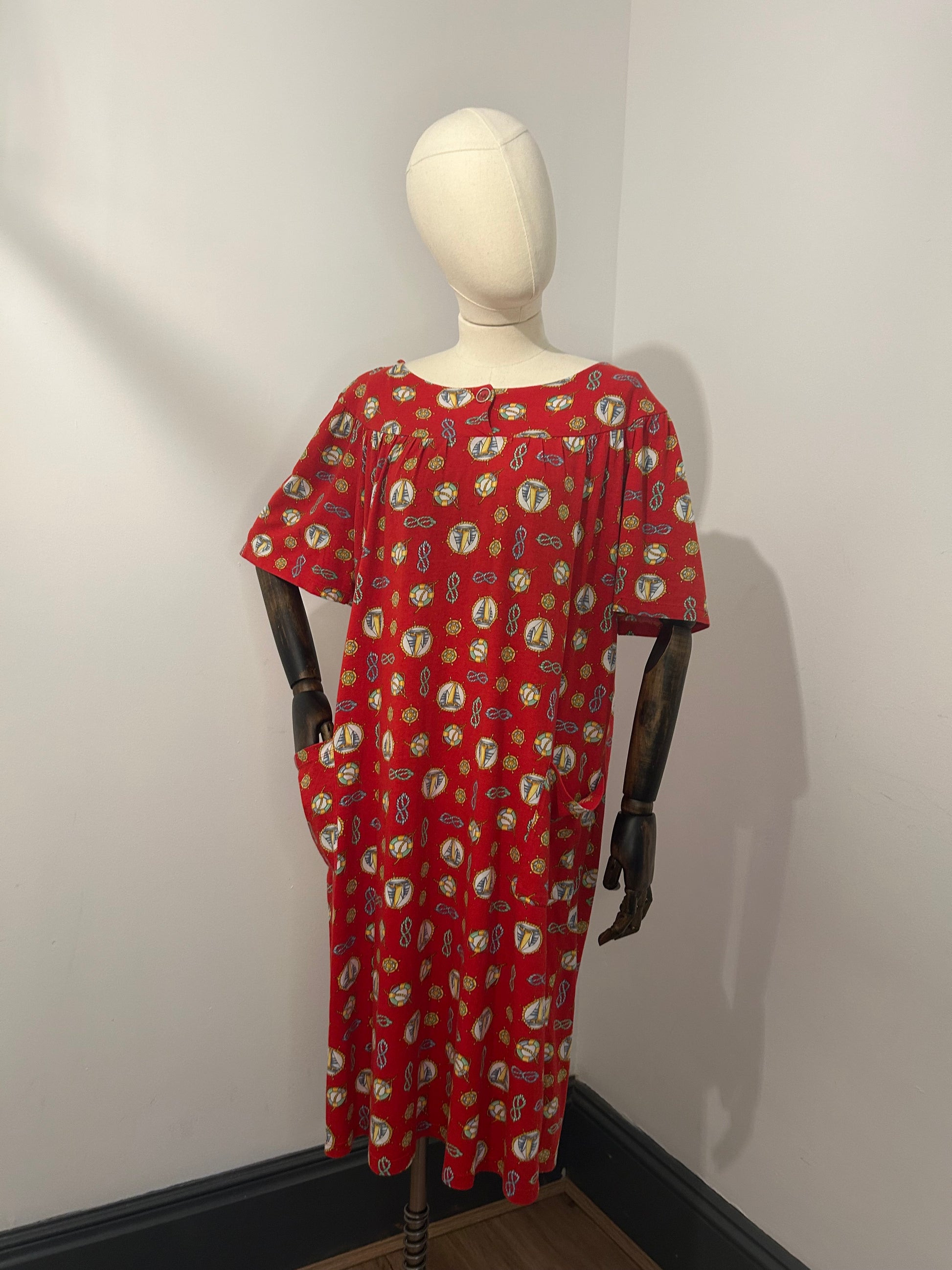 Red back ground with nautical motifs all over, two front pockets, a faux button detail on the neckline.