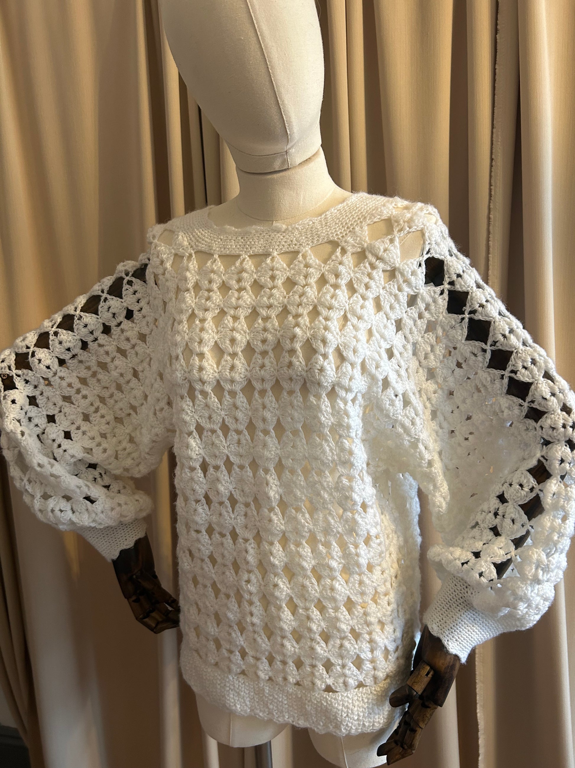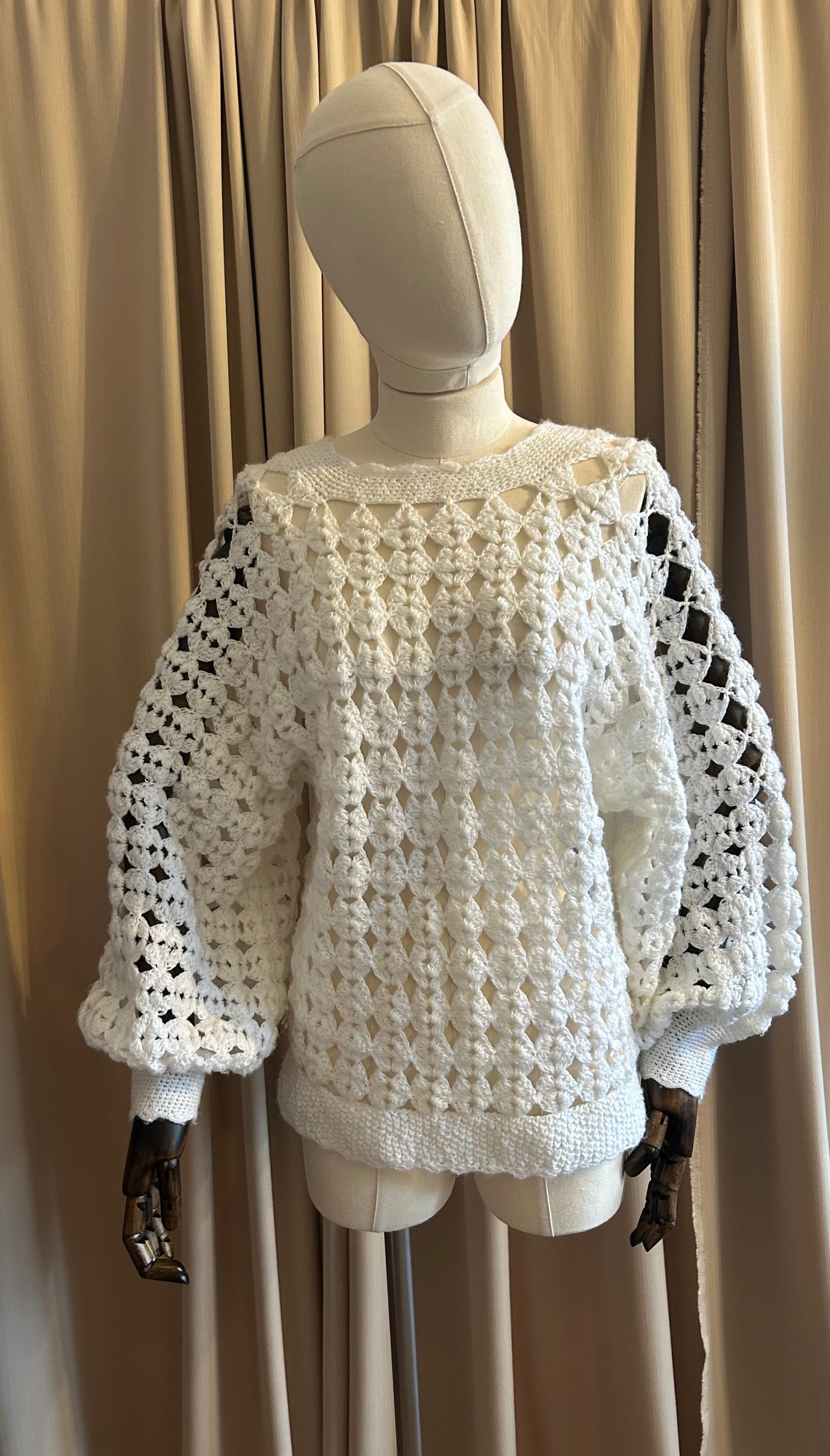 White puff sleeve balloon style jumper with open hand crochet knitting
