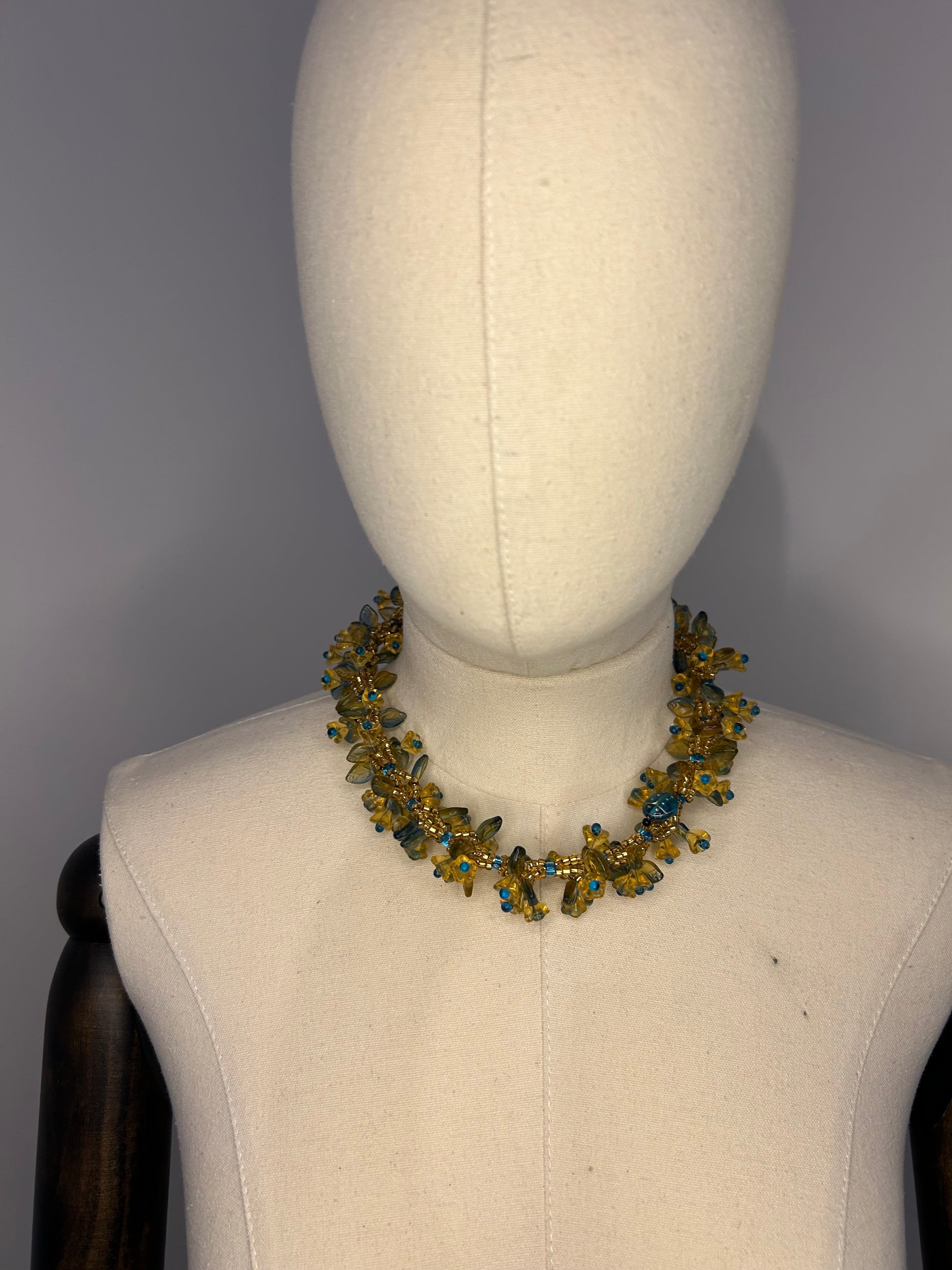 Yellow hand made beaded necklace with hidden blue bug. Vintage button closure