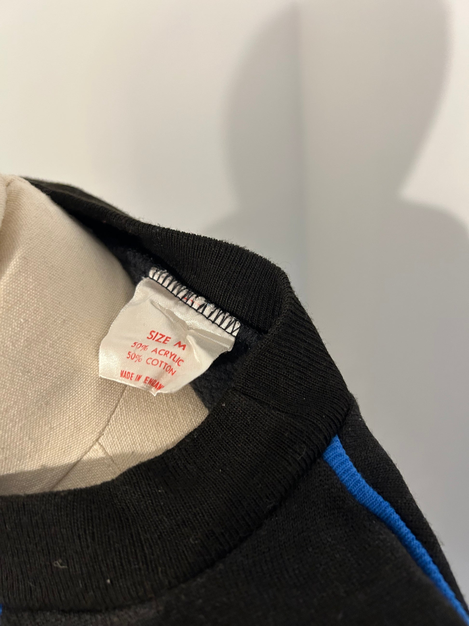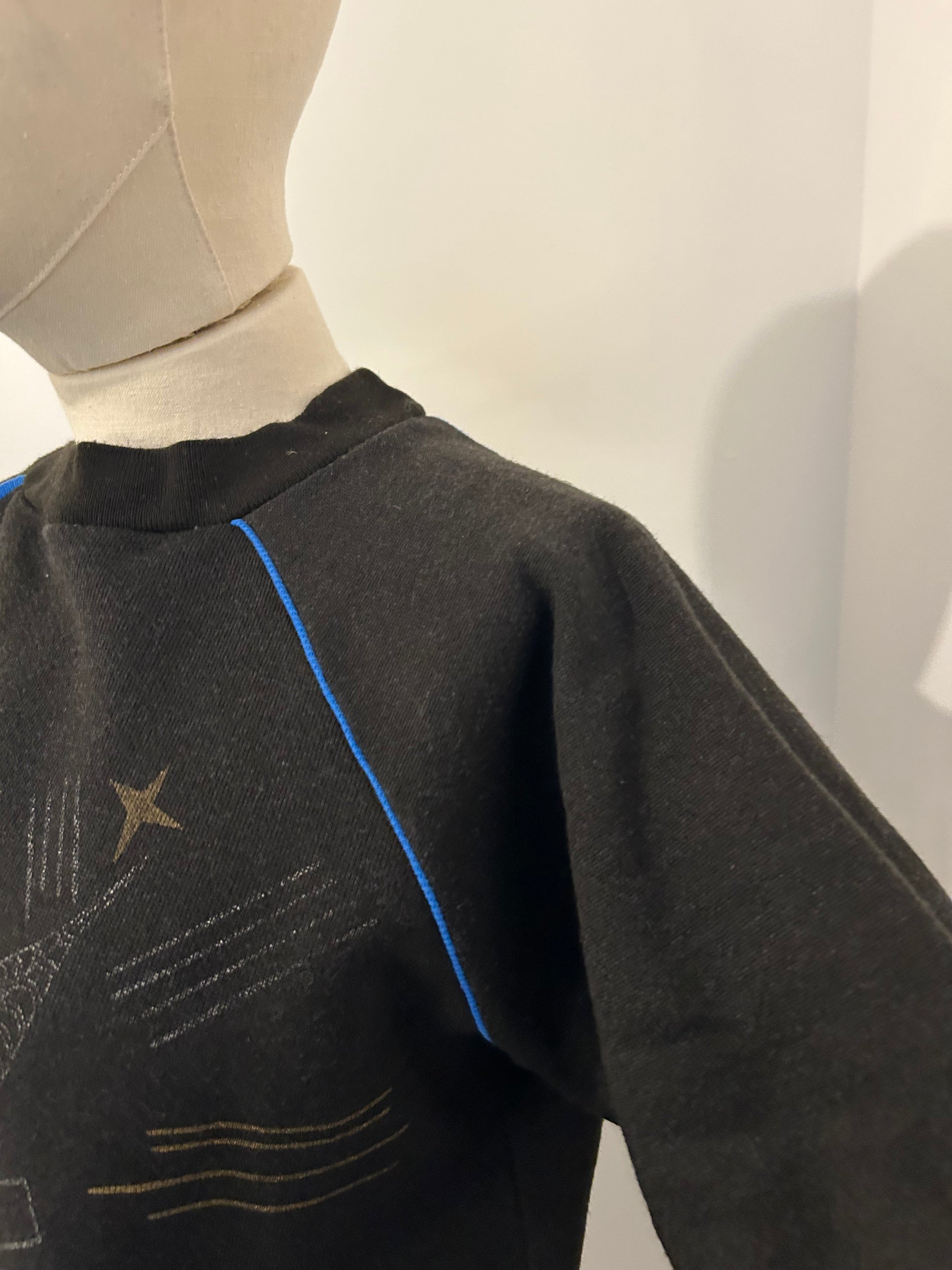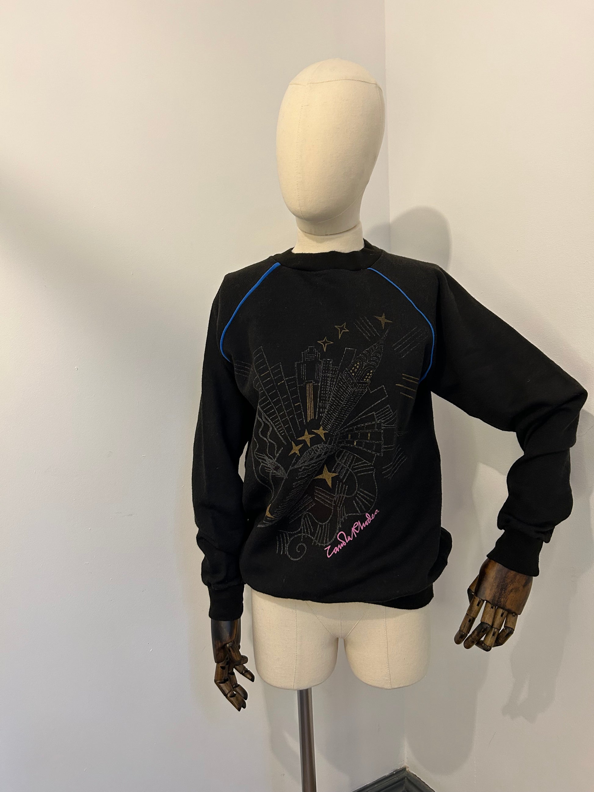 Zandra Rhodes black sweatshirt with blue piping detail and grey city scape. Signature in pink. No inside label only size label shown